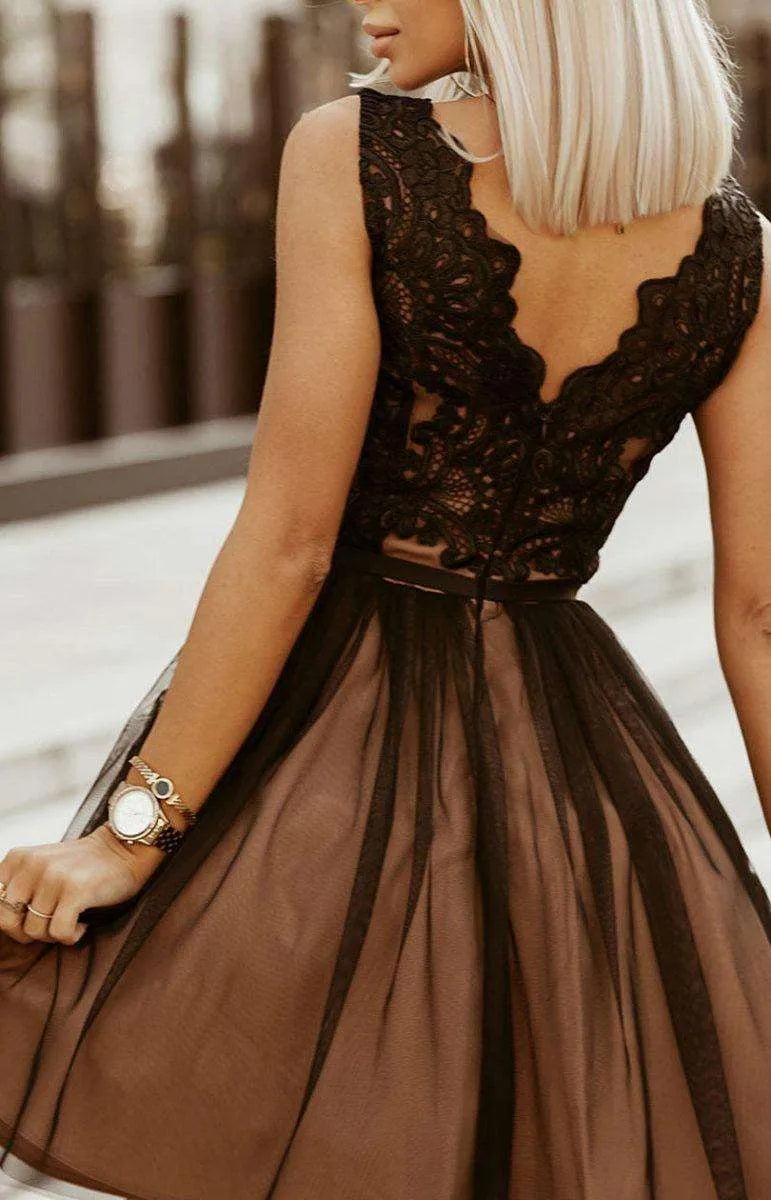 Abendkleid in Prinzessien Style mit ausgestellte Rock und Spitze am Oberteil.