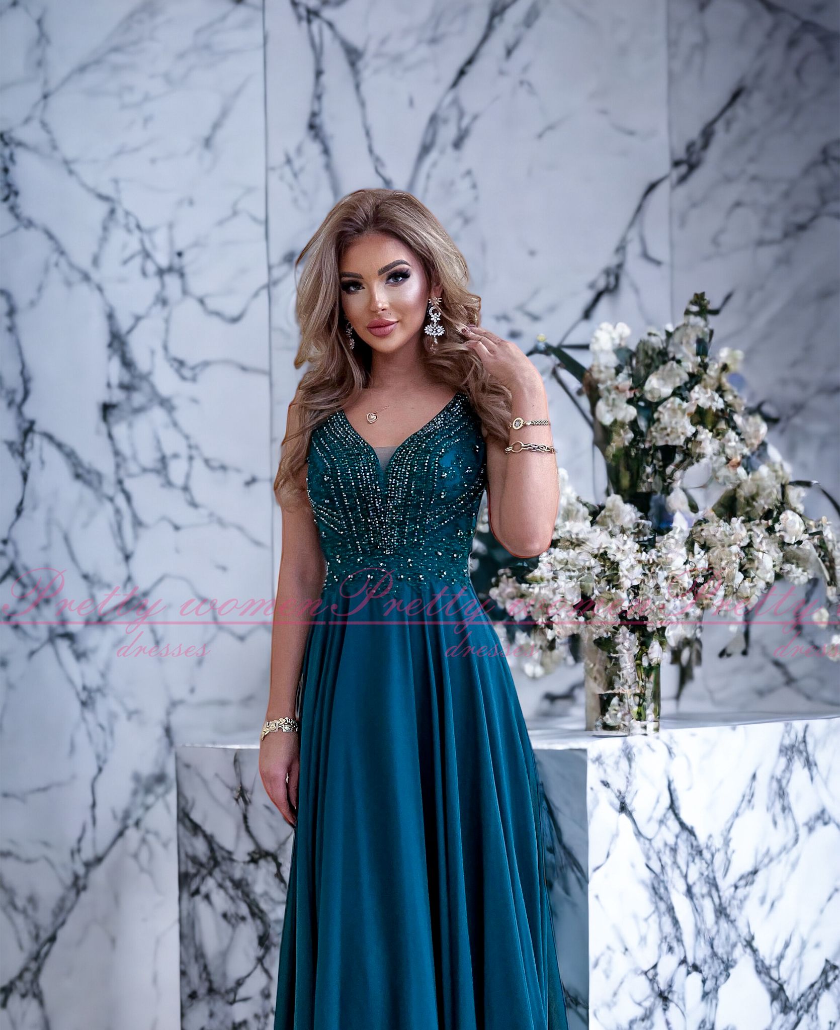 Dieses atemberaubende lange Abendkleid in einem edlen Smaragdgrün ist die perfekte Wahl für besondere Anlässe wie Abschlussbälle, Hochzeiten oder andere festliche Events. Das Oberteil ist kunstvoll mit funkelnden Steinen und Zirkonien verziert, was für einen glamourösen und luxuriösen Look sorgt.