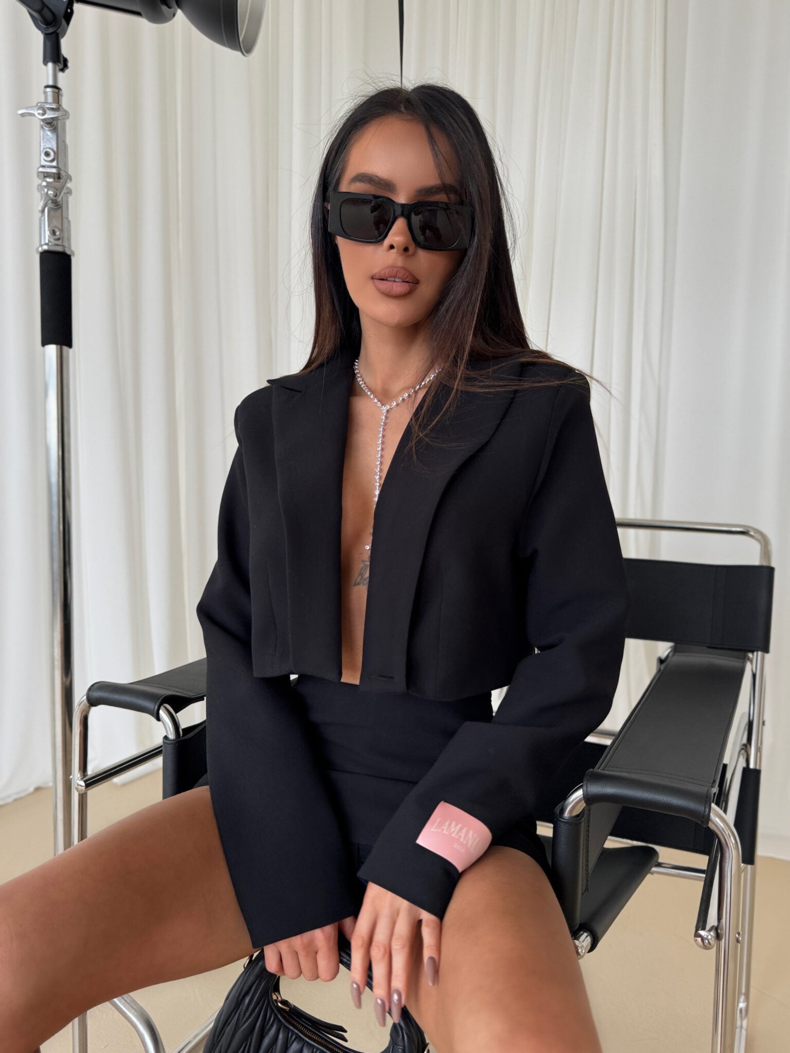 Eine Jacke mit kurzem, modernem Schnitt und tiefem V-Ausschnitt aus hochwertigem Material, das für elegante Passform und Tragekomfort sorgt. Es hat einen klassischen Kragen und eine leicht betonte Schulterlinie durch eingenähte Kissen, die ihm einen strukturellen Look und eine elegante Form verleihen. Wird mit einem Knopf befestigt, was ein einfaches Anbringen und Stylen auf verschiedene Arten ermöglicht. Ein charakteristisches Element sind subtile Details, darunter ein dekorativer Aufnäher am Ärmel und sorgfältige Nähte, die die Konstruktion betonen. Perfekt sowohl für elegantes als auch lässiges Styling – es passt perfekt zu Röcken, Hosen oder Kleidern. Dies ist ein Vorschlag für Frauen, die zeitlosen Stil mit einem modernen Touch schätzen.