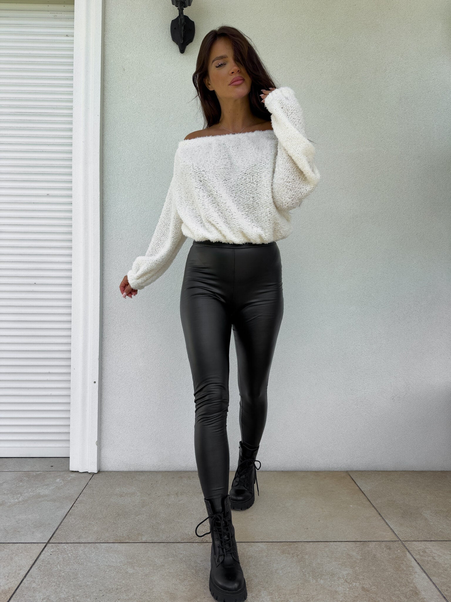 Lockeres Sweatshirt mit breitem "spanischem" Ausschnitt, der über die Schultern fällt. Die Ärmel sind lang und mit elastischen Leisten versehen.