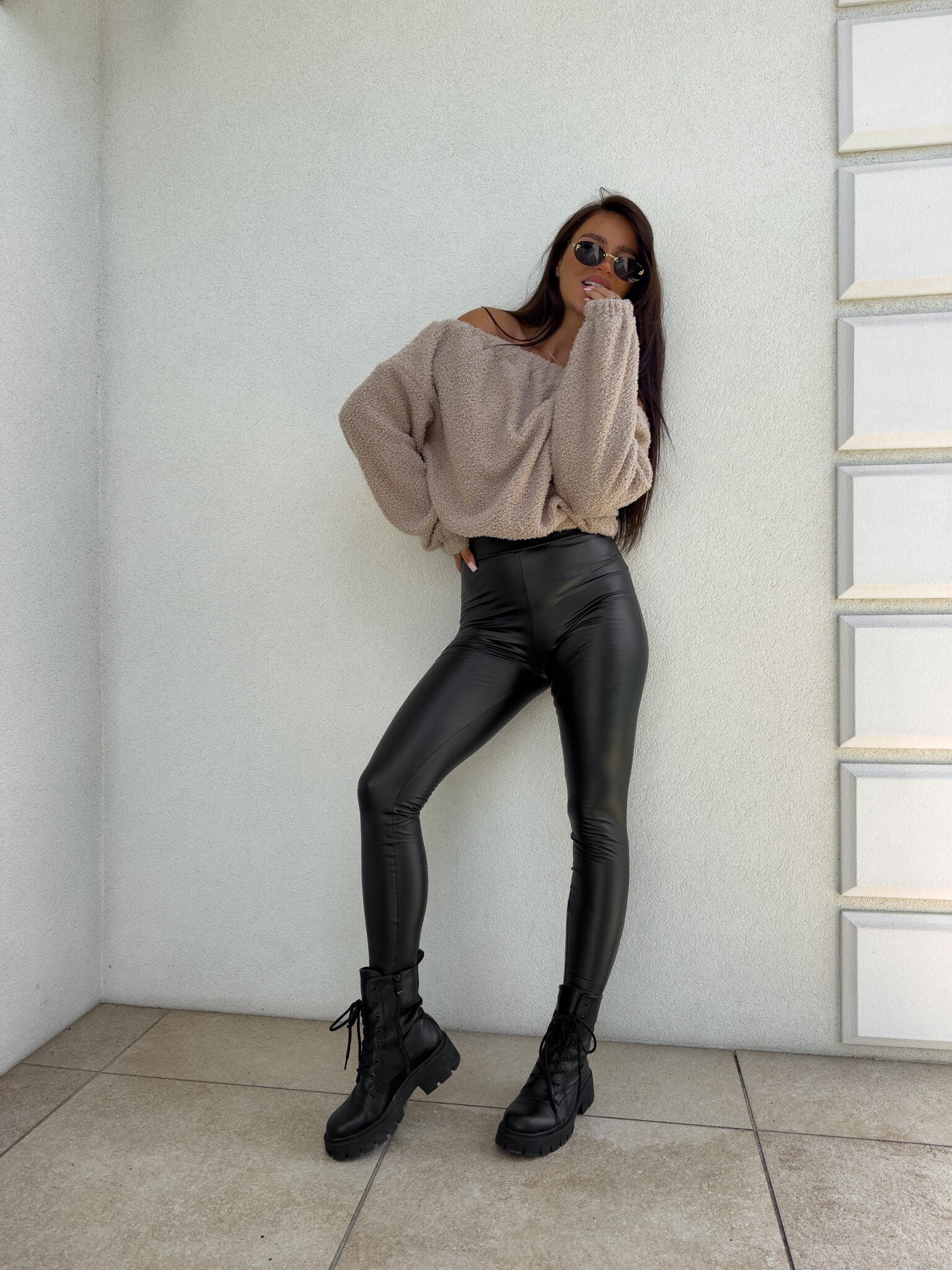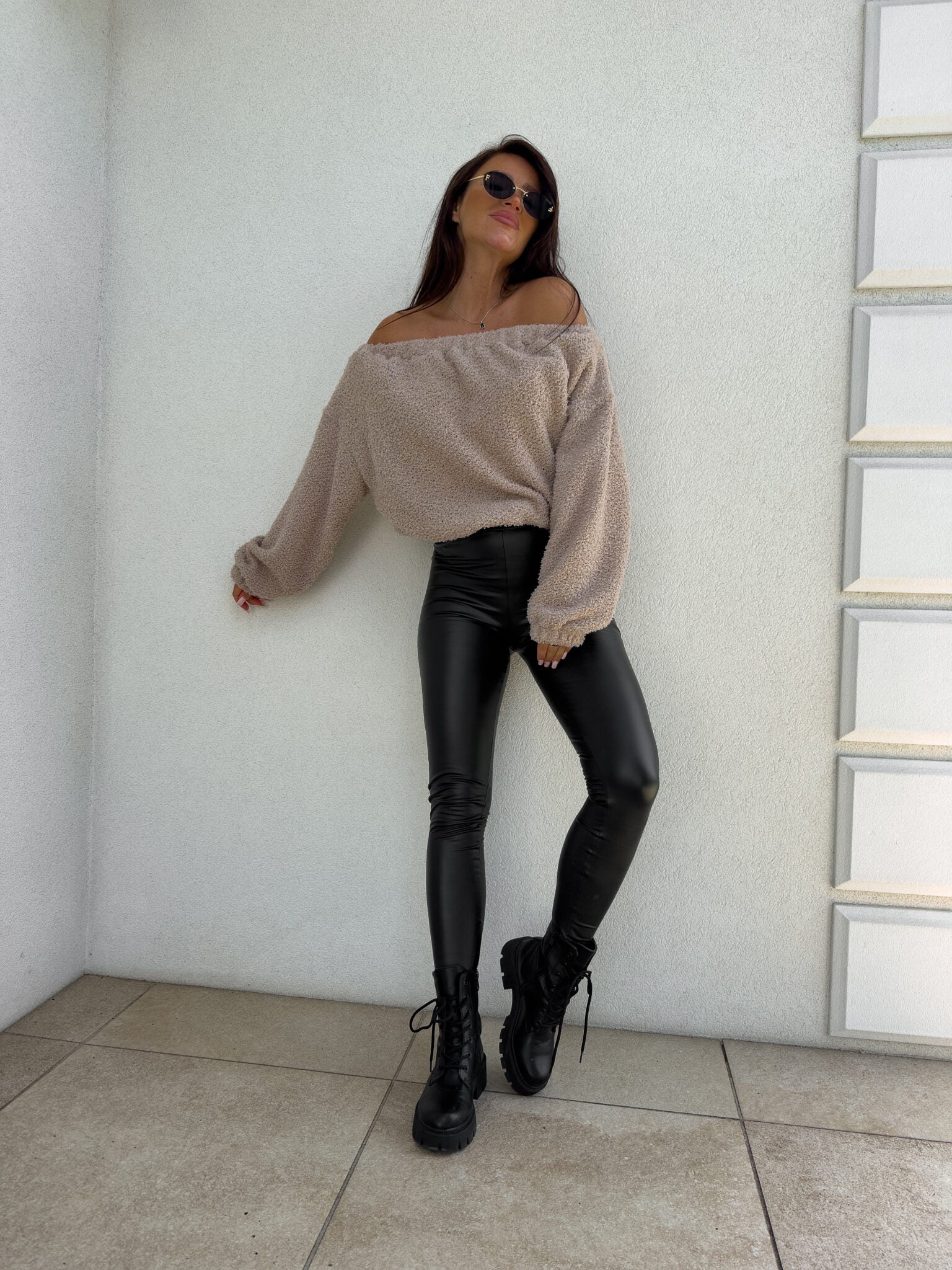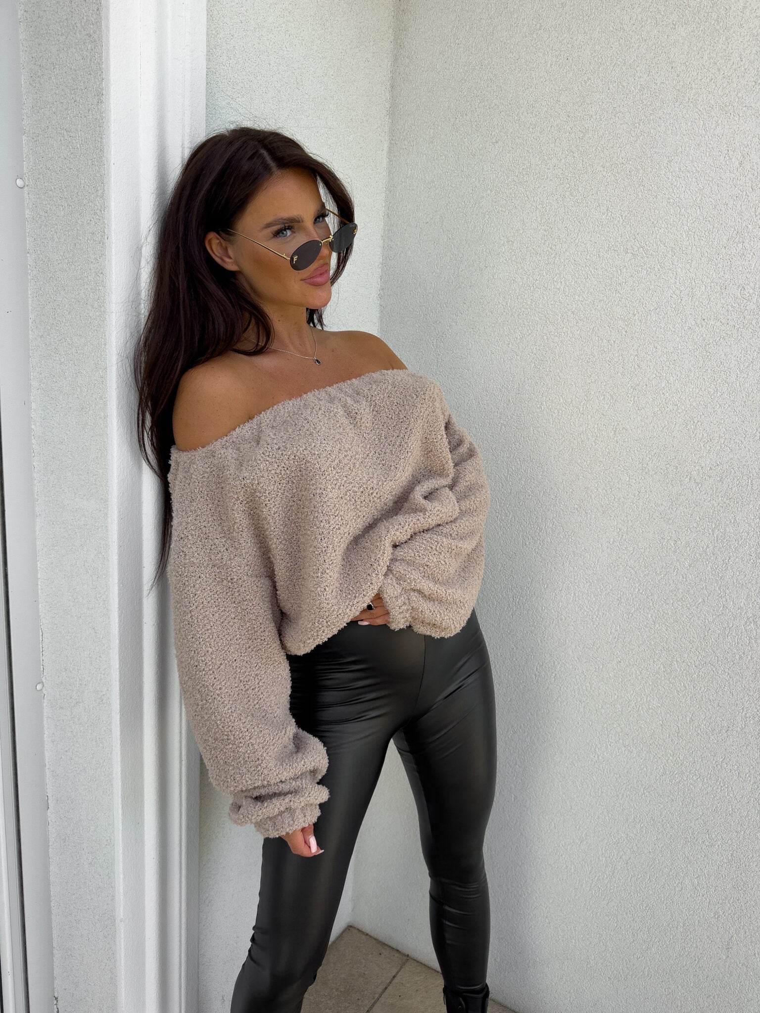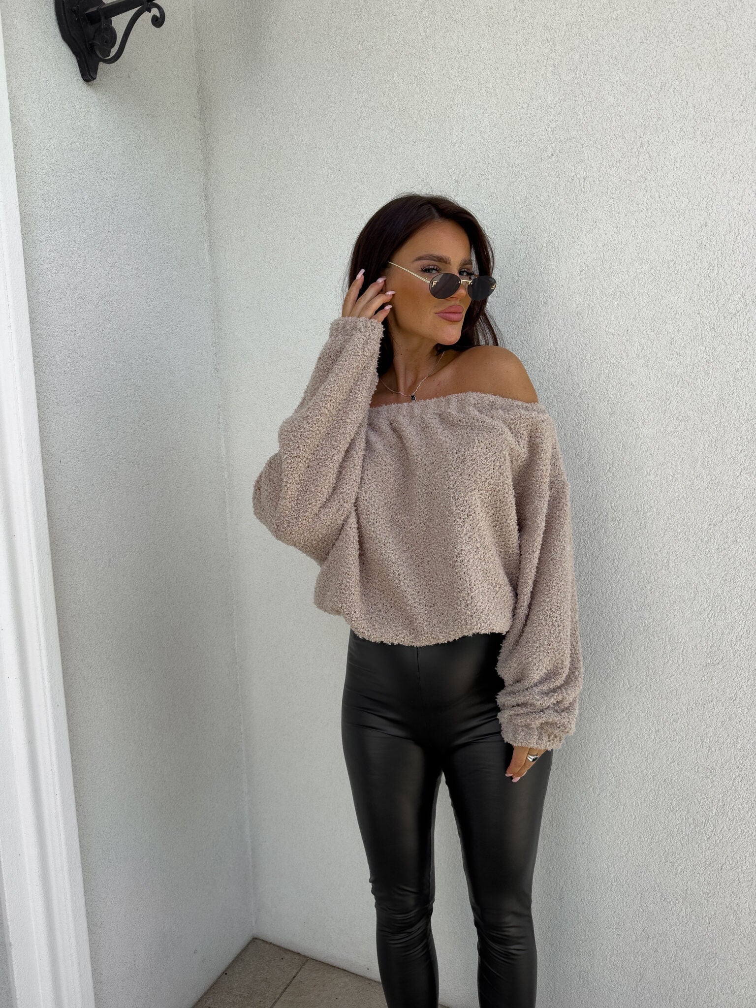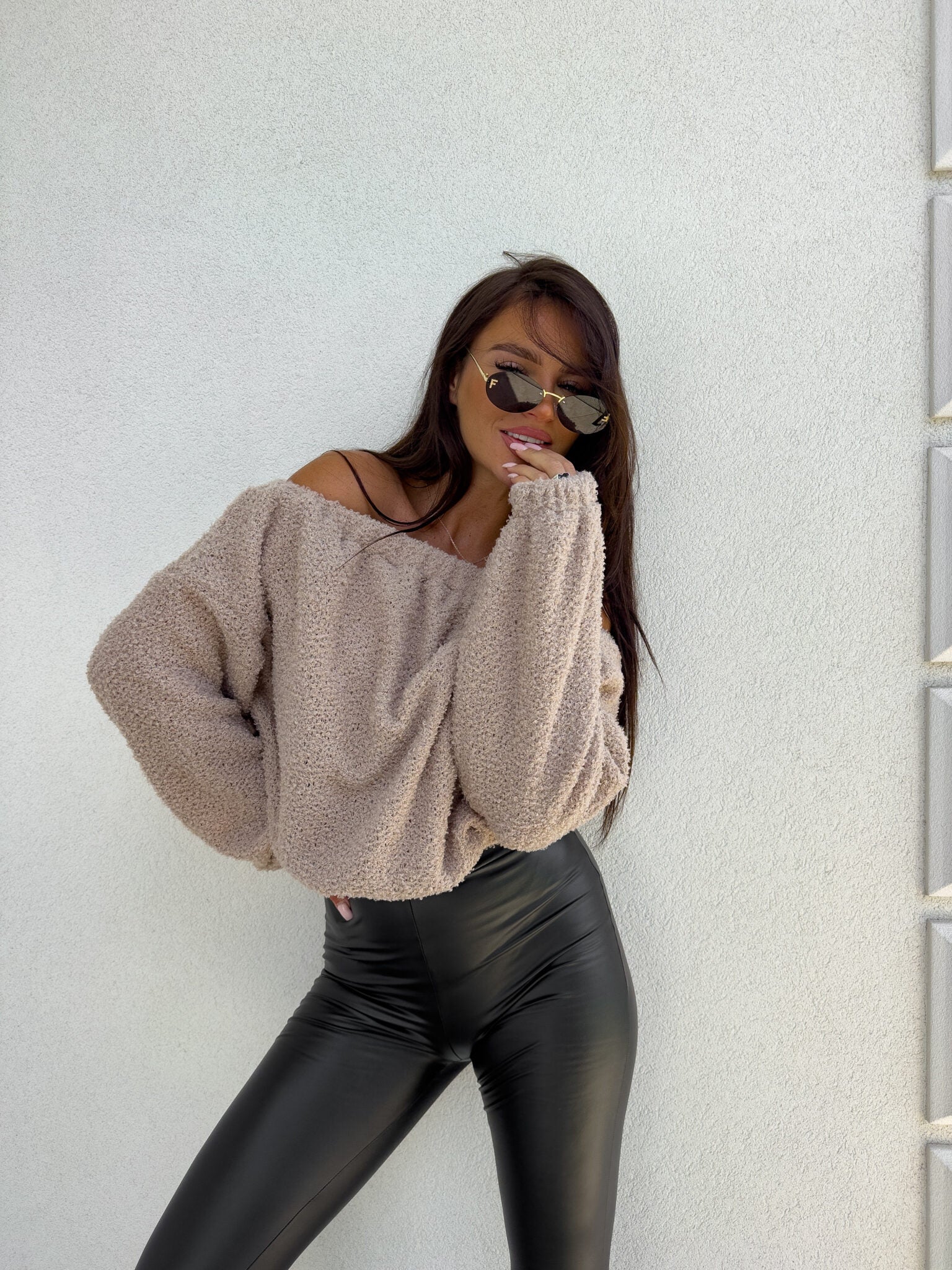 Lockeres Sweatshirt mit breitem "spanischem" Ausschnitt, der über die Schultern fällt. Die Ärmel sind lang und mit elastischen Leisten versehen.