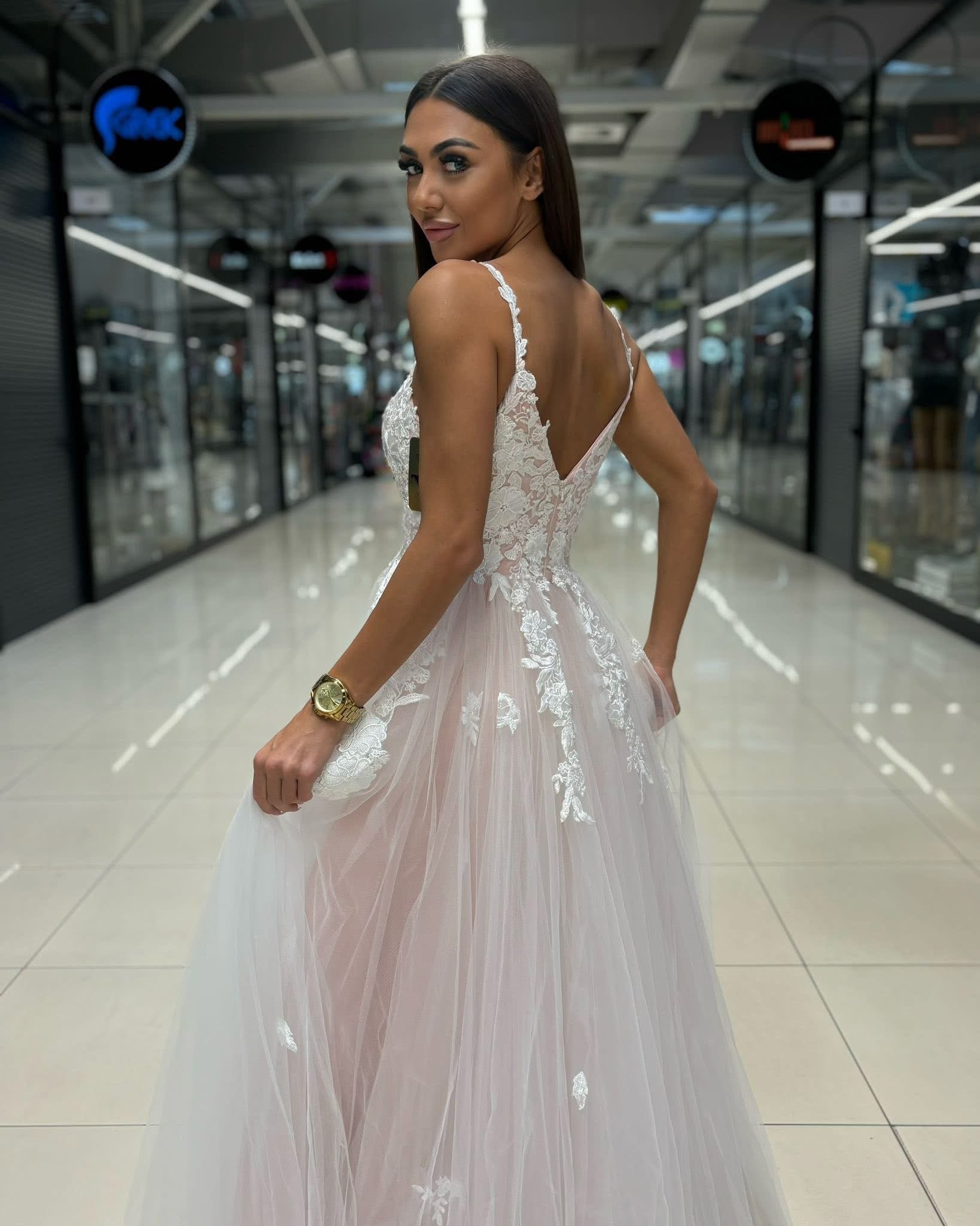 Dieses Hochzeitskleid ist in klassische A- linie geschnitten, Oberteil hat eine V- Ausschnitt. Düne Träger aus feine Spitze, machen dem Kleid leicht und romantisch.