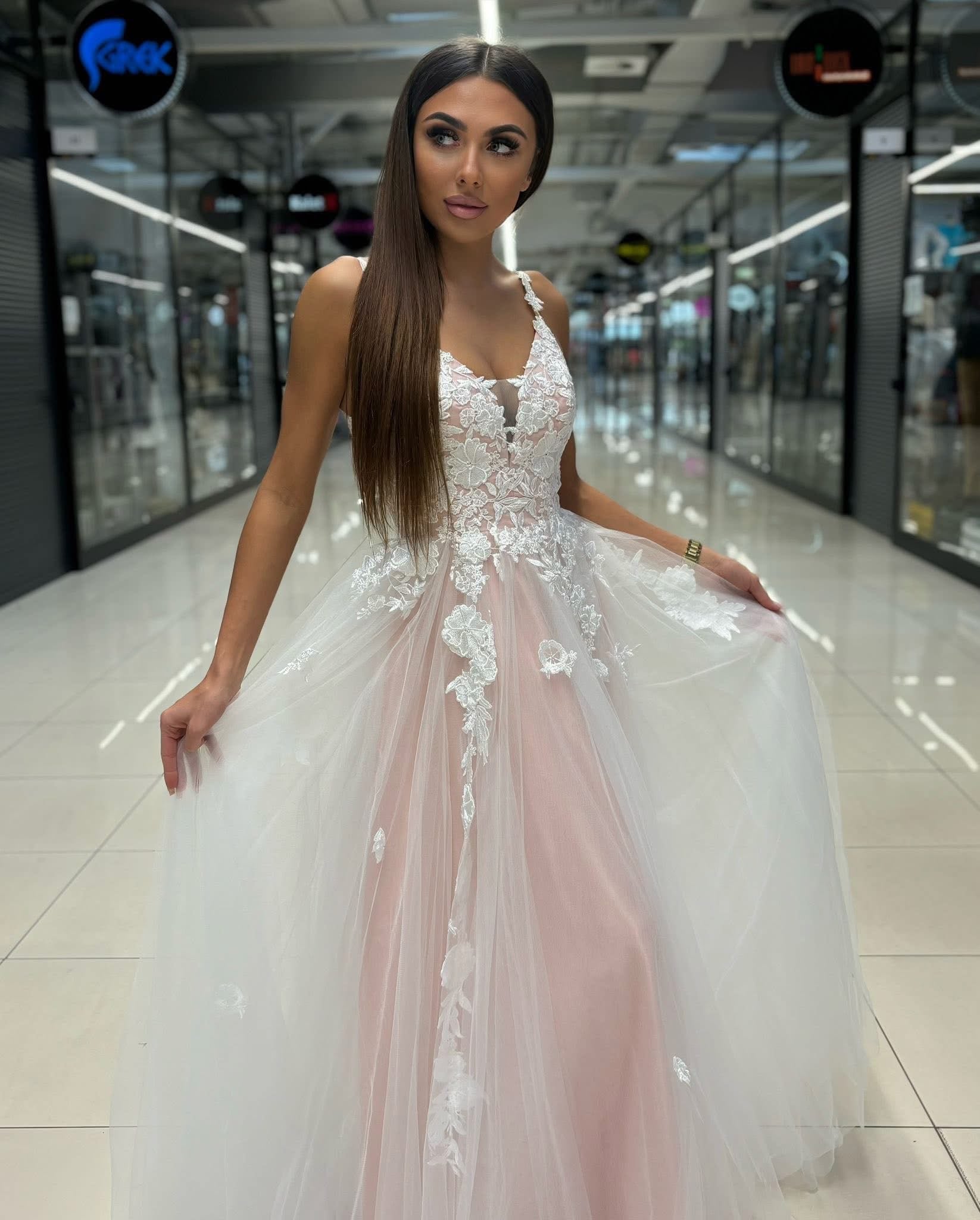 Das Brautkleid in Boho- Stil, hat viel Spitze am Oberteil, die sich sanft bis zur Mitte des Rocks zieht, unter dem ersten Tüll hat das Brautkleid eine rosafarbene Stoff, die das Weiß schön reflektiert.