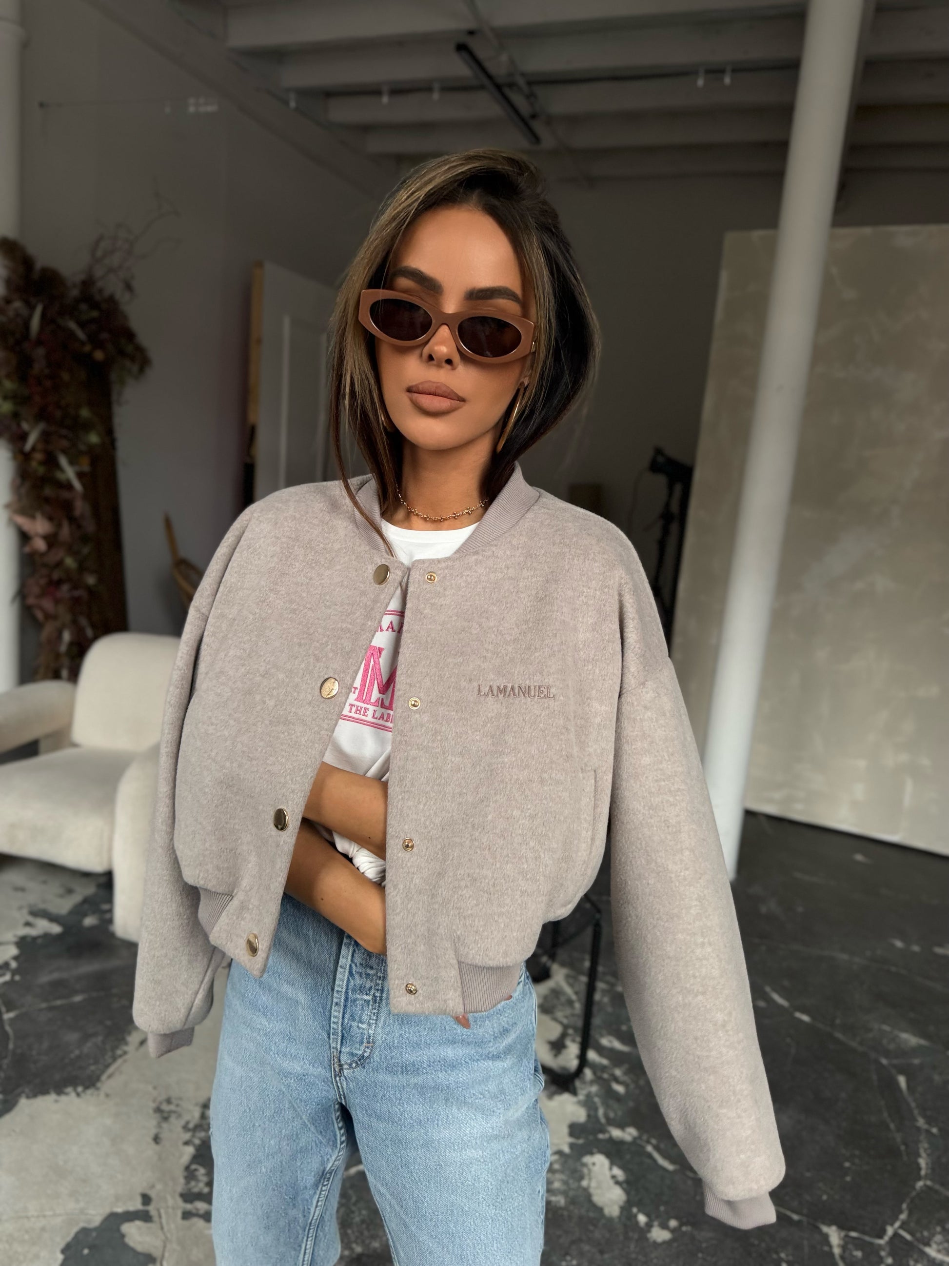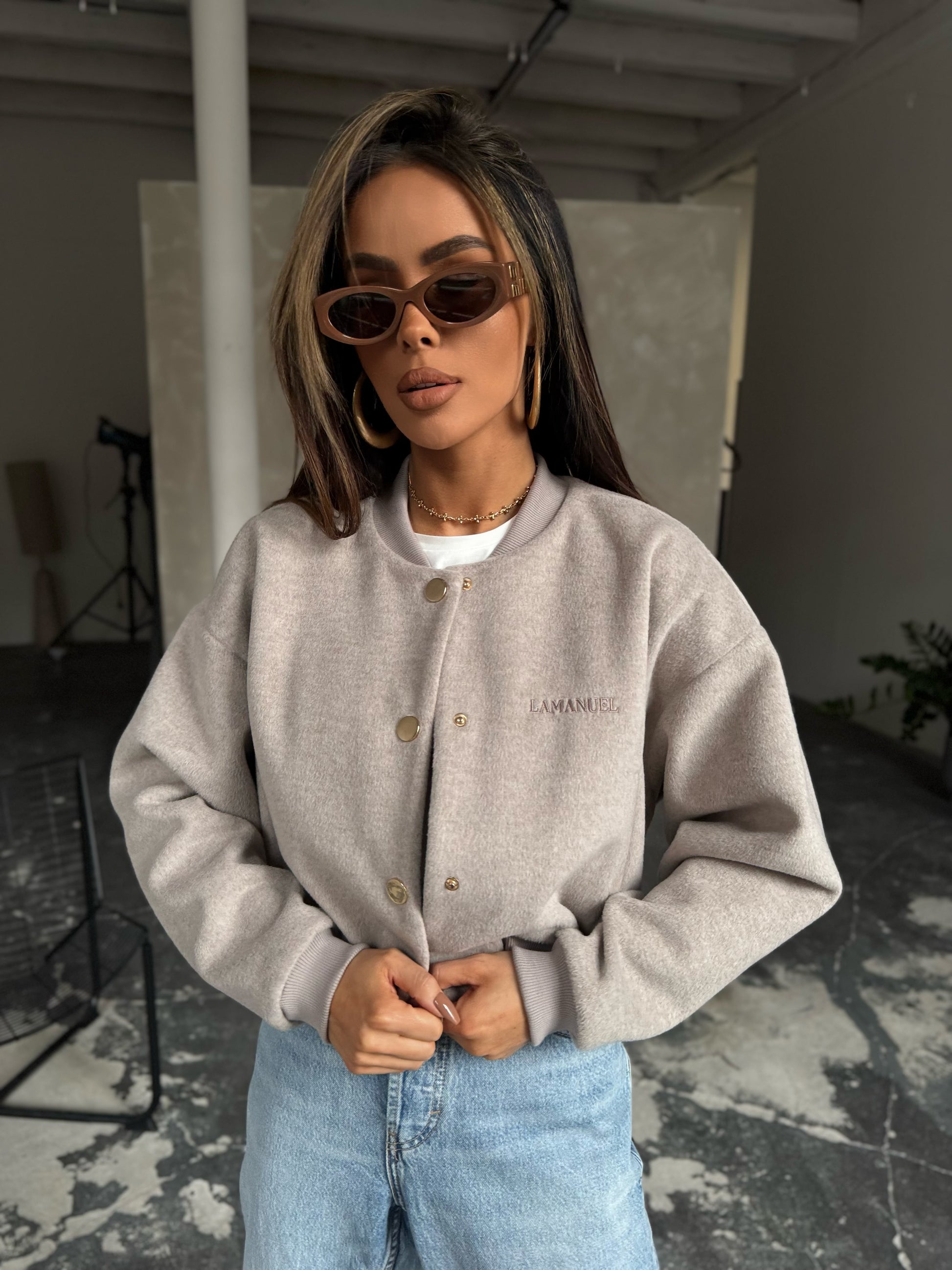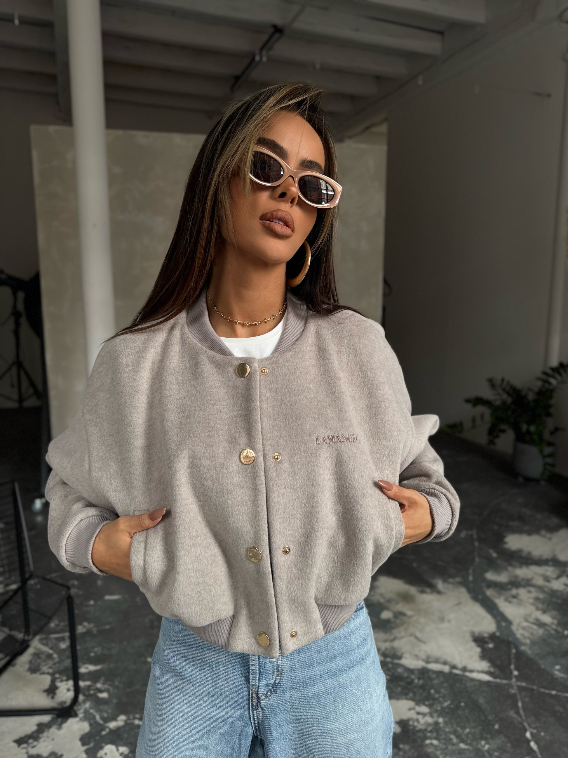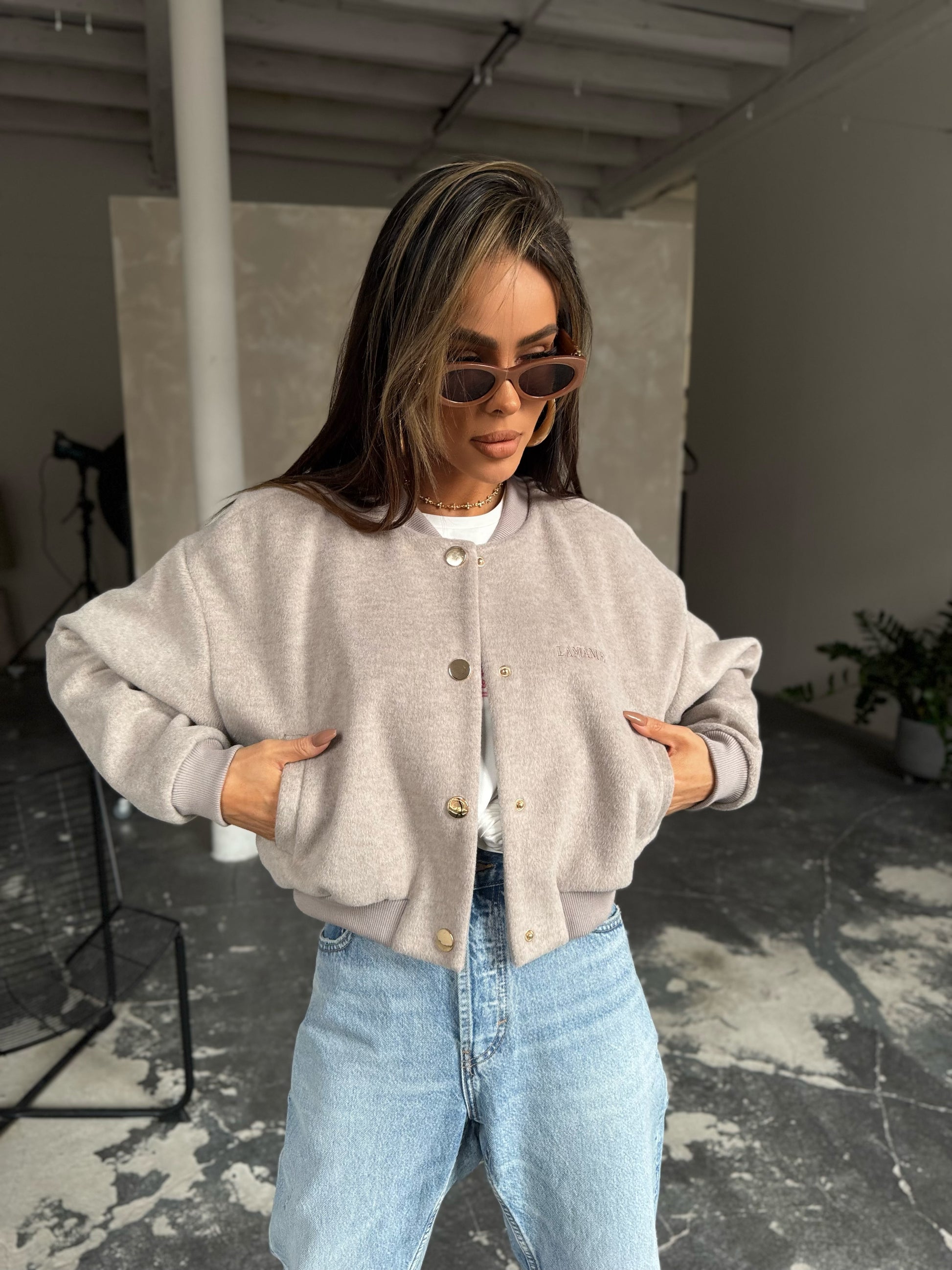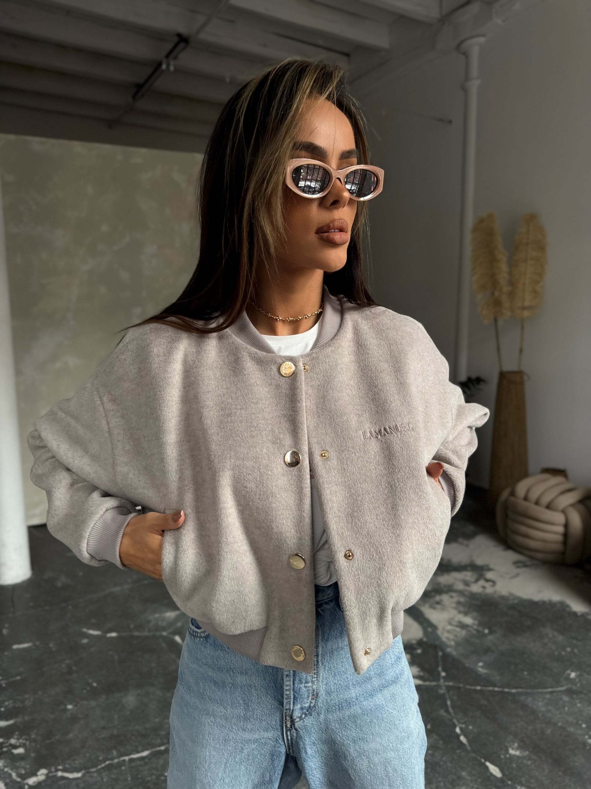 Charakteristische Details wie goldene Druckknöpfe und ein dezentes Logo verleihen ihm einen eleganten Look, während elastische Bündchen den lässigen, aber raffinierten Stil unterstreichen. Durch den universellen Schnitt passt es sowohl zu Jeans als auch zu feminineren Styles.
