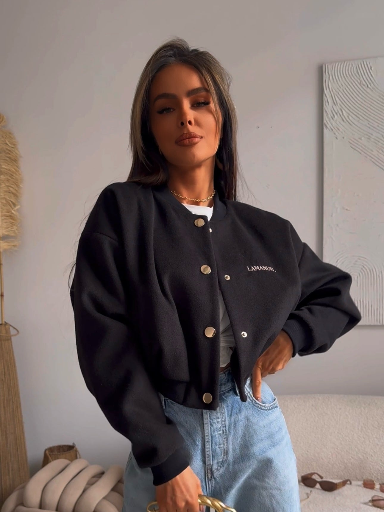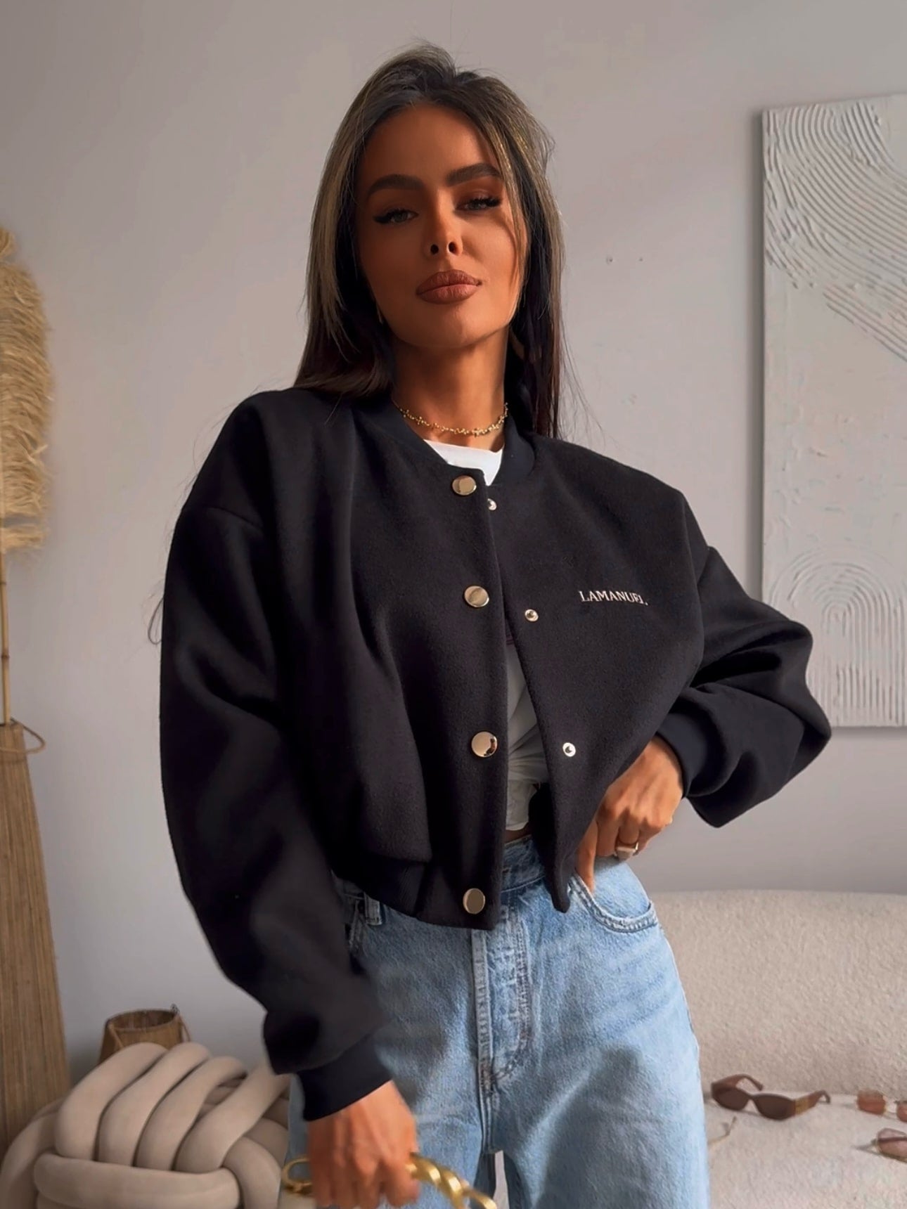 Charakteristische Details wie goldene Druckknöpfe und ein dezentes Logo verleihen ihm einen eleganten Look, während elastische Bündchen den lässigen, aber raffinierten Stil unterstreichen. Durch den universellen Schnitt passt es sowohl zu Jeans als auch zu feminineren Styles.