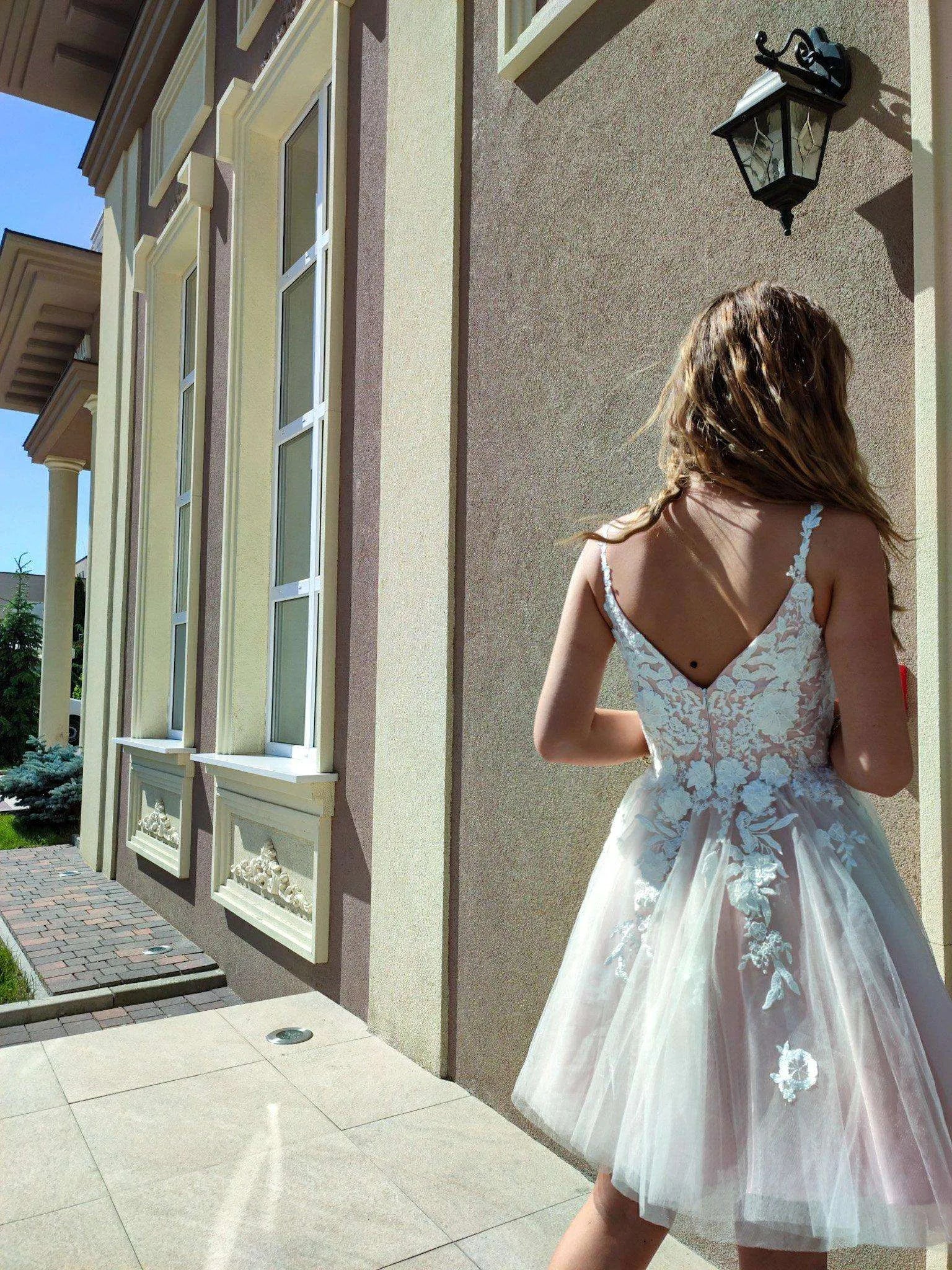 Kurze Brautkleid, perfekt für Standesamtliche Hochzeit. Zarte Spitze am Oberteil und Rock.