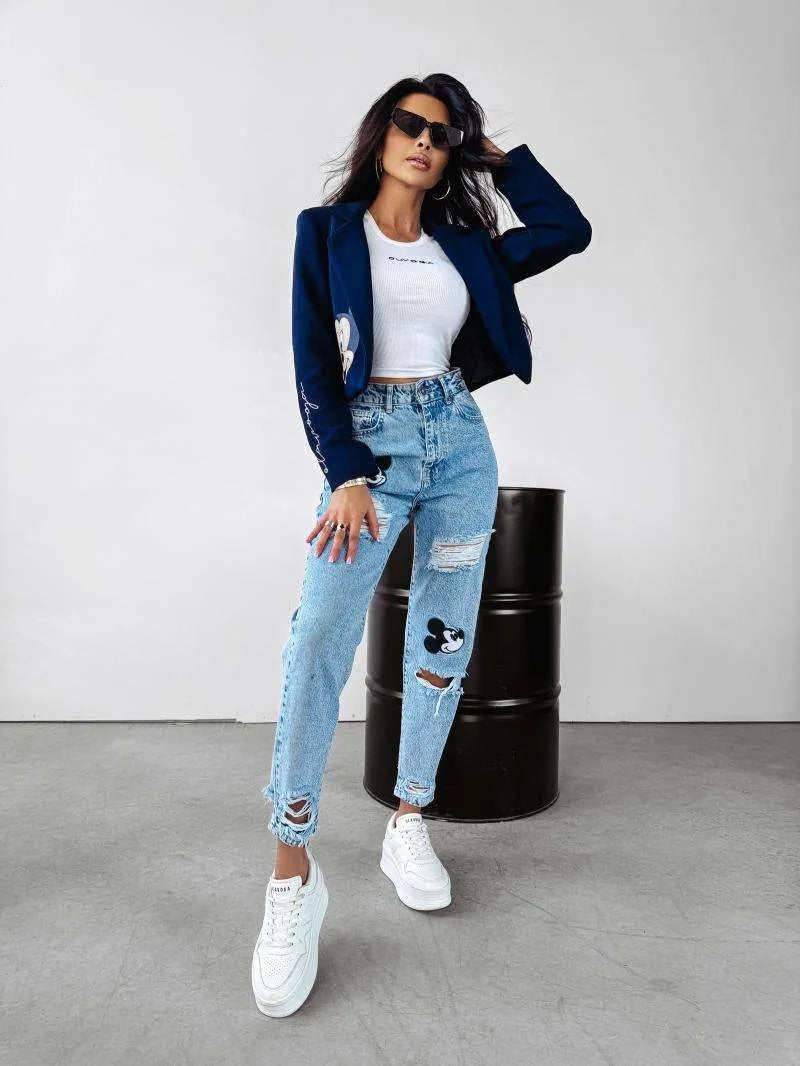 Die Vorderseite ist mit einem lustigen Mickey-Mouse-Aufdruck und einer dezent platzierten OLV-Stickerei verziert, was ihm einen einzigartigen Charakter verleiht.