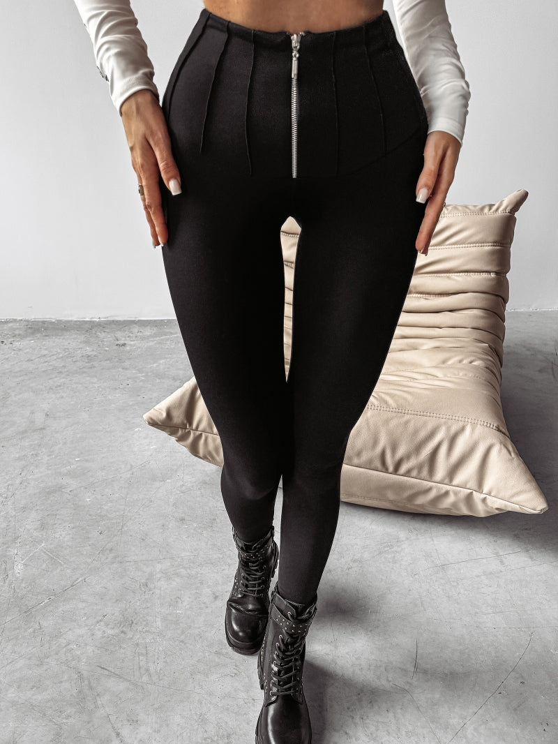 Sie haben eine hohe Taille. Auf der Vorderseite befinden sich ein Reißverschluss und zarte Nähte, die dem Produkt Charme verleihen.