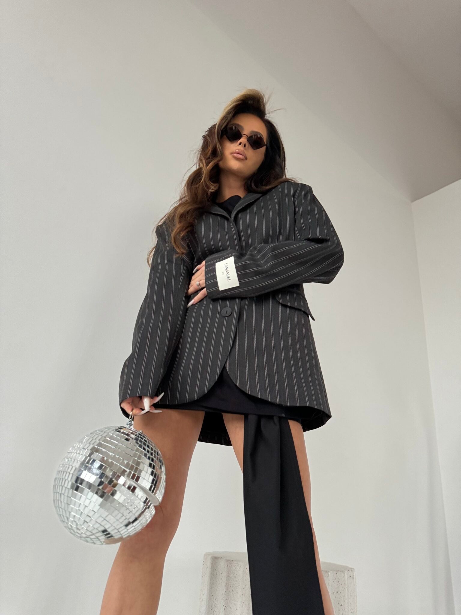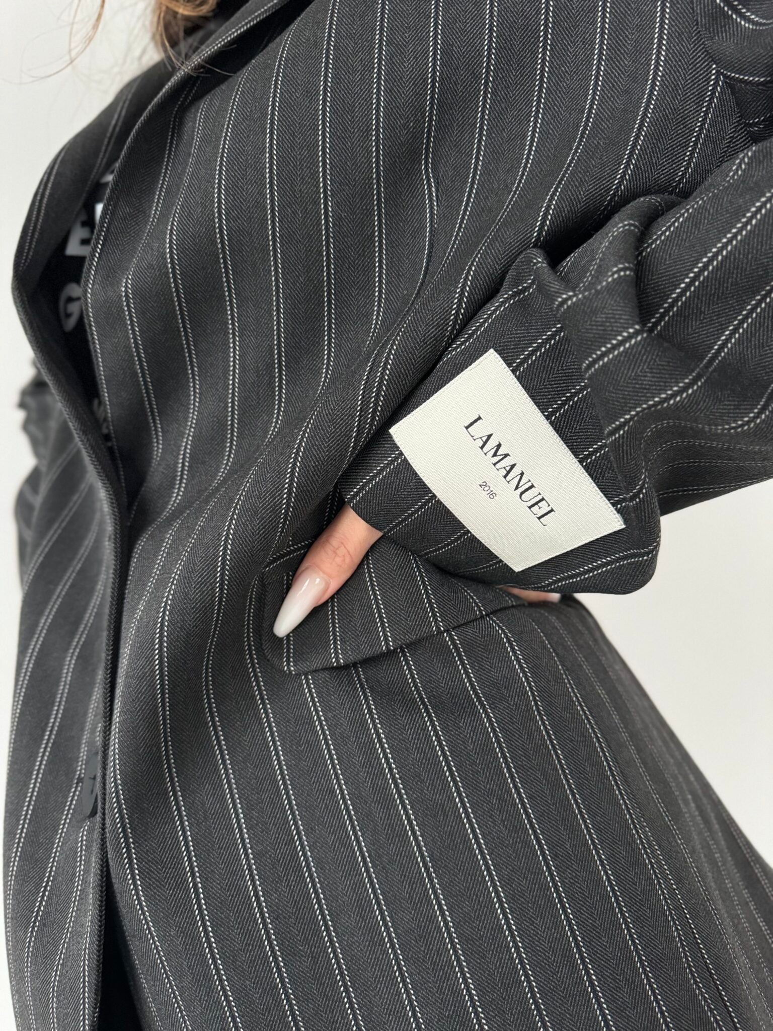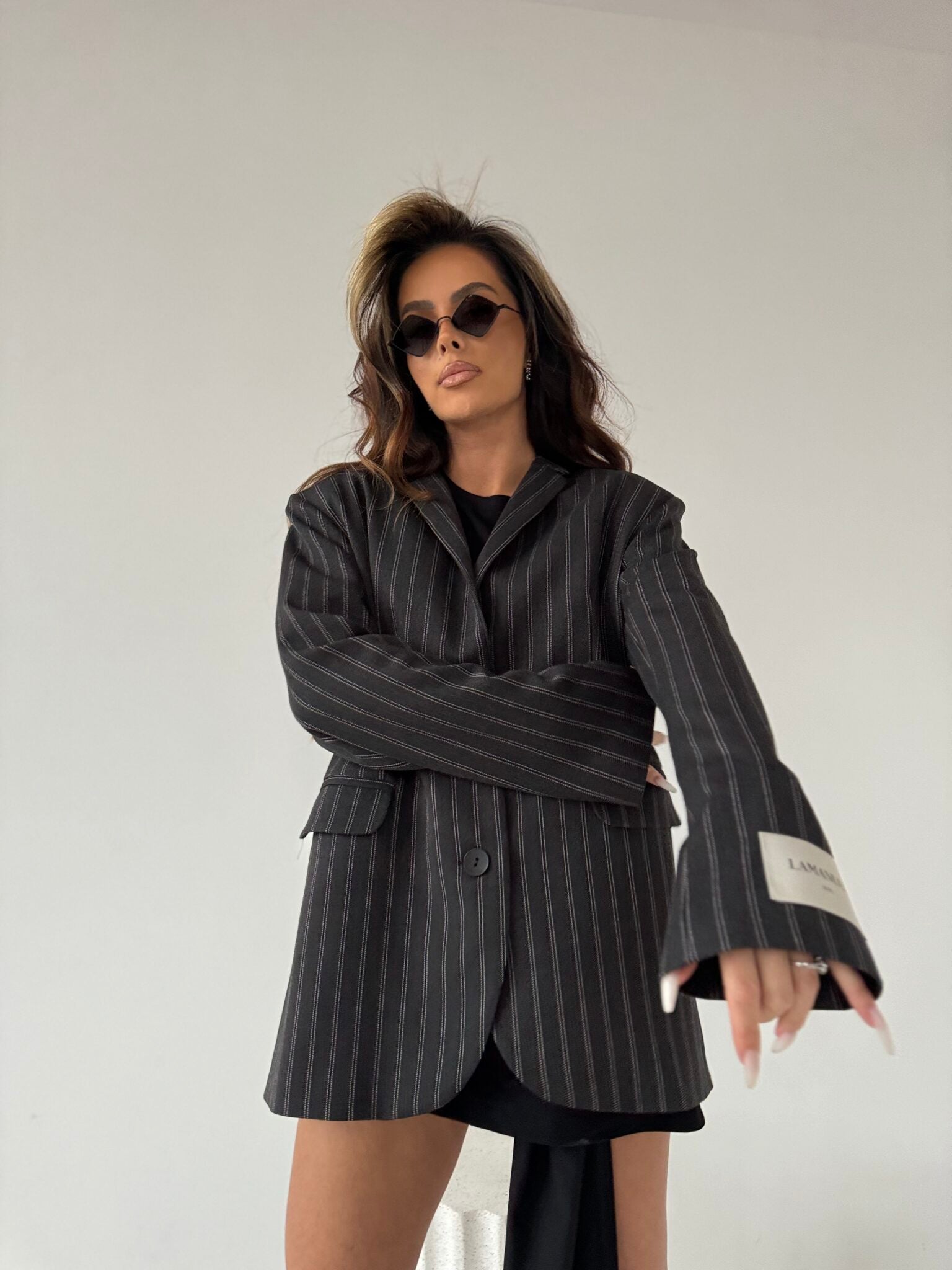 Das markante Streifenmuster verleiht der Jacke einen ausdrucksstarken Charakter und macht sie zu einem vielseitigen Begleiter – ideal für sowohl formelle Anlässe als auch entspannte Freizeitlooks. Ein besonderes Highlight ist der elegante Patch am Ärmel, der einen originellen Designer-Akzent setzt und den modernen, leicht lässigen Charme der Jacke unterstreicht.