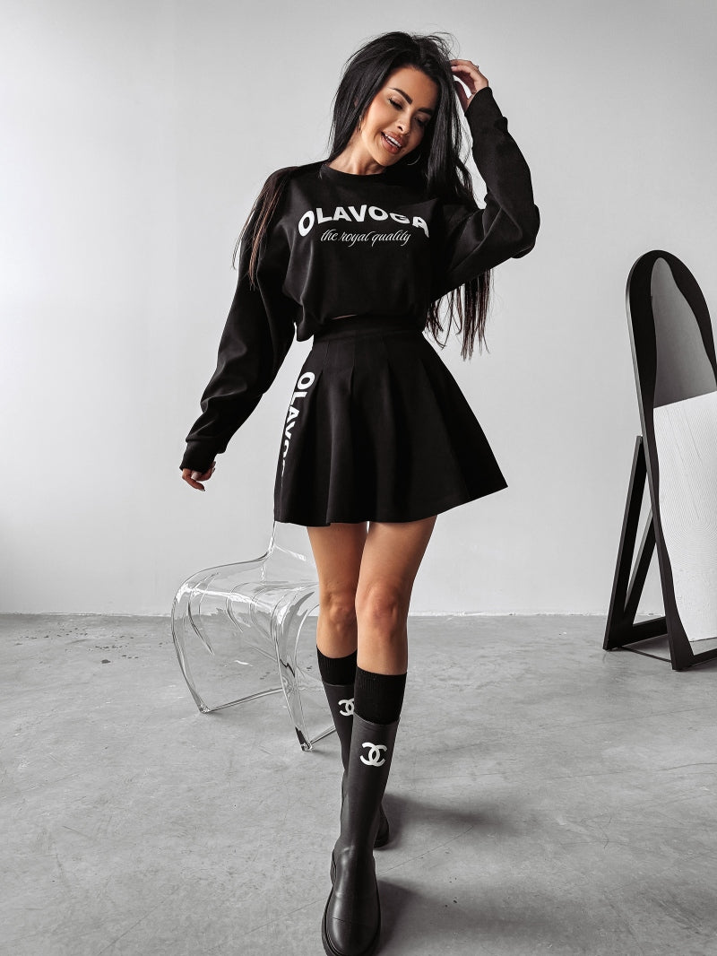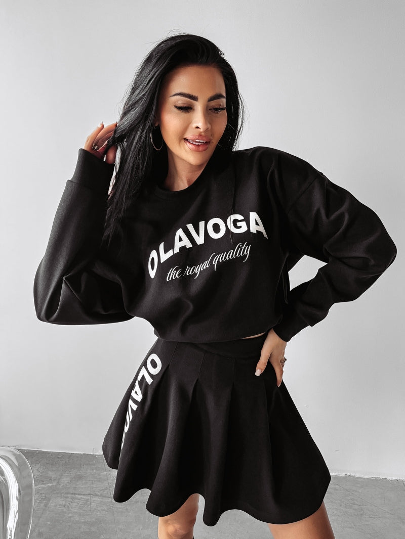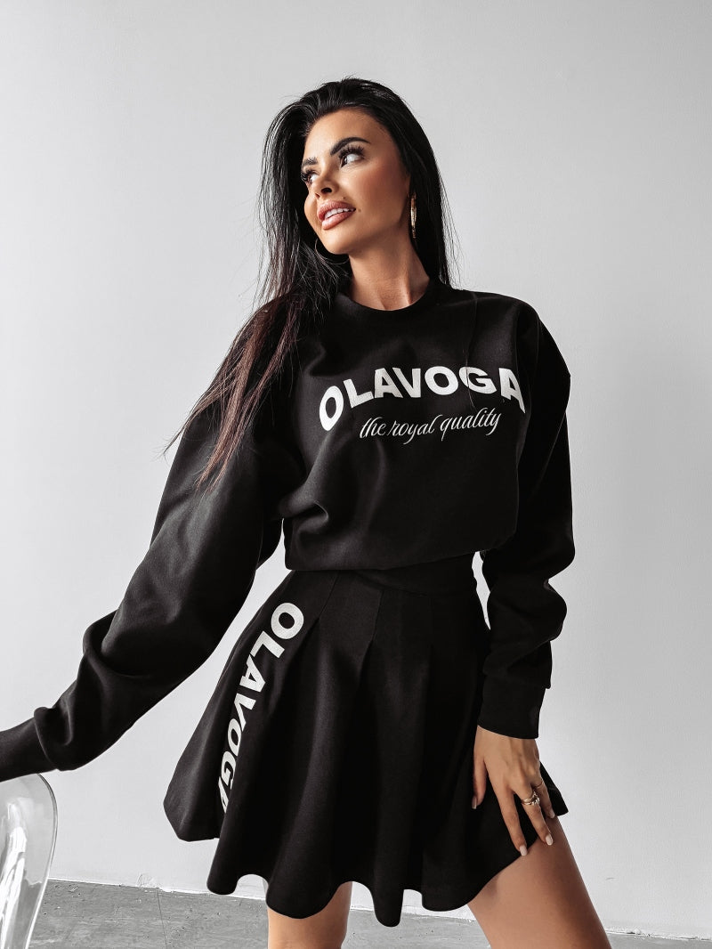 Damen-Set CORNEL OLAVOGA aus hochwertigem Material. Oberteil – leicht gefütterte Sweatshirt ohne Kapuze. Auf der Vorderseite befindet sich ein großes OLAVOGA-Logo mit der Aufschrift THE ROYAL QUALITÄT. Unten - Faltenrock mit seitlichem Reißverschluss. Das Produkt verfügt über ein umfangreiches Markenlogo.