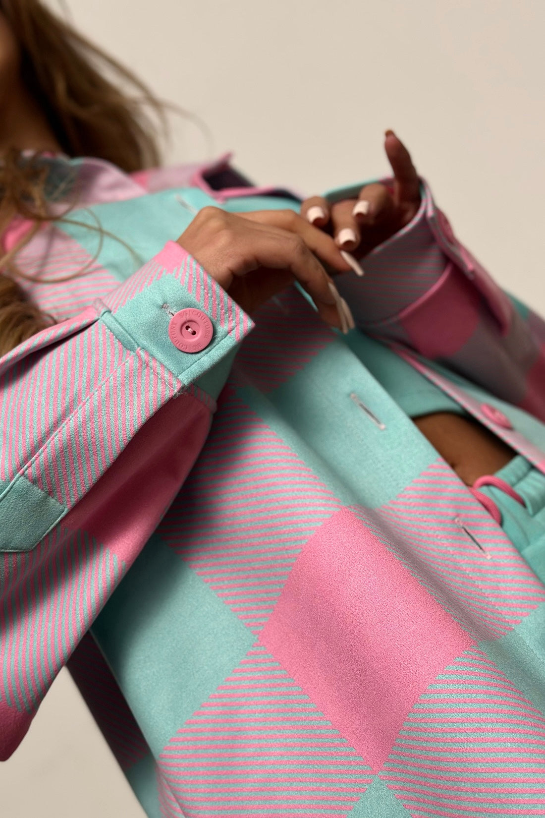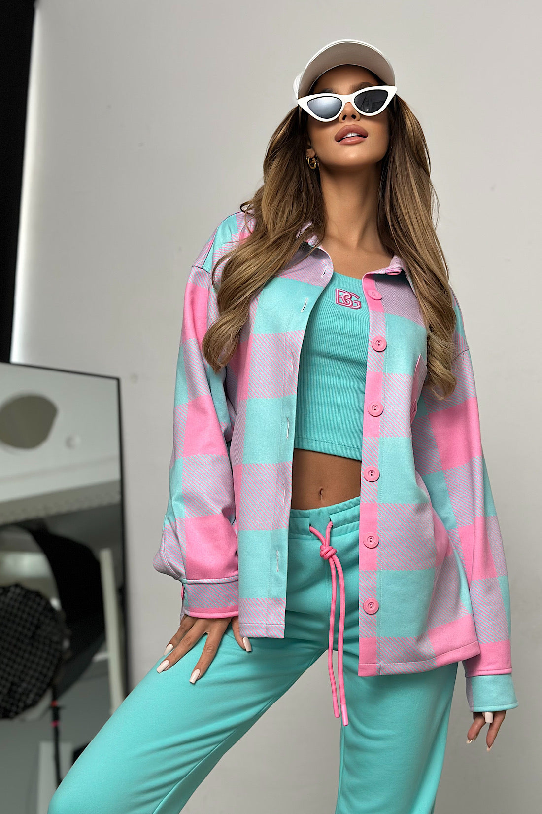 Stilvolles und bequemes Damenhemd BG STARS übergroß in einem bunten Karo, aus weichem Wildleder. Es hat Seitentaschen und eine Fronttasche mit einem subtilen BG-Logo. Der lockere Schnitt bietet Komfort und Bewegungsfreiheit, ideal für lässige Outfits.