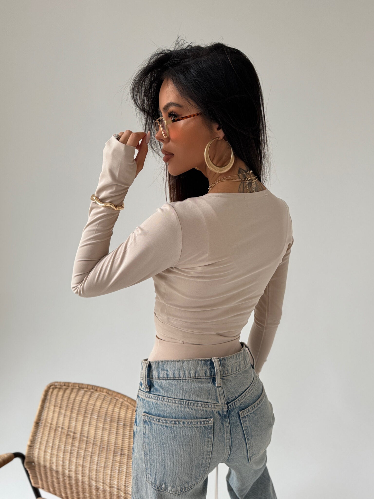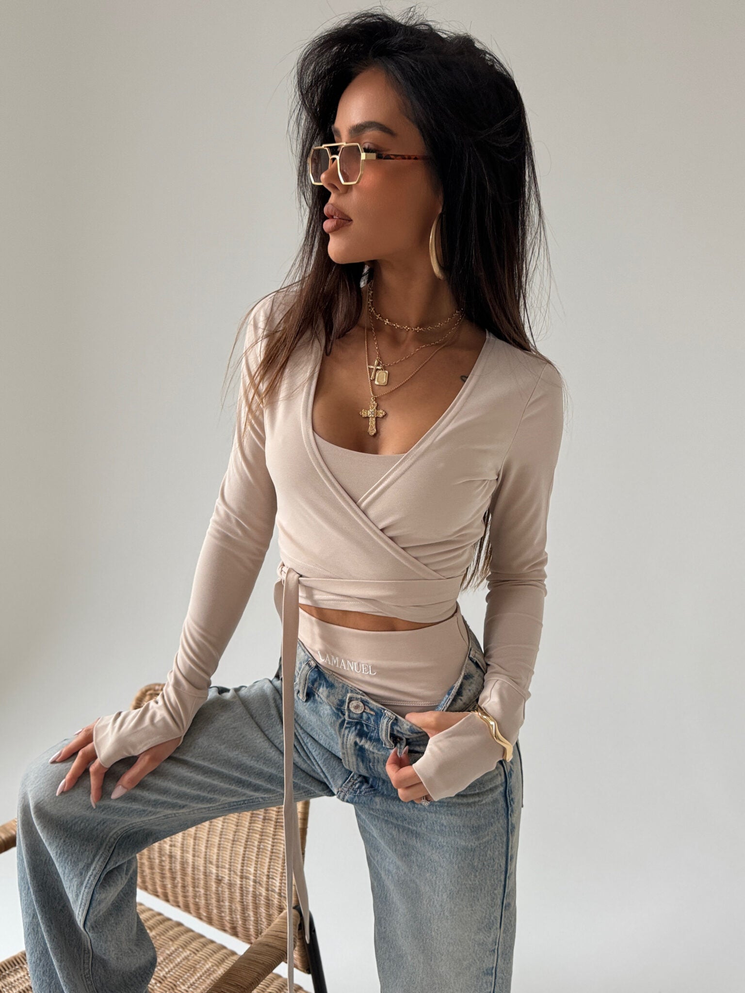 Langärmlige Wickelbluse aus leichtem, flexiblem Material. Der taillierte Schnitt betont die Silhouette und die Taillenbänder ermöglichen eine individuelle Passform. Der tiefe Ausschnitt verleiht eine feminine Note, während die langen Ärmel mit Daumenlöchern dem gesamten Stück einen modernen Look verleihen. Perfekt für das Styling im Alltag und am Abend. Kombinieren Sie es mit unserem PLAY-Set und machen Sie sich keine Gedanken über das Styling!