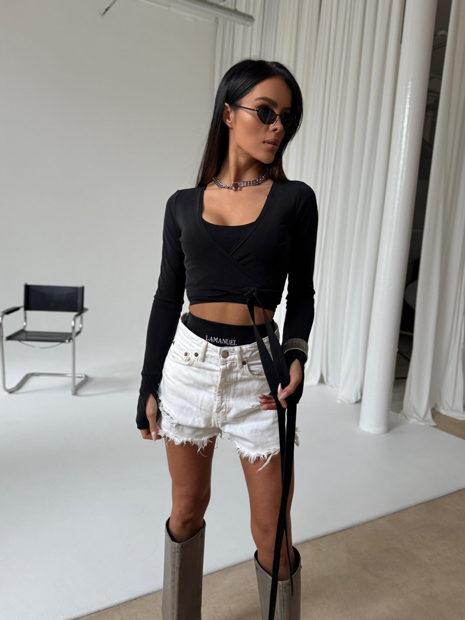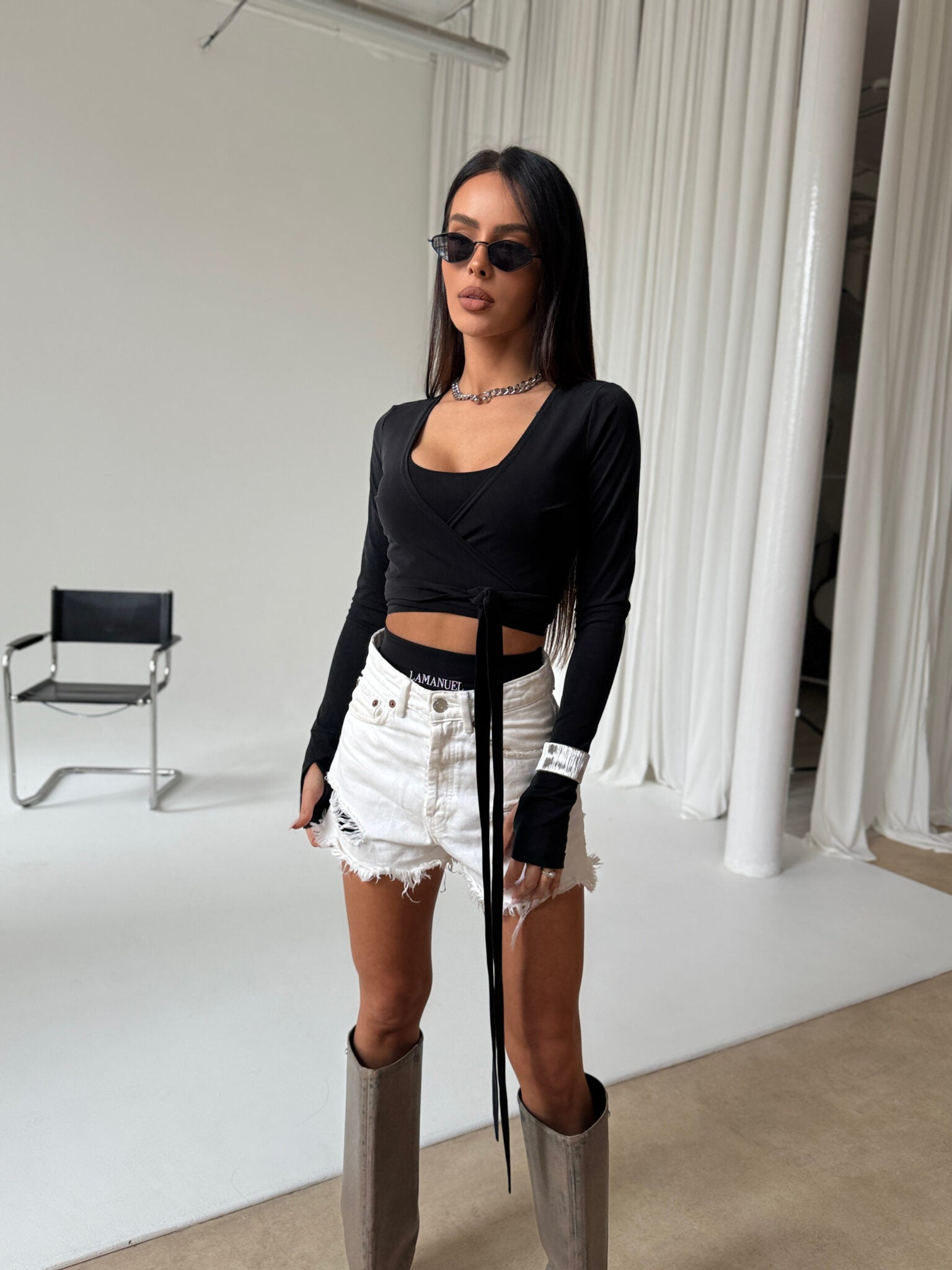 Langärmlige Wickelbluse aus leichtem, flexiblem Material. Der taillierte Schnitt betont die Silhouette und die Taillenbänder ermöglichen eine individuelle Passform. Der tiefe Ausschnitt verleiht eine feminine Note, während die langen Ärmel mit Daumenlöchern dem gesamten Stück einen modernen Look verleihen. Perfekt für das Styling im Alltag und am Abend. Kombinieren Sie es mit unserem PLAY-Set und machen Sie sich keine Gedanken über das Styling!