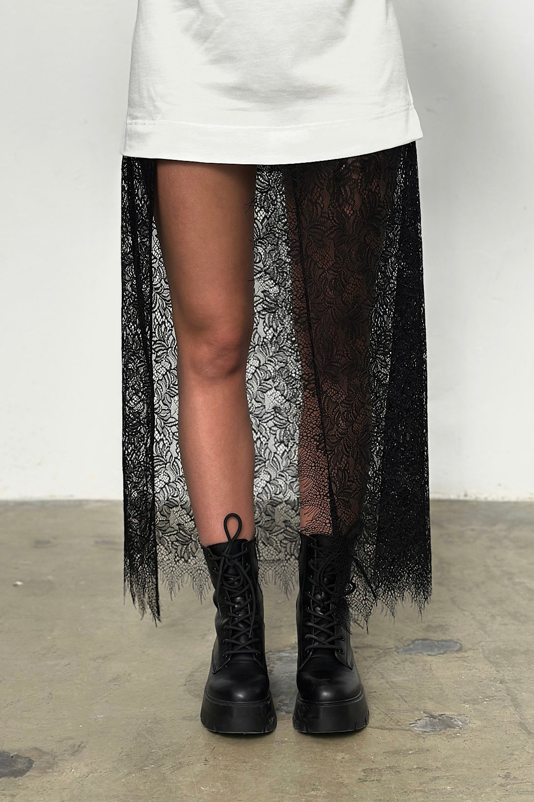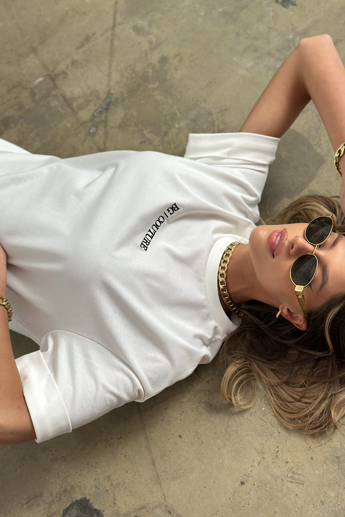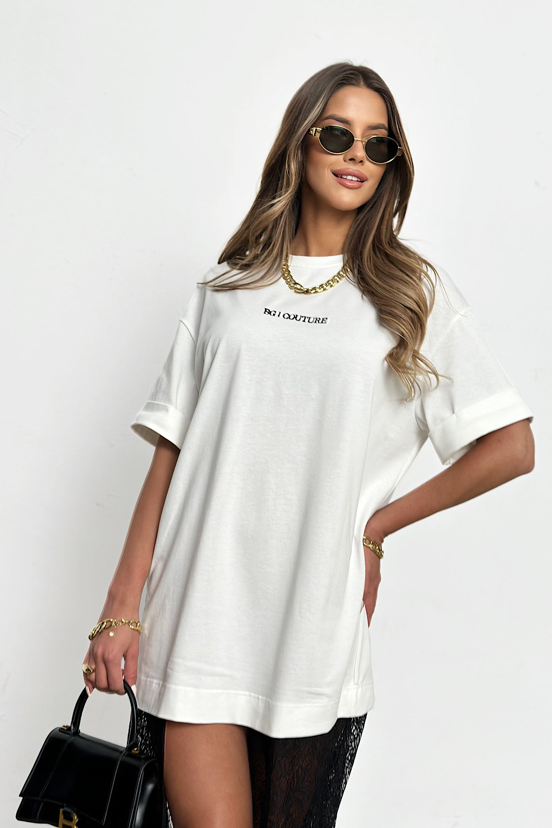 Produktbeschreibung: Entdecken Sie eine einzigartige Kombination aus lässigem Stil und subtiler Weiblichkeit. Unser übergroßes Kleid ist ein Muss für Liebhaber modischer Kontraste. Das Oberteil im Stil eines lockeren T-Shirts mit einem zentralen Log BG | COUTURE verleiht ihm einen lässigen, urbanen Charakter, während die schwarze Spitze, die von der Hüftlinie bis zum Boden genäht ist, für Sinnlichkeit und Eleganz sorgt.