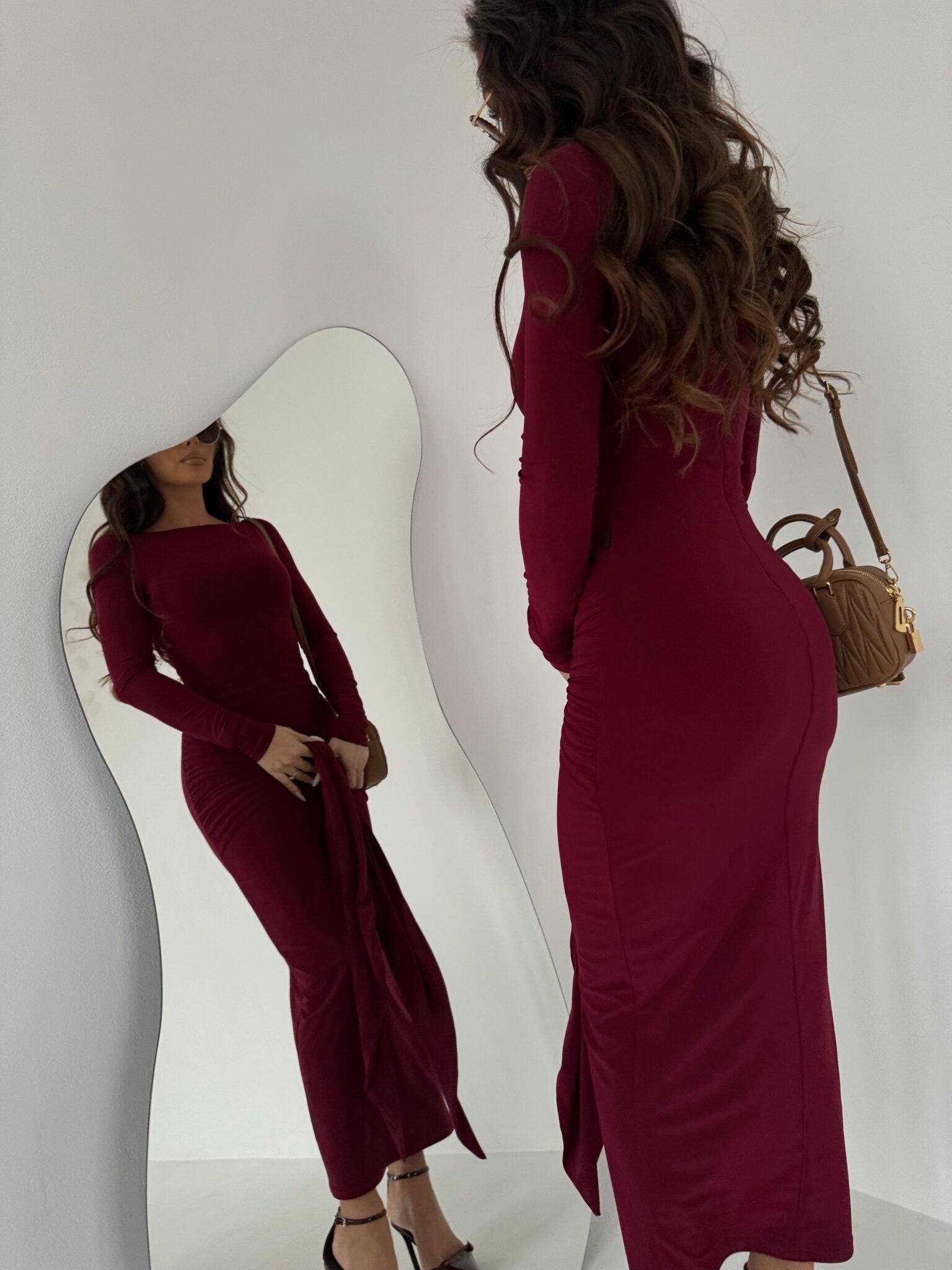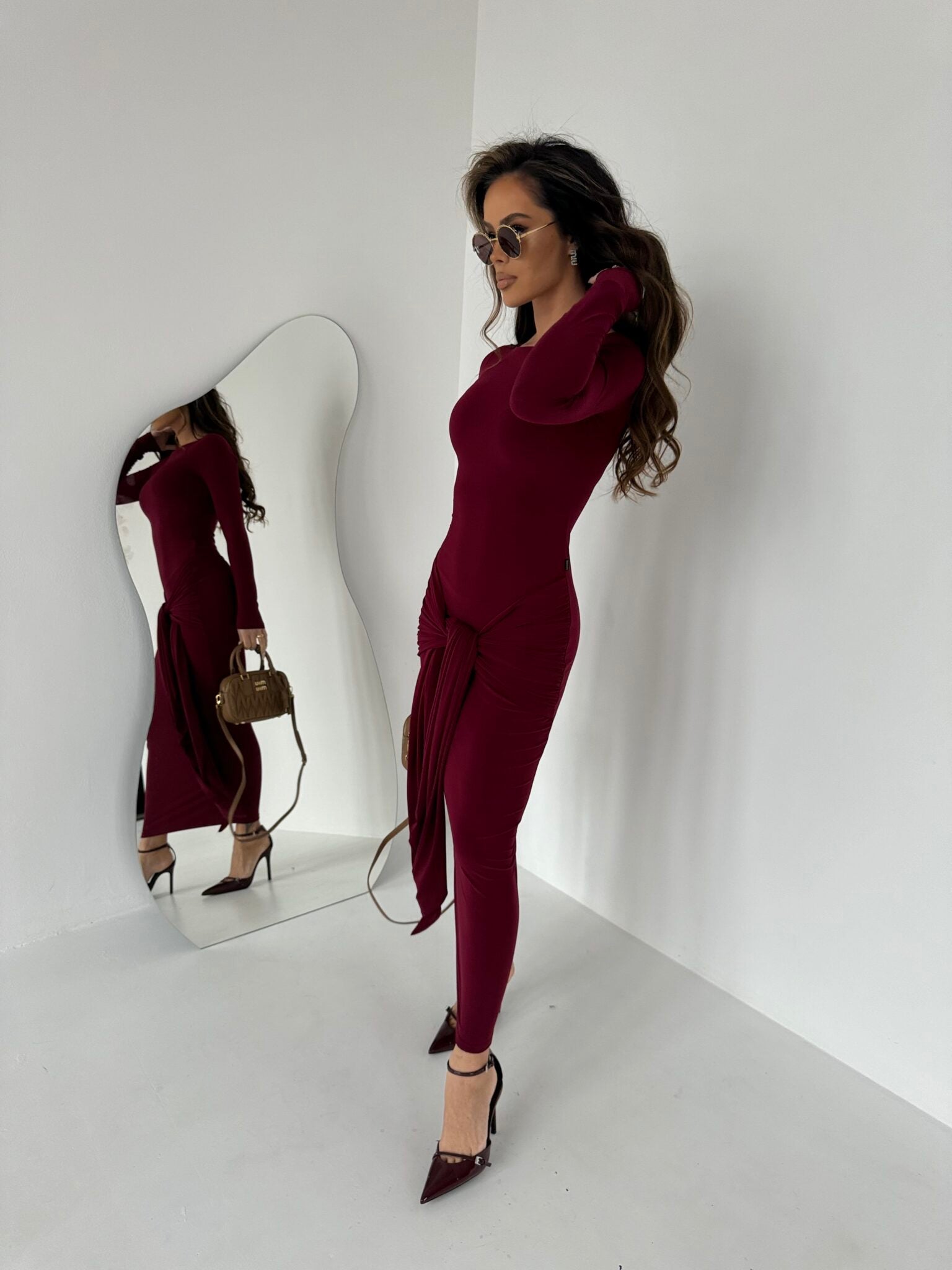 Das Kleid besticht durch lange Ärmel, die ihm eine edle Note verleihen und es zu einem idealen Begleiter für kühlere Tage oder festliche Abende machen. Ein Bindeband an der Taille ermöglicht eine individuelle Anpassung und sorgt für eine schmeichelhafte Silhouette, während der ausgestellte Maxirock dem Look eine anmutige Leichtigkeit verleiht.