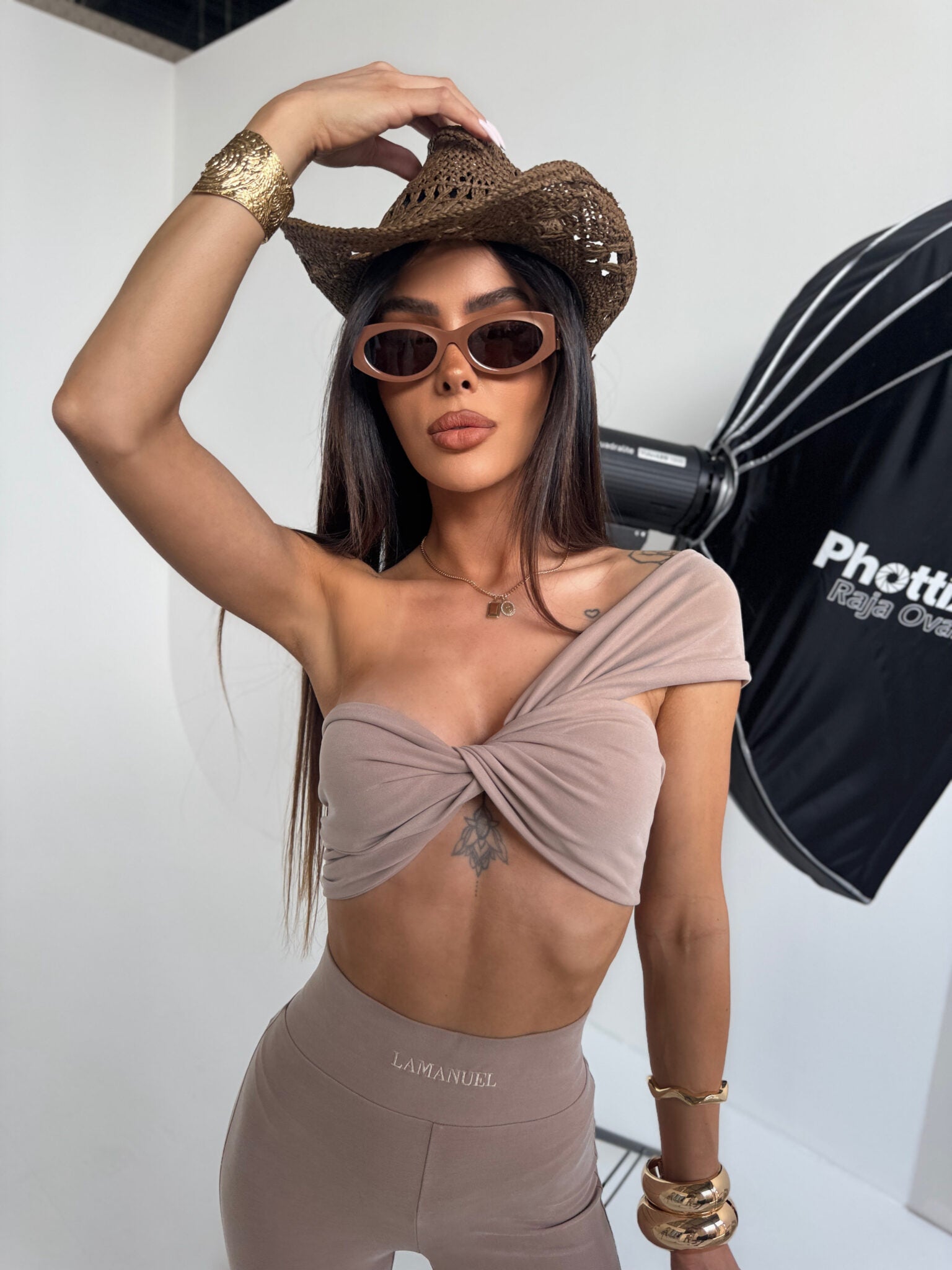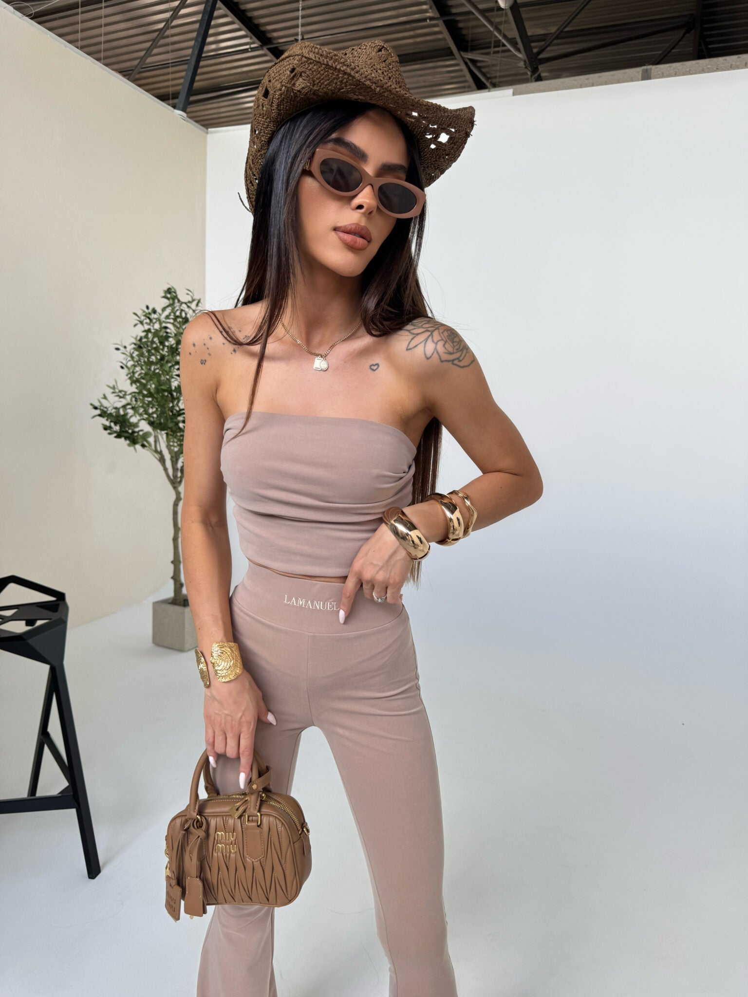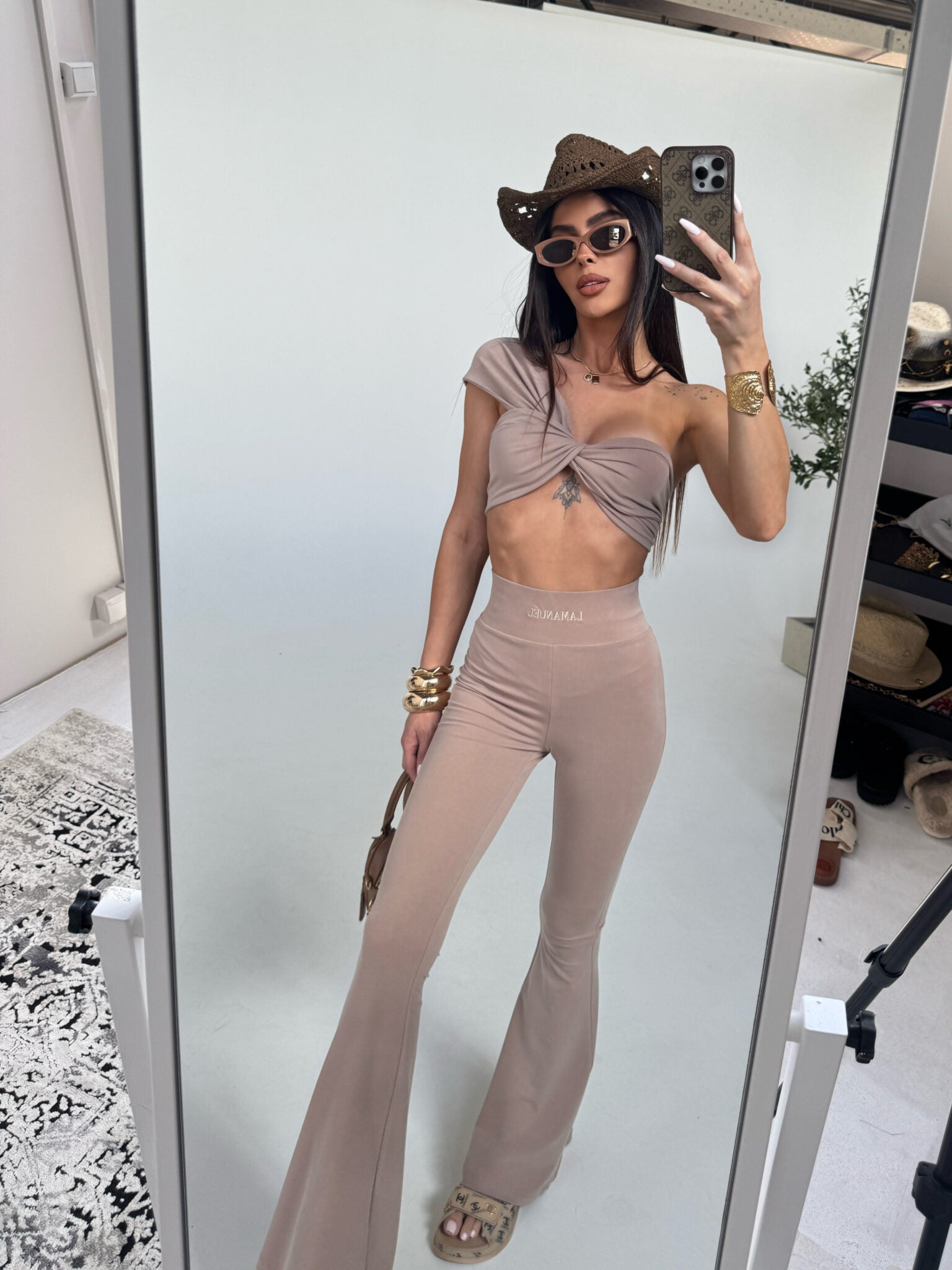 Ein Set aus weicher, elastischer Strickware mit einem taillierten Schnitt, der die Silhouette schön betont. Leggings mit hoher Taille und ausgestelltem Bein, verziert mit einem dezenten LAMANUEL-Logo auf der Vorderseite. Bequem und angenehm zu tragen, perfekt sowohl für urbanes Styling als auch für eine Urlaubsreise. Das Set wird mit einem Mehrweg-Band geliefert - einem breiten, gebundenen Band, das auf viele Arten gestylt werden kann. Es kann als Bandeau-Oberteil, um den Hals gebunden, gekreuzter BH und asymmetrisches Oberteil fungieren. Das flexible Material ermöglicht es Ihnen, sich leicht an die Figur anzupassen, und die Vielseitigkeit der Form ermöglicht es Ihnen, eine Vielzahl von Outfits mit einem Element zu kreieren.