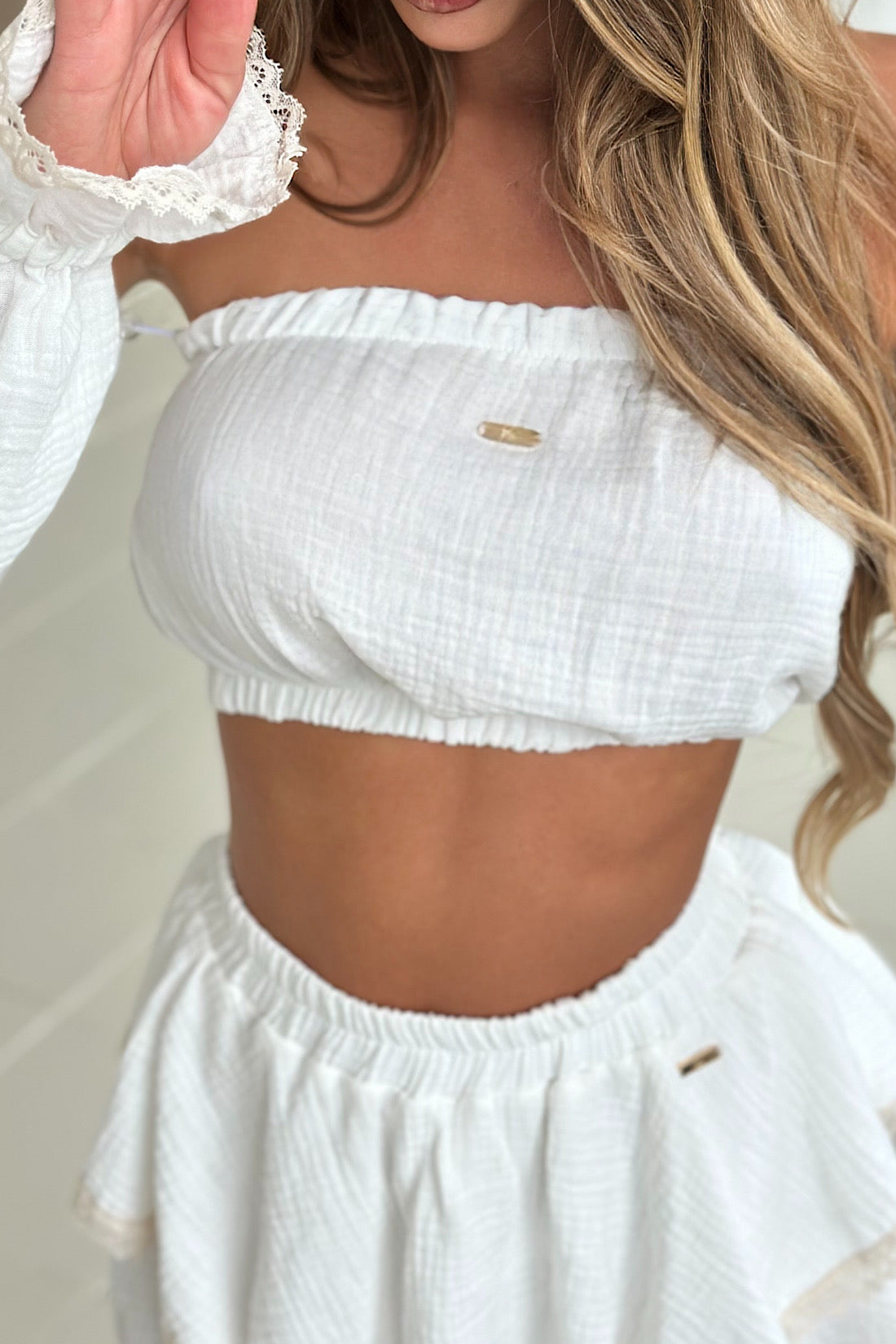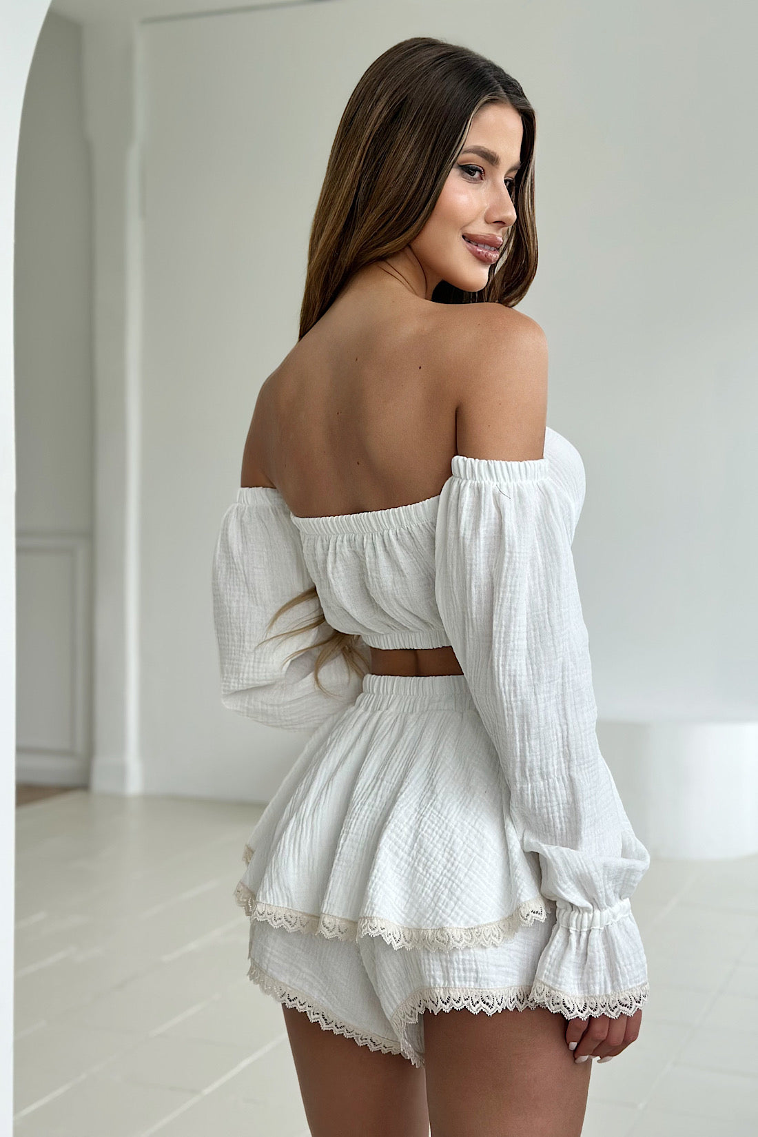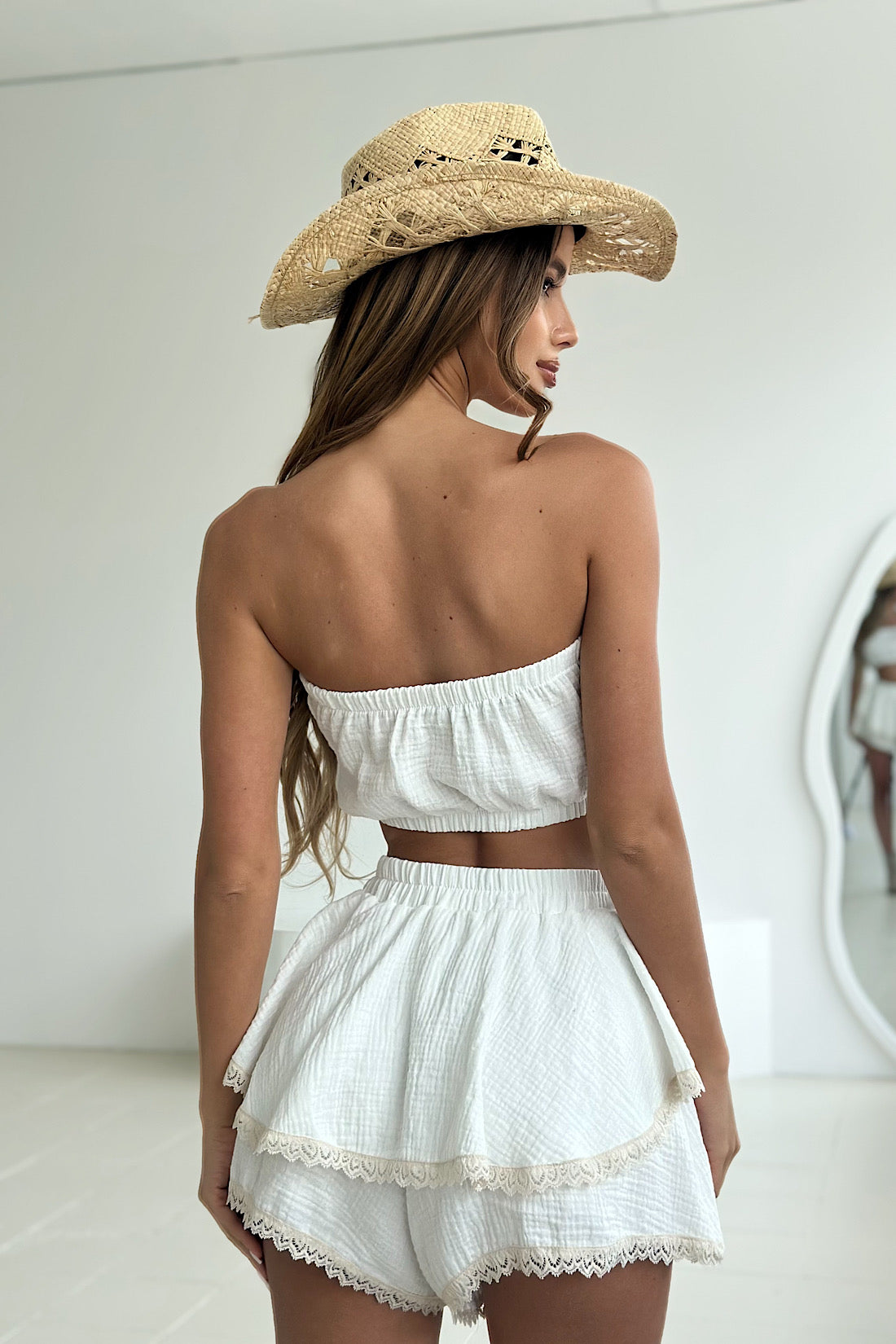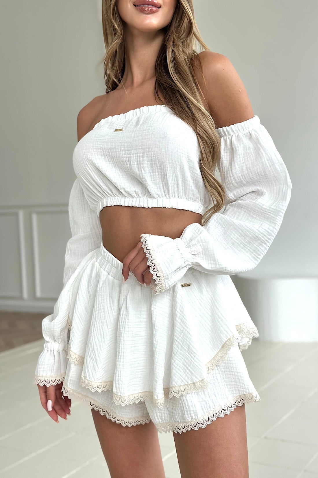 Ein Top mit elastischen Bändern – schmiegt sich perfekt an die Figur und betont Schultern und Dekolleté. Zusätzliche, abnehmbare Ärmel mit zarter, beigefarbener Spitze verleihen dem Set einen einzigartigen Charakter.