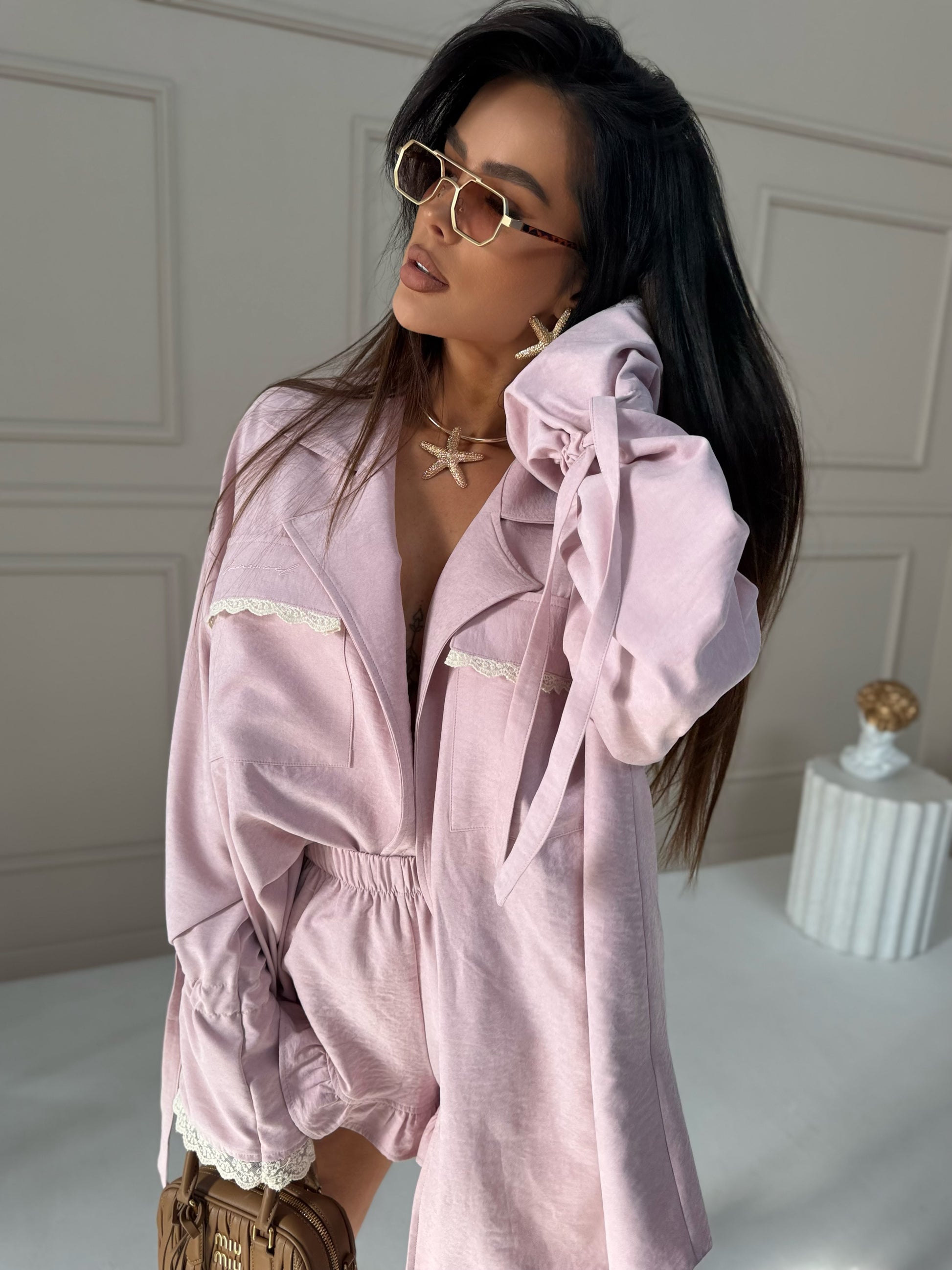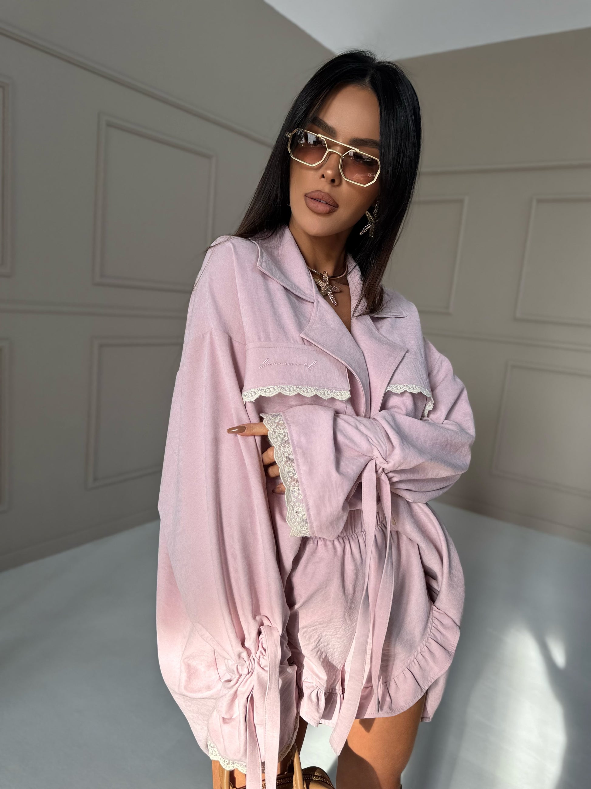 Ein Damenset, das die perfekte Kombination aus Leichtigkeit und dezenter Eleganz ist! Ein Maxishirt mit zartem Spitzenbesatz wirkt äußerst feminin – Sie können es locker, mit einem Gürtel in der Taille gebunden oder aufgeknöpft über einem Top und Jeans tragen. In Kombination mit gerüschten Shorts entsteht ein stimmiger Look, der sowohl für Sommerausflüge als auch für eher lässige Anlässe perfekt ist. Dank des universellen Schnitts können Sie mit Schichten spielen und das Set an Ihren Stil anpassen.
