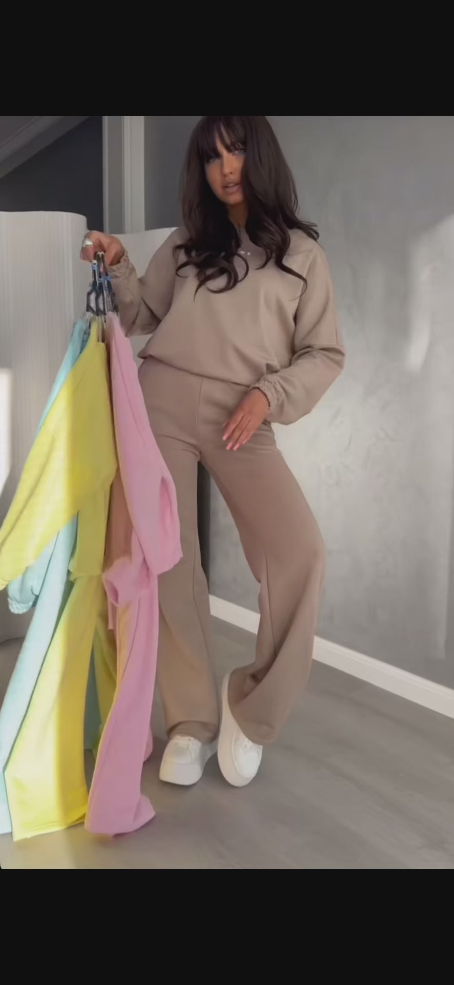 Dieser stylische Zweiteiler kombiniert Komfort mit modernem Design. Das Set besteht aus einem locker geschnittenen Sweatshirt mit elastischen Bündchen und einer passenden Jogginghose mit elastischem Bund und weitem Bein. Der weiche Stoff sorgt für ein angenehmes Tragegefühl, während der lässige Schnitt perfekt für den Alltag, entspannte Tage zu Hause oder einen trendigen Streetstyle-Look ist. Kombiniere das Set mit Sneakern für einen sportlich-eleganten Auftritt.