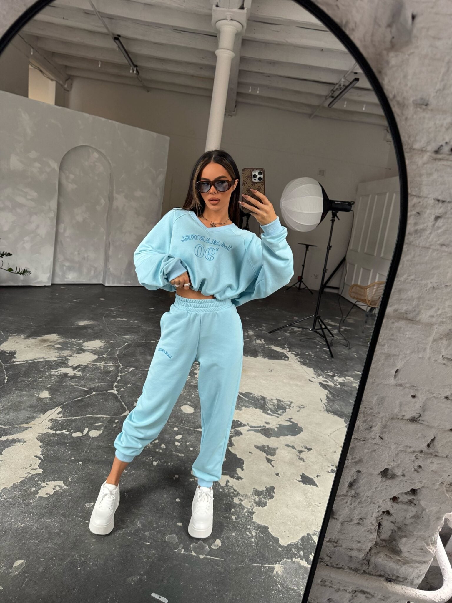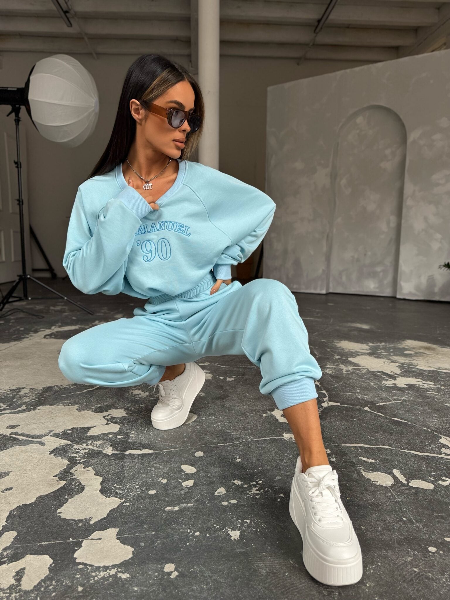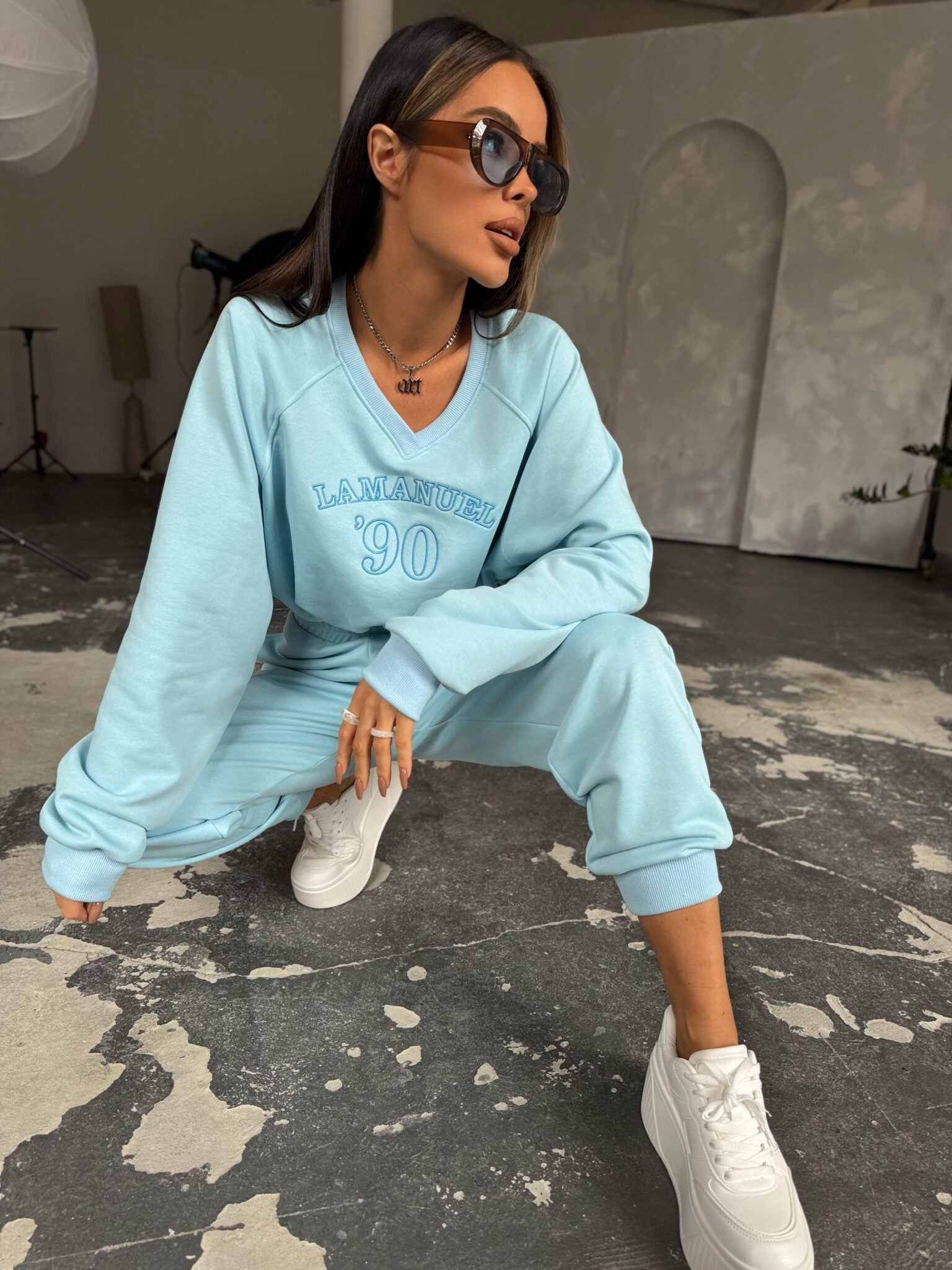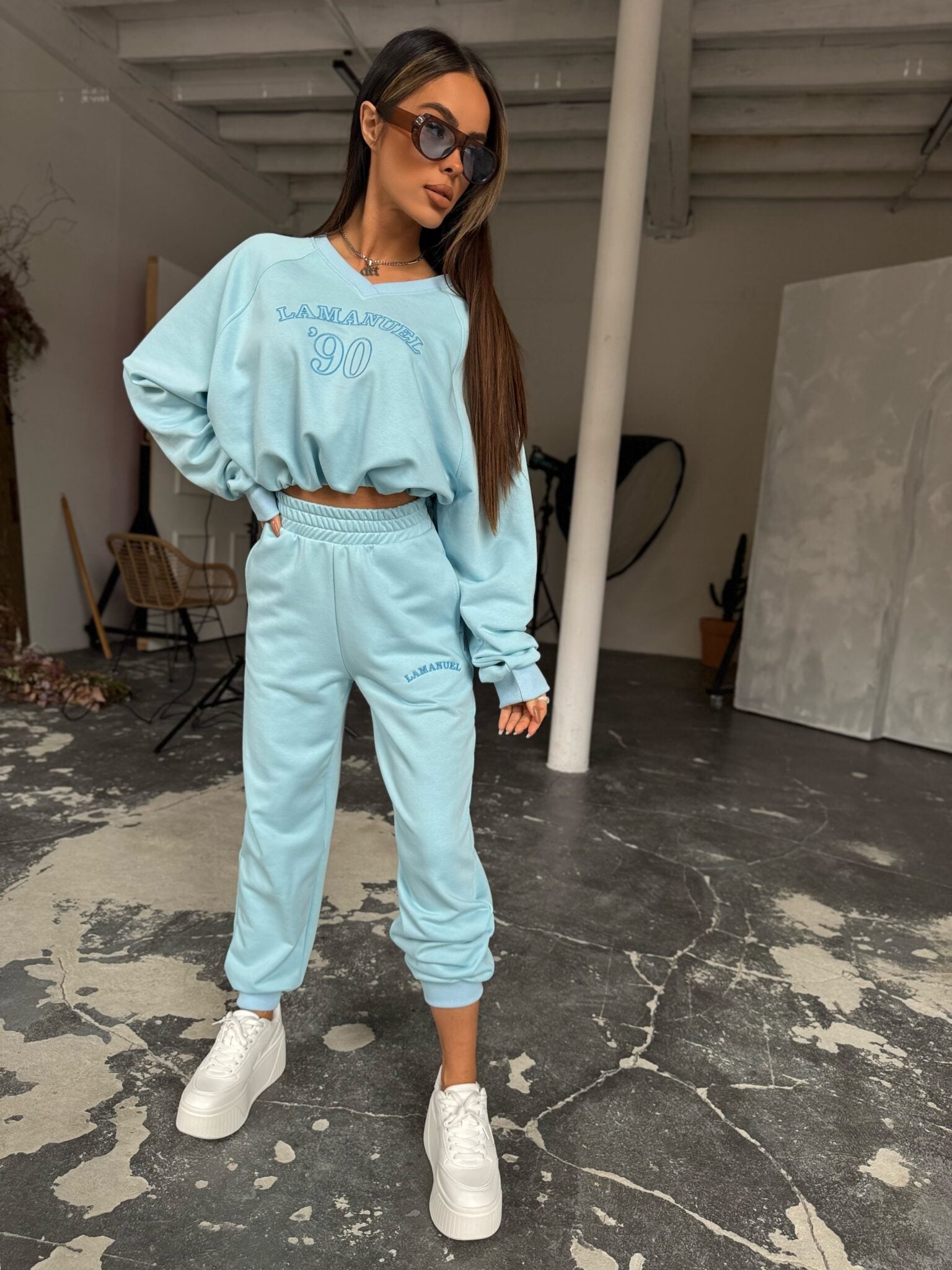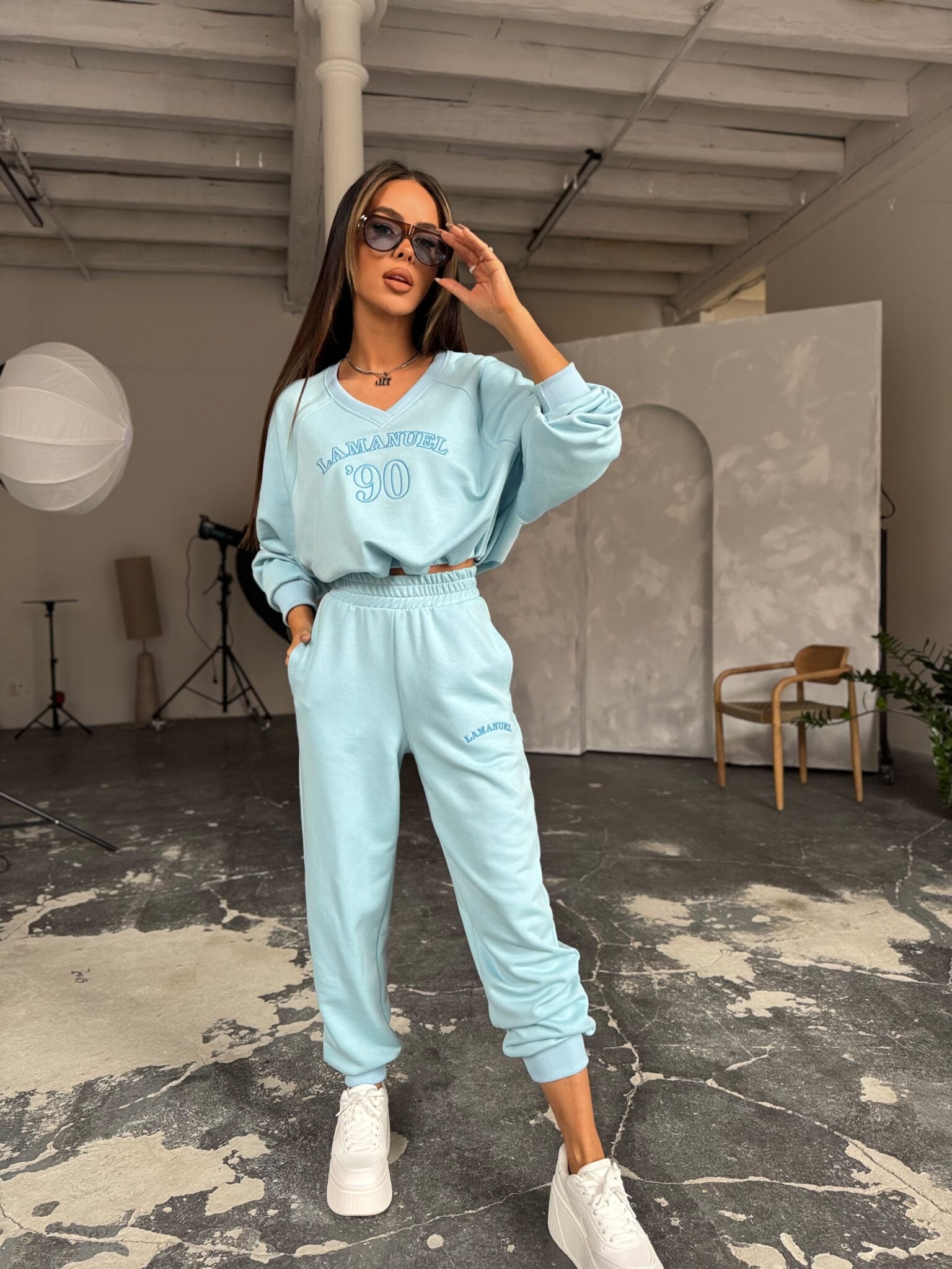 Damen-Trainingsanzug-Set. Ein Sweatshirt mit V-Ausschnitt ohne Kapuze sorgt für Leichtigkeit und betont den Hals dezent, während der lockere Schnitt Bewegungsfreiheit bietet. Klassische Jogginghosen mit Taschen passen sich perfekt der Figur an, ohne an Komfort einzubüßen. Dies ist ein Set, das sowohl im Alltag als auch in raffinierteren Stilen gut funktioniert