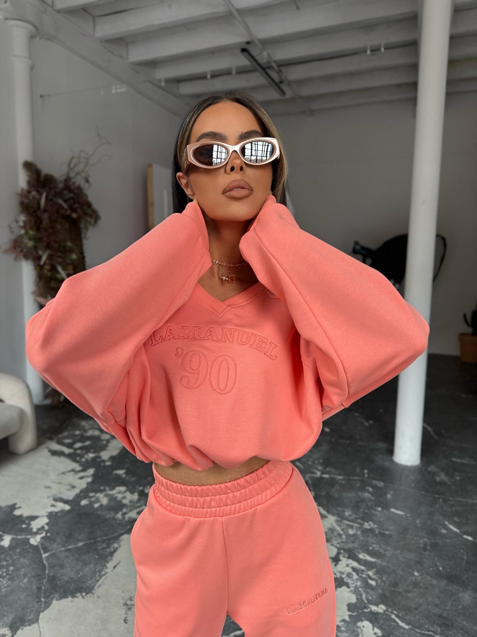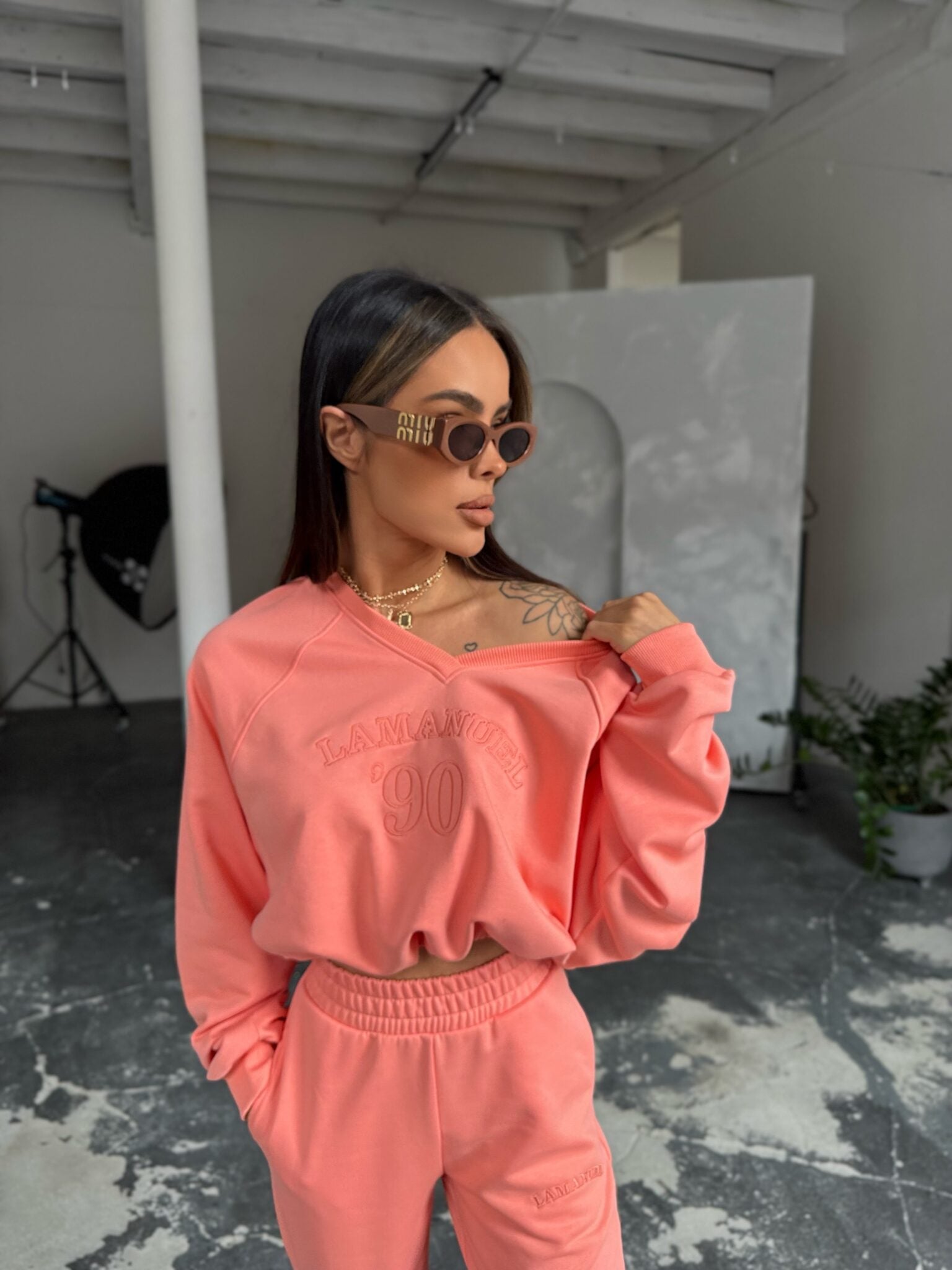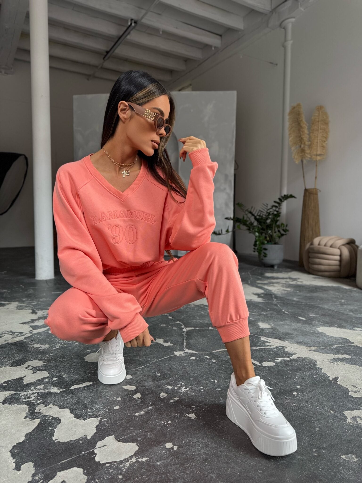 Damen-Trainingsanzug-Set. Ein Sweatshirt mit V-Ausschnitt ohne Kapuze sorgt für Leichtigkeit und betont den Hals dezent, während der lockere Schnitt Bewegungsfreiheit bietet. Klassische Jogginghosen mit Taschen passen sich perfekt der Figur an, ohne an Komfort einzubüßen. Dies ist ein Set, das sowohl im Alltag als auch in raffinierteren Stilen gut funktioniert