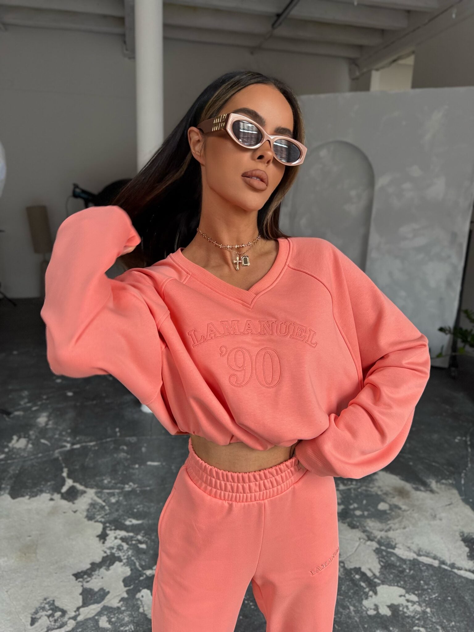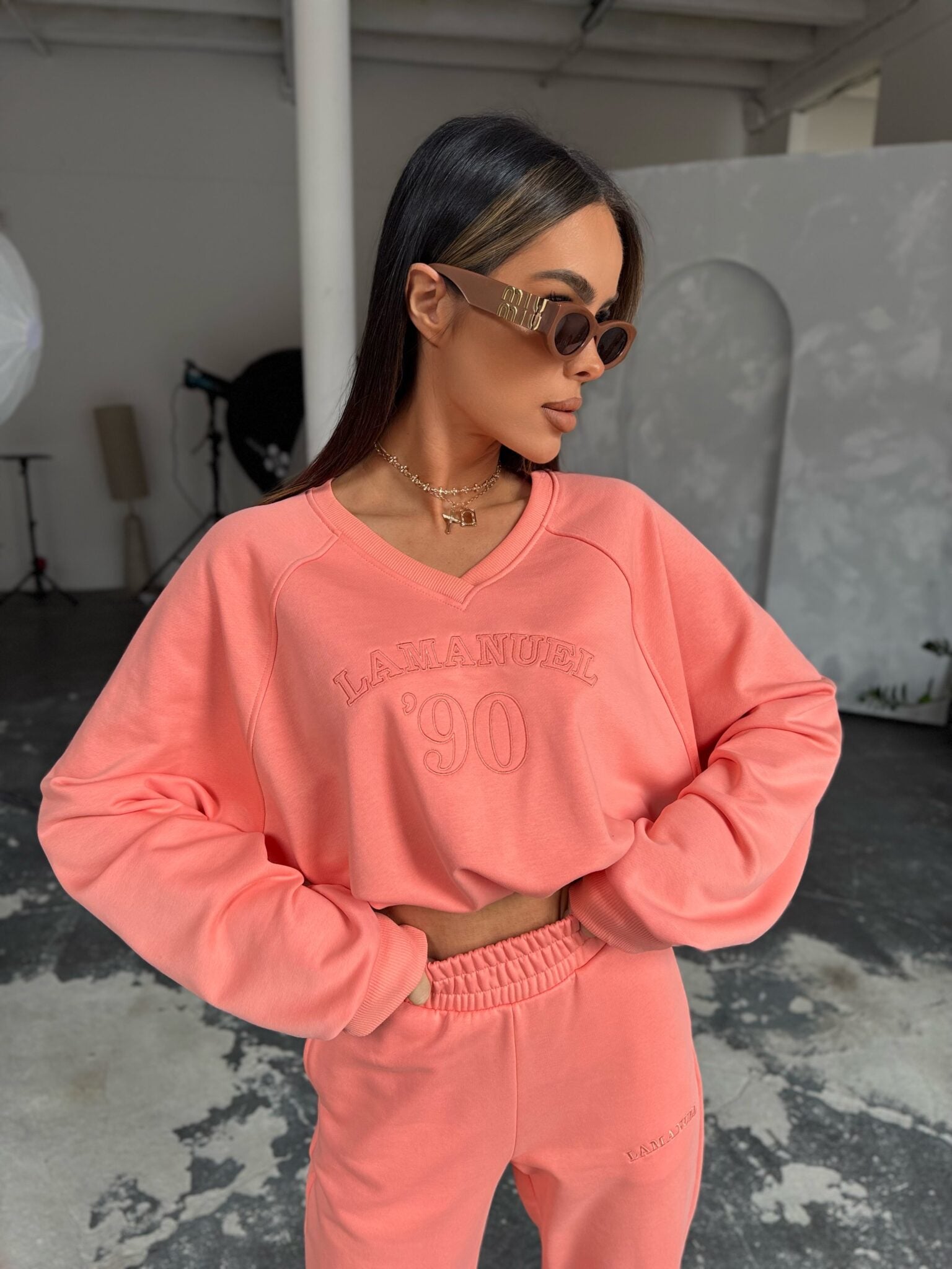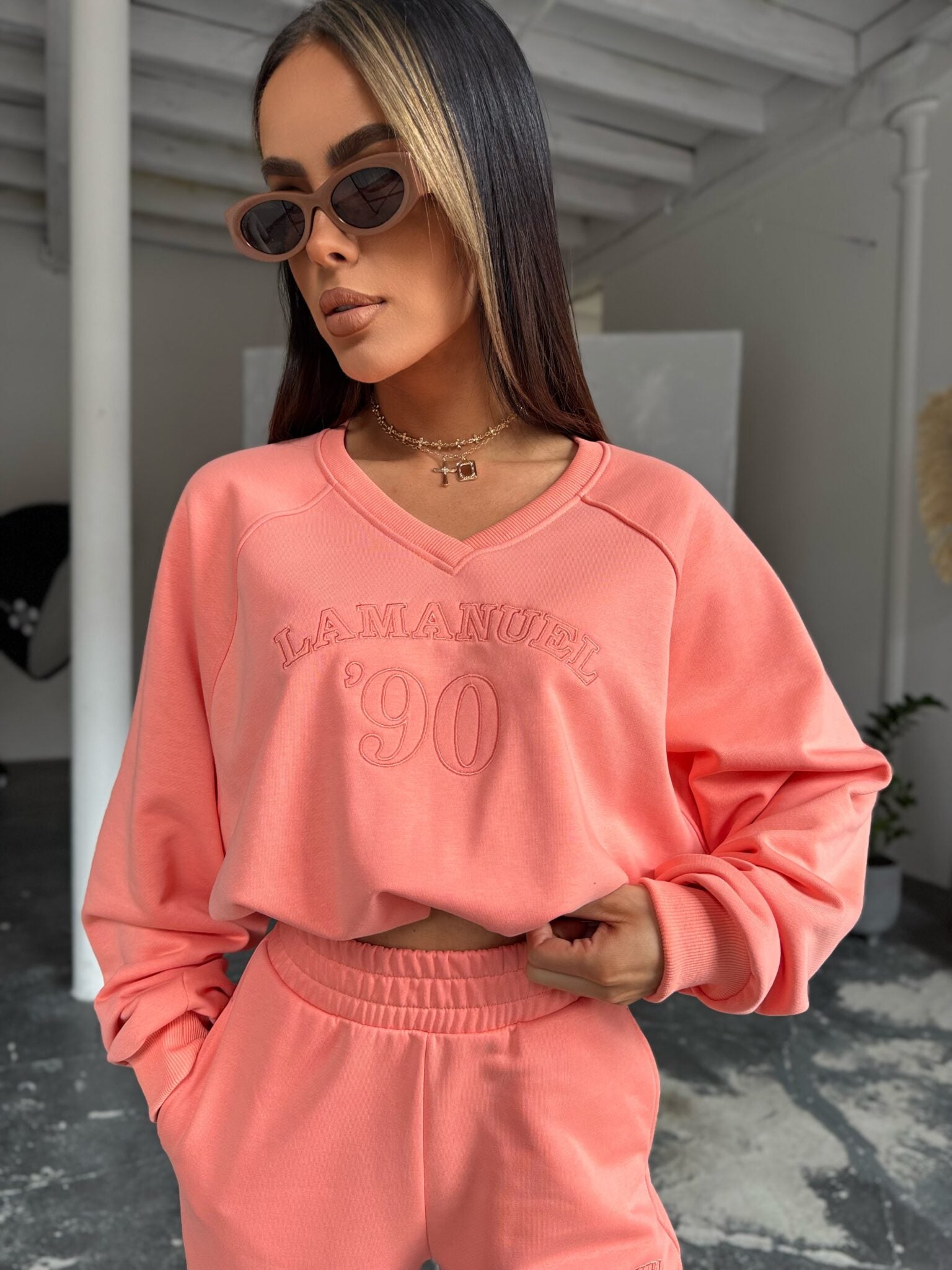 Damen-Trainingsanzug-Set. Ein Sweatshirt mit V-Ausschnitt ohne Kapuze sorgt für Leichtigkeit und betont den Hals dezent, während der lockere Schnitt Bewegungsfreiheit bietet. Klassische Jogginghosen mit Taschen passen sich perfekt der Figur an, ohne an Komfort einzubüßen. Dies ist ein Set, das sowohl im Alltag als auch in raffinierteren Stilen gut funktioniert