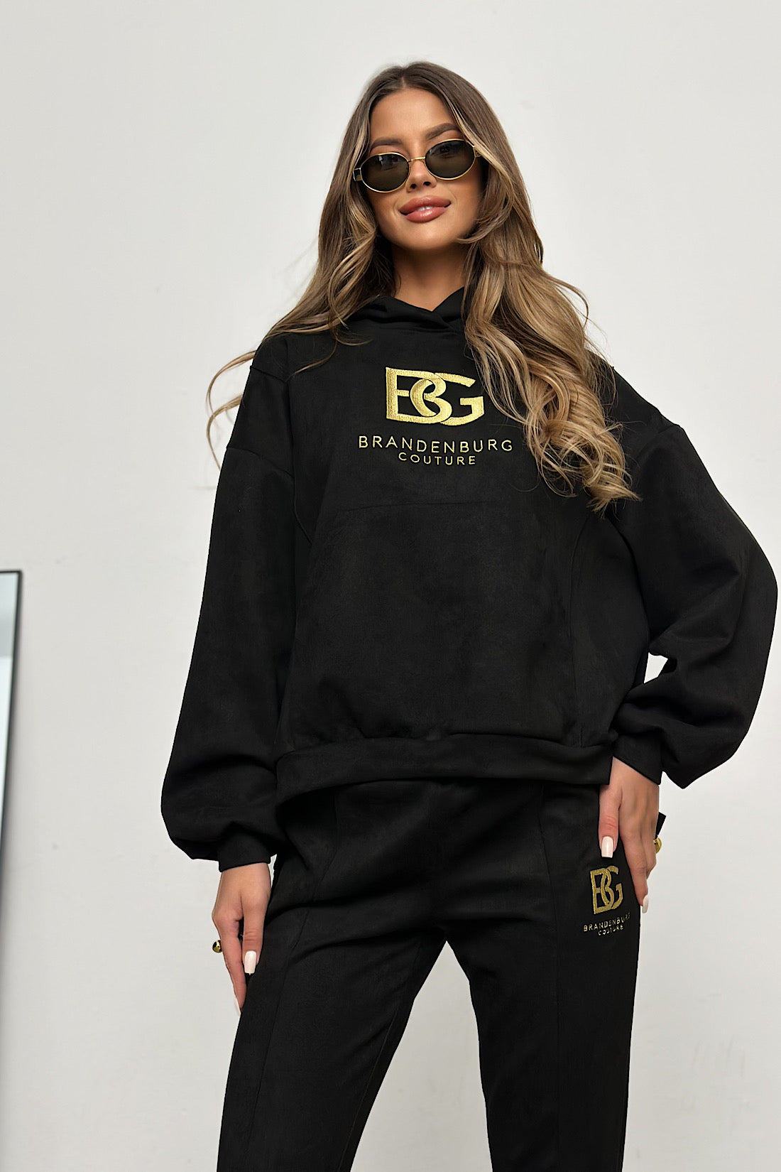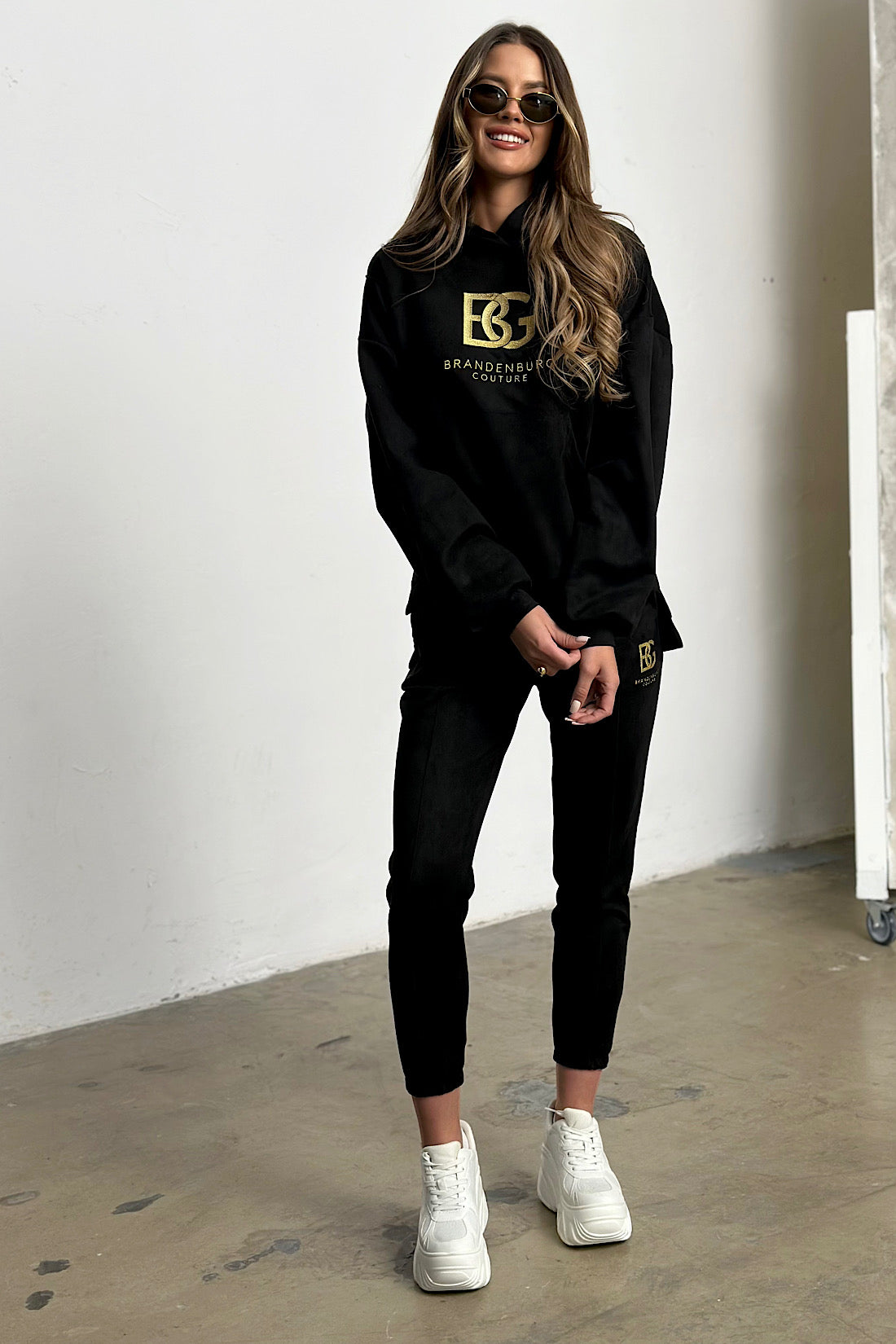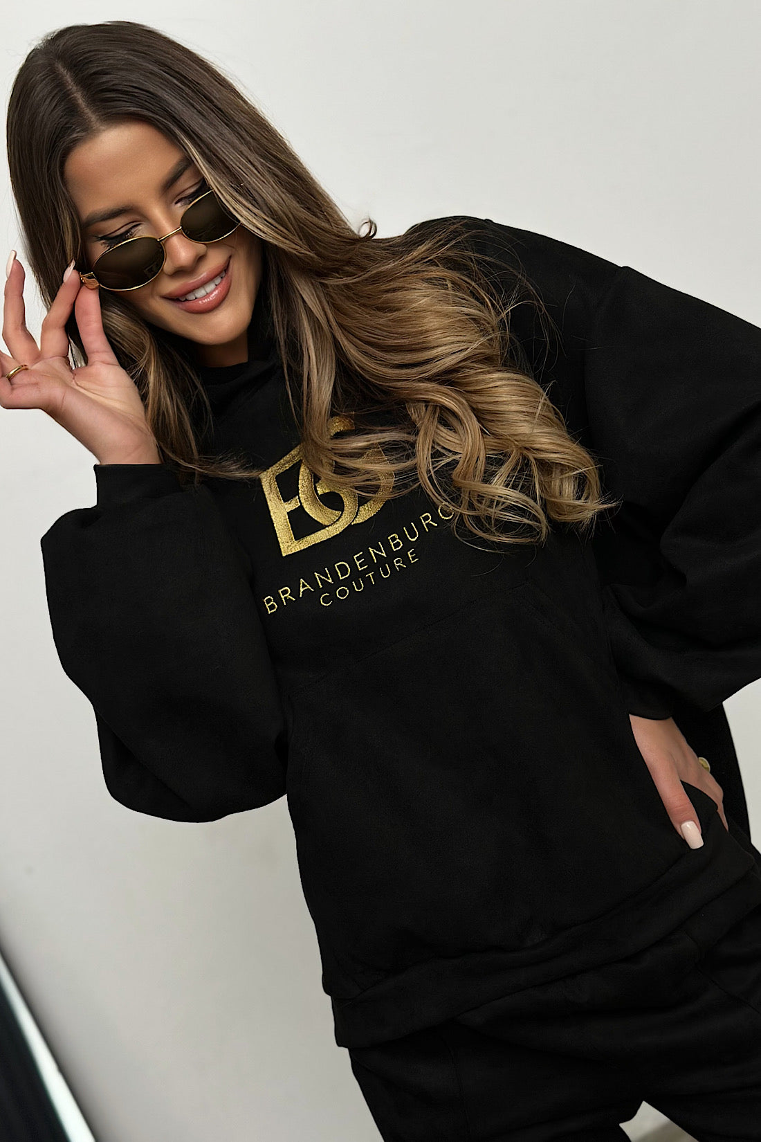 Produktbeschreibung: BG ROYAL SUEDE Wildlederset in Schwarz. Kapuzen-Känguru-Sweatshirt, verziert mit einem großen gestickten goldenen Logo von BG BRANDENBURG COUTURE. Die Hose hat einen elastischen Bund. Gesticktes goldenes Markenlogo auf der linken Tasche der Hose. Übergroßer Schnitt. Dekorative Nähte an Sweatshirt und Hose. Das Model trägt Größe S.