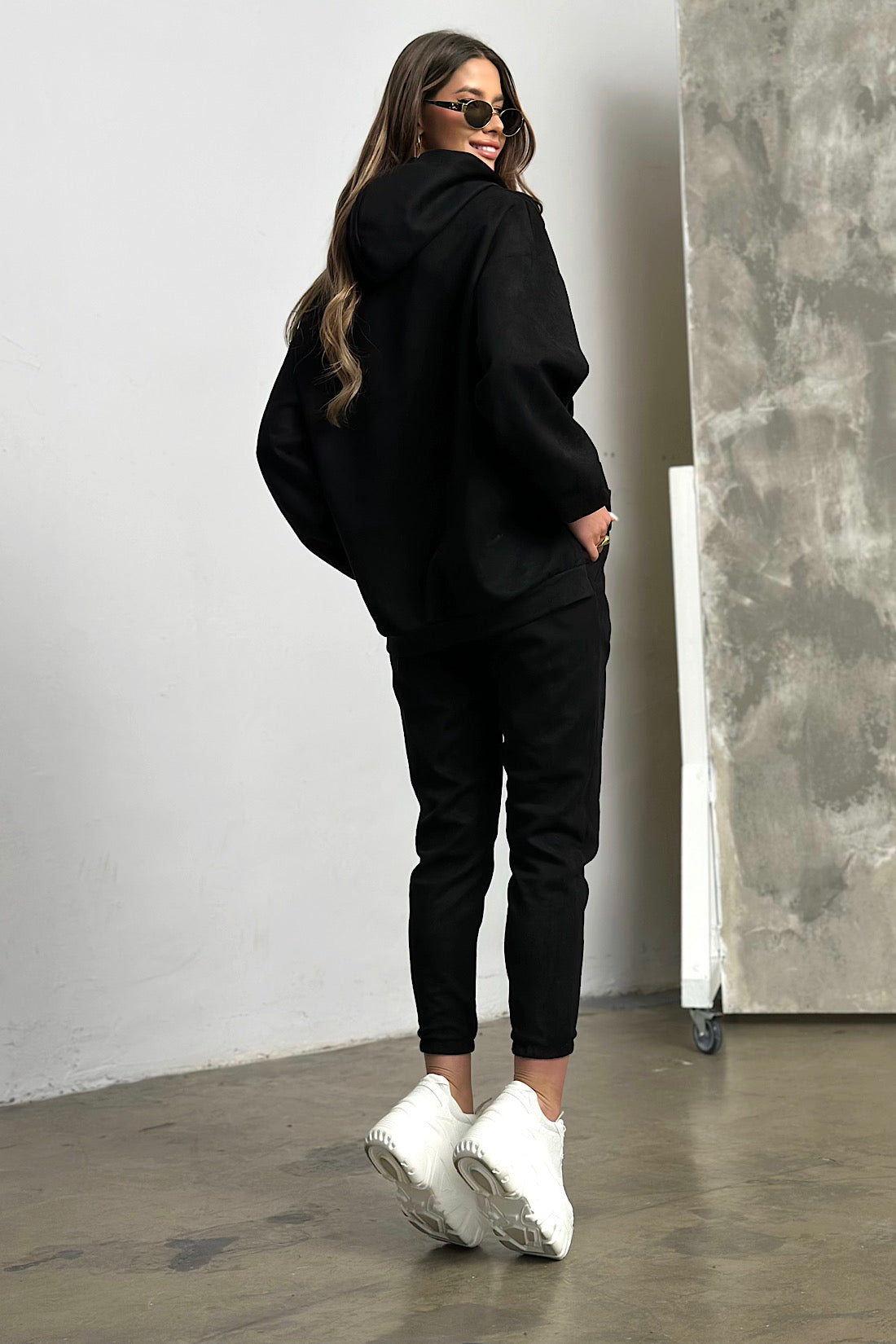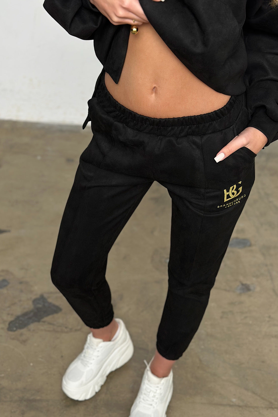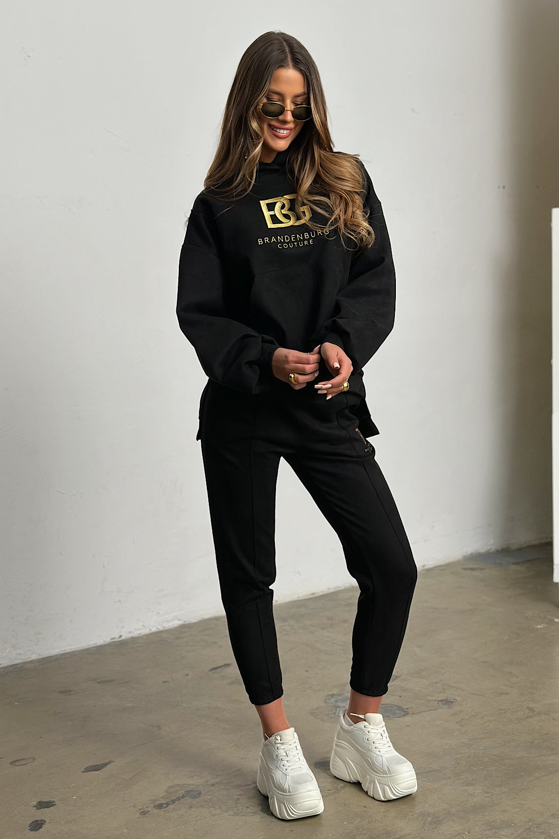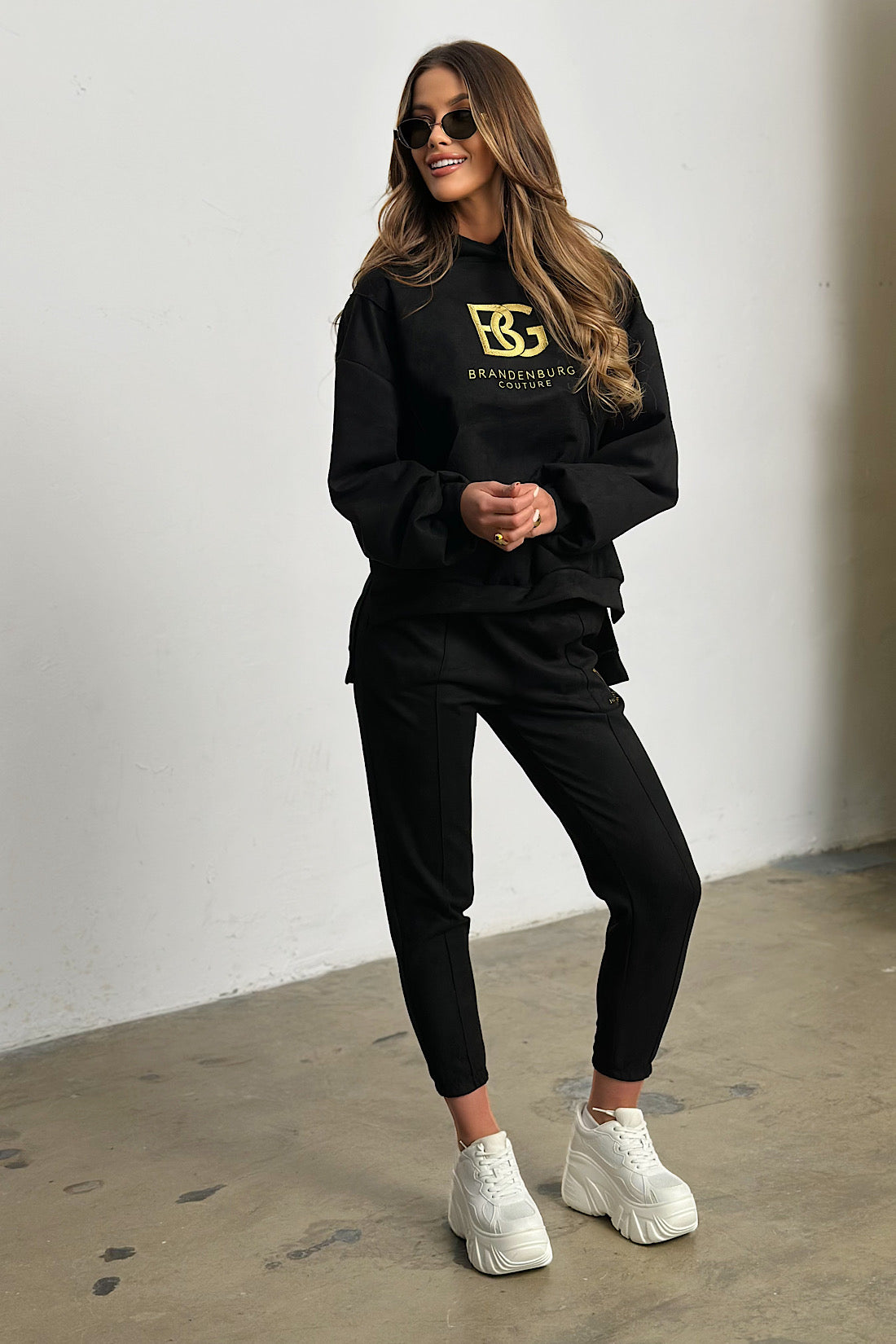 Produktbeschreibung: BG ROYAL SUEDE Wildlederset in Schwarz. Kapuzen-Känguru-Sweatshirt, verziert mit einem großen gestickten goldenen Logo von BG BRANDENBURG COUTURE. Die Hose hat einen elastischen Bund. Gesticktes goldenes Markenlogo auf der linken Tasche der Hose. Übergroßer Schnitt. Dekorative Nähte an Sweatshirt und Hose. Das Model trägt Größe S.