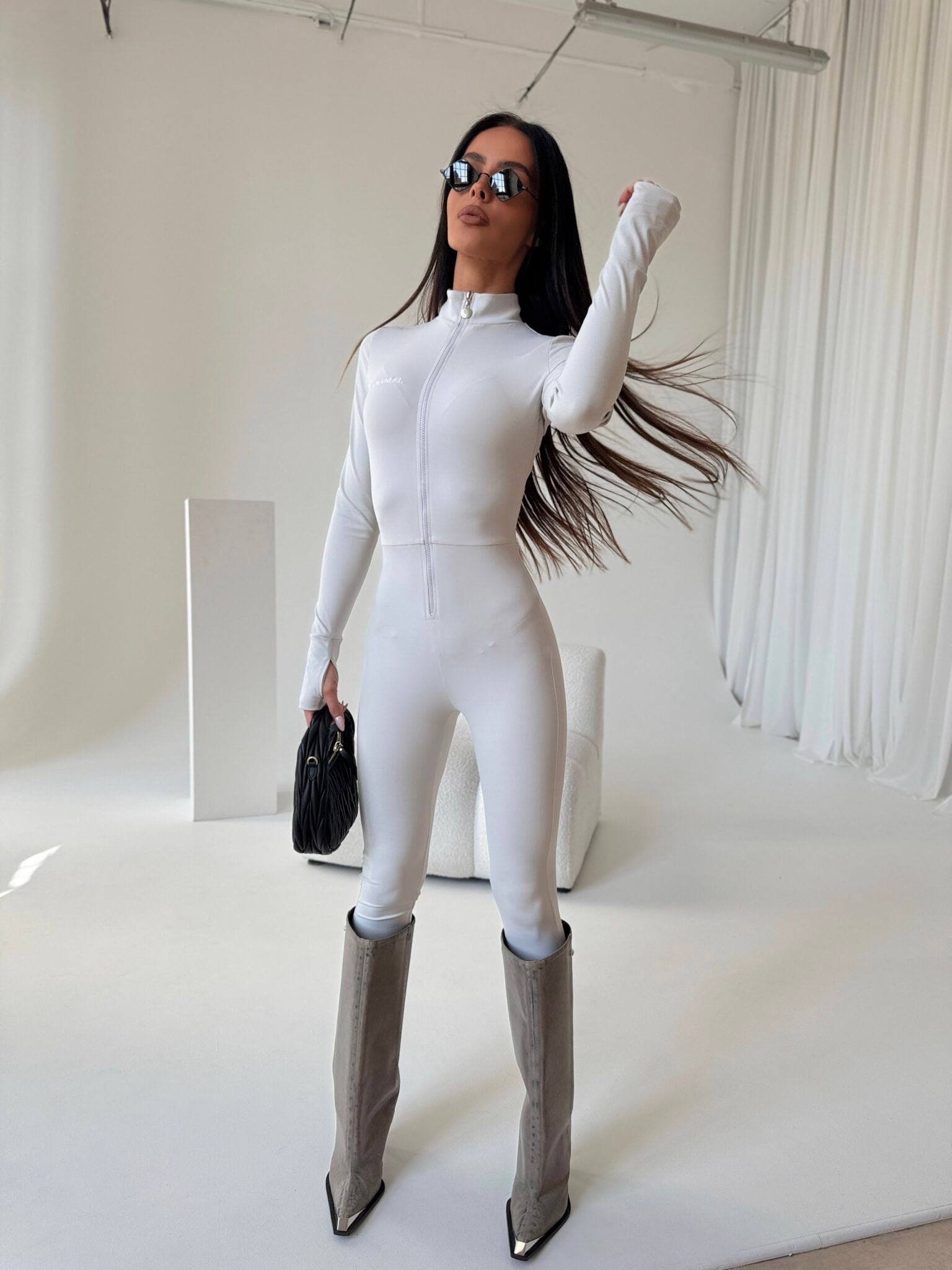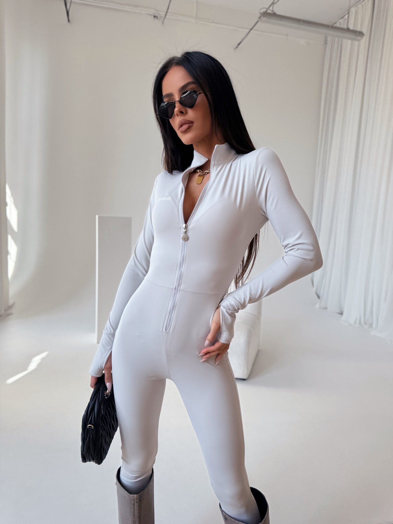 Ein stylischer und femininer Lycra-Overall, der durch seinen taillierten Schnitt die Figur betont. Aus flexiblem Material gefertigt, schmiegt es sich perfekt an den Körper an und sorgt für Komfort und Bewegungsfreiheit. Der lange Ärmel sorgt für Eleganz und der praktische Reißverschluss vorne erleichtert das Anziehen und ermöglicht die Anpassung der Ausschnitttiefe. Perfekt sowohl für den täglichen Gebrauch als auch für Abendausflüge. Fügen Sie einfach Ihre Lieblingsschuhe und -Accessoires hinzu, um einen modischen, auffälligen Look zu kreieren!