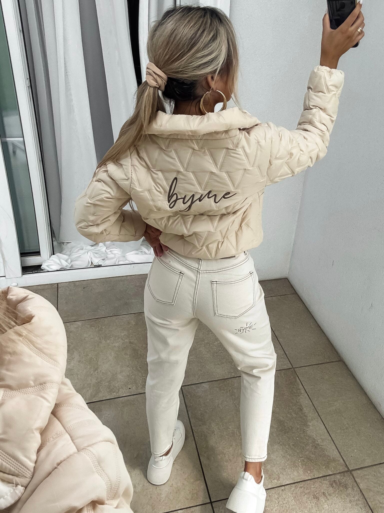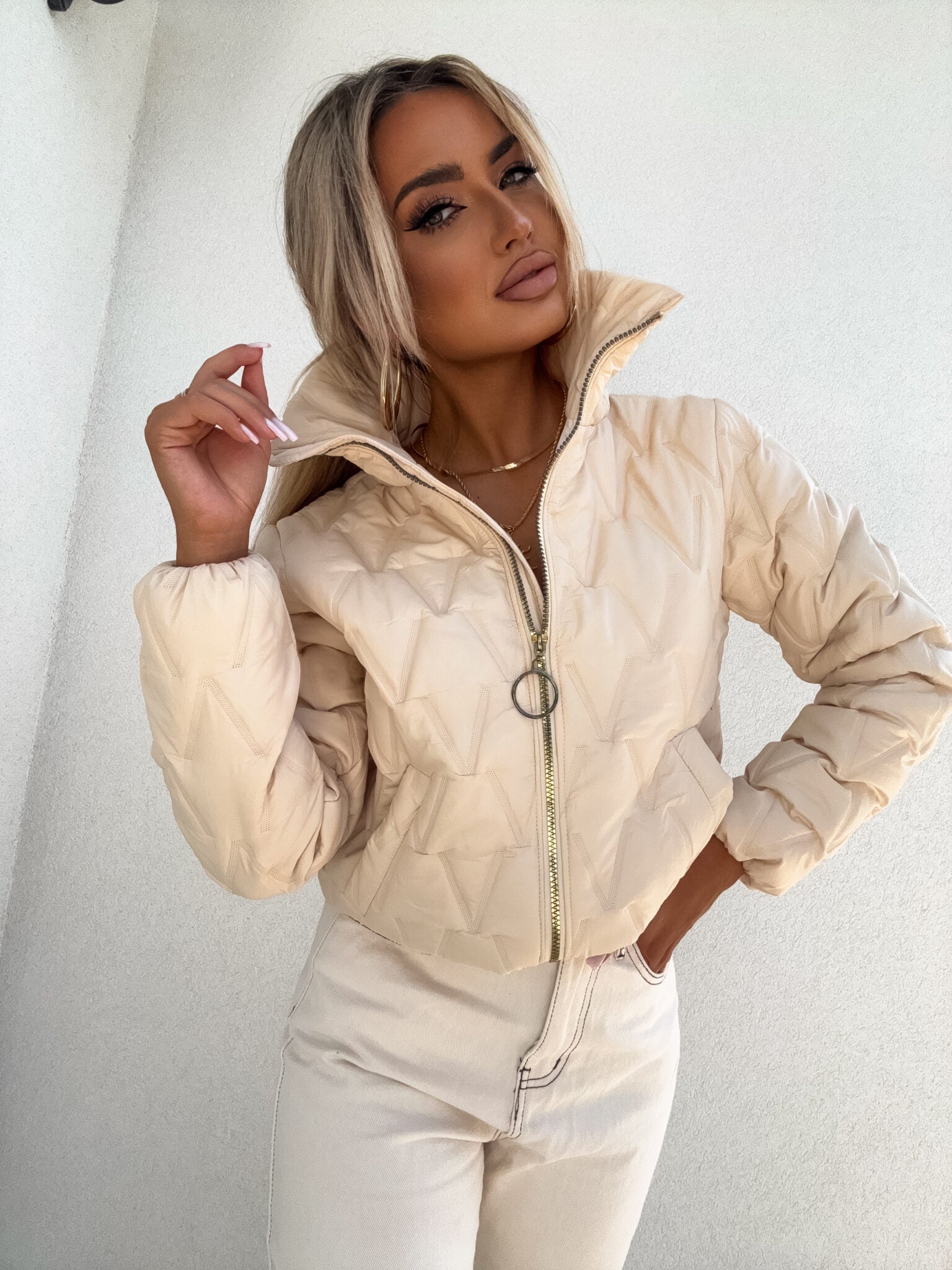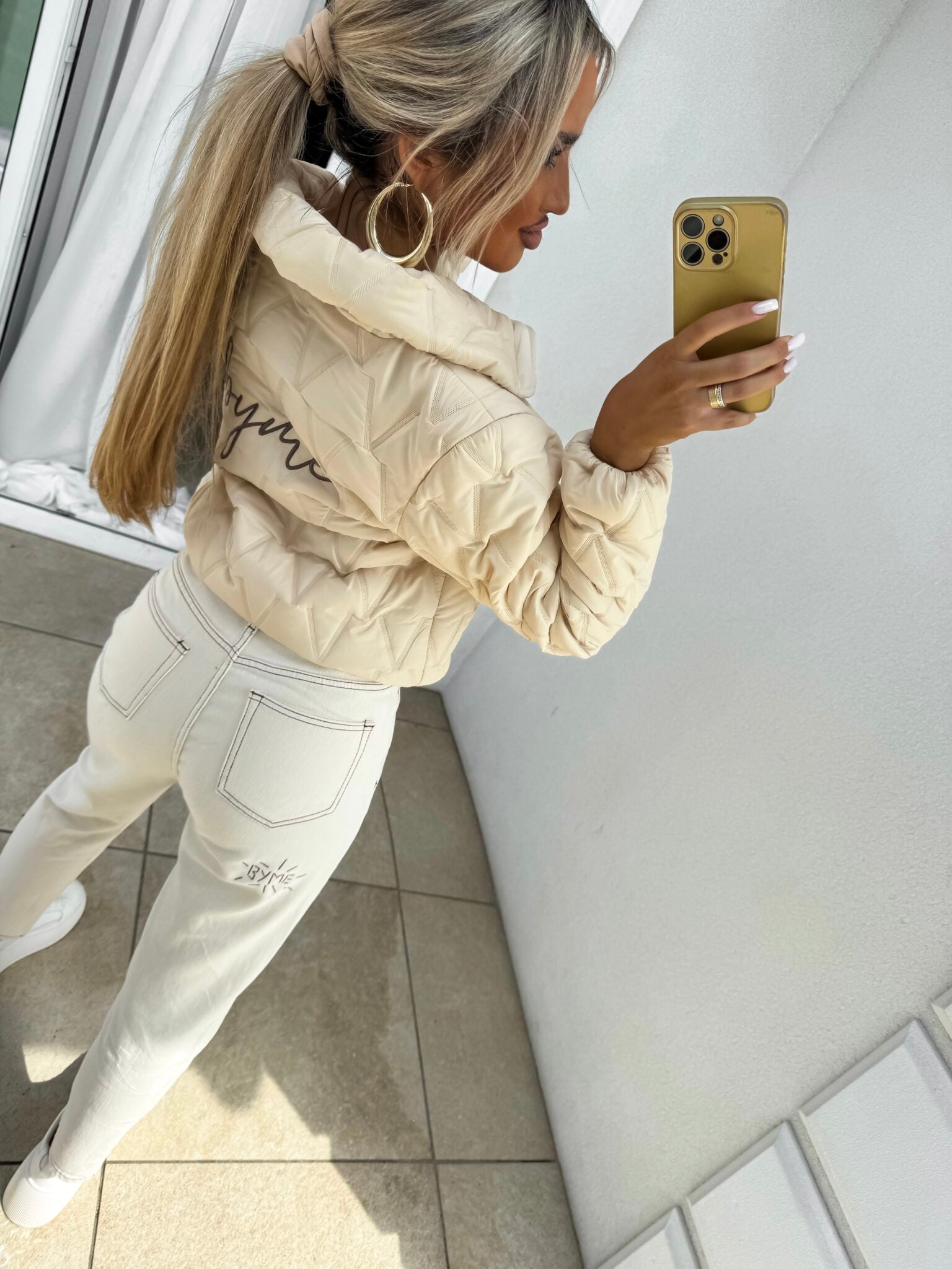 Kurze Jacke aus gestepptem Material. Mit einem goldenen Reißverschluss befestigt. Die Jacke hat Taschen, einen Kordelzug an den Ärmeln und einen Stehkragen.