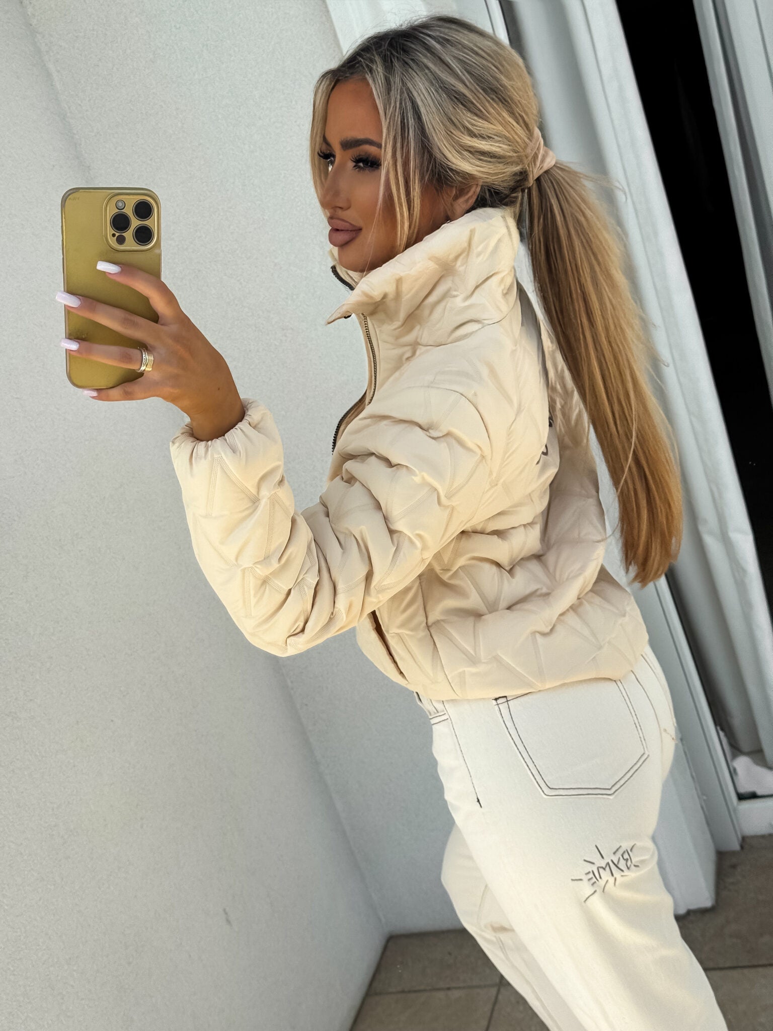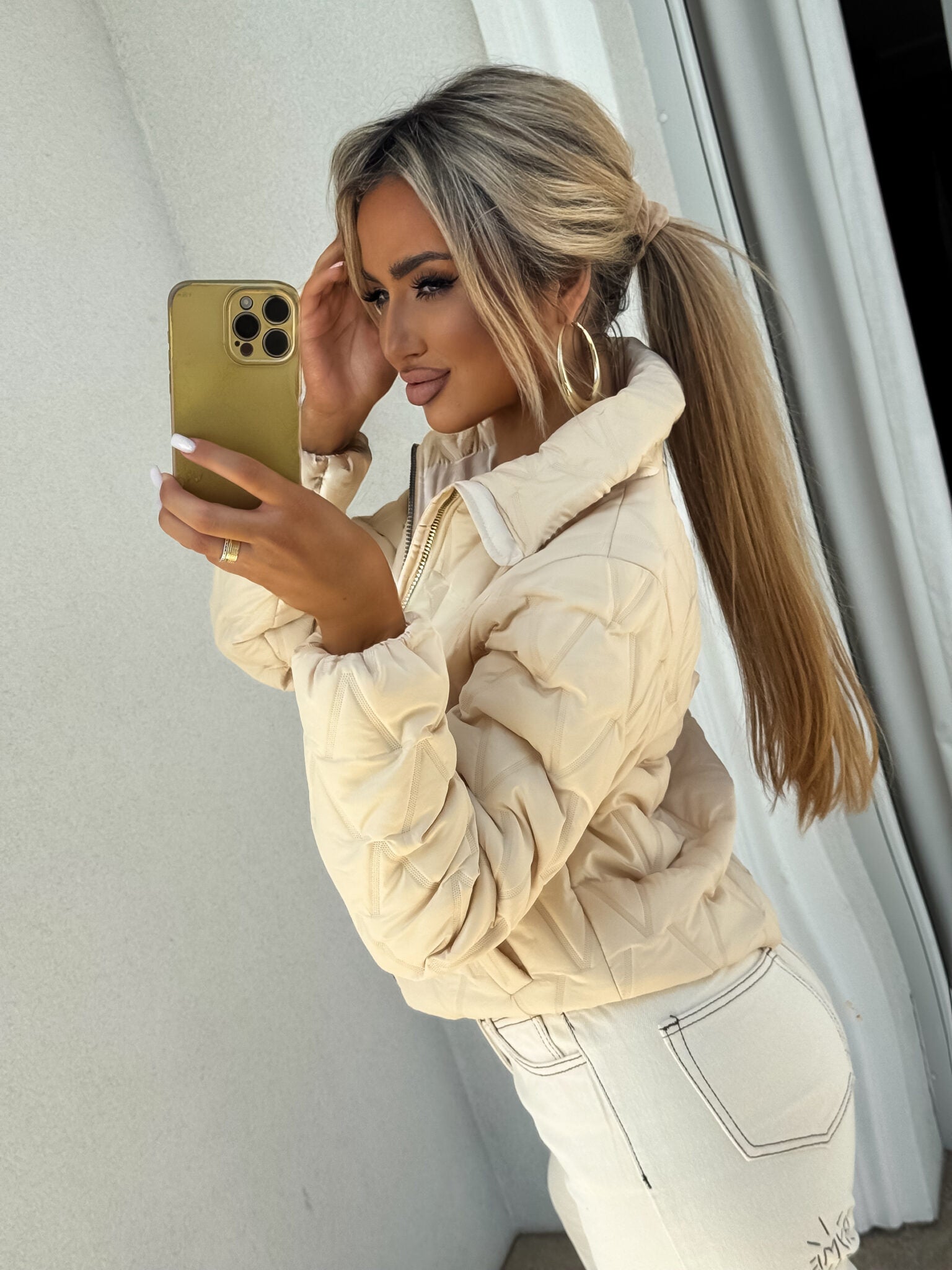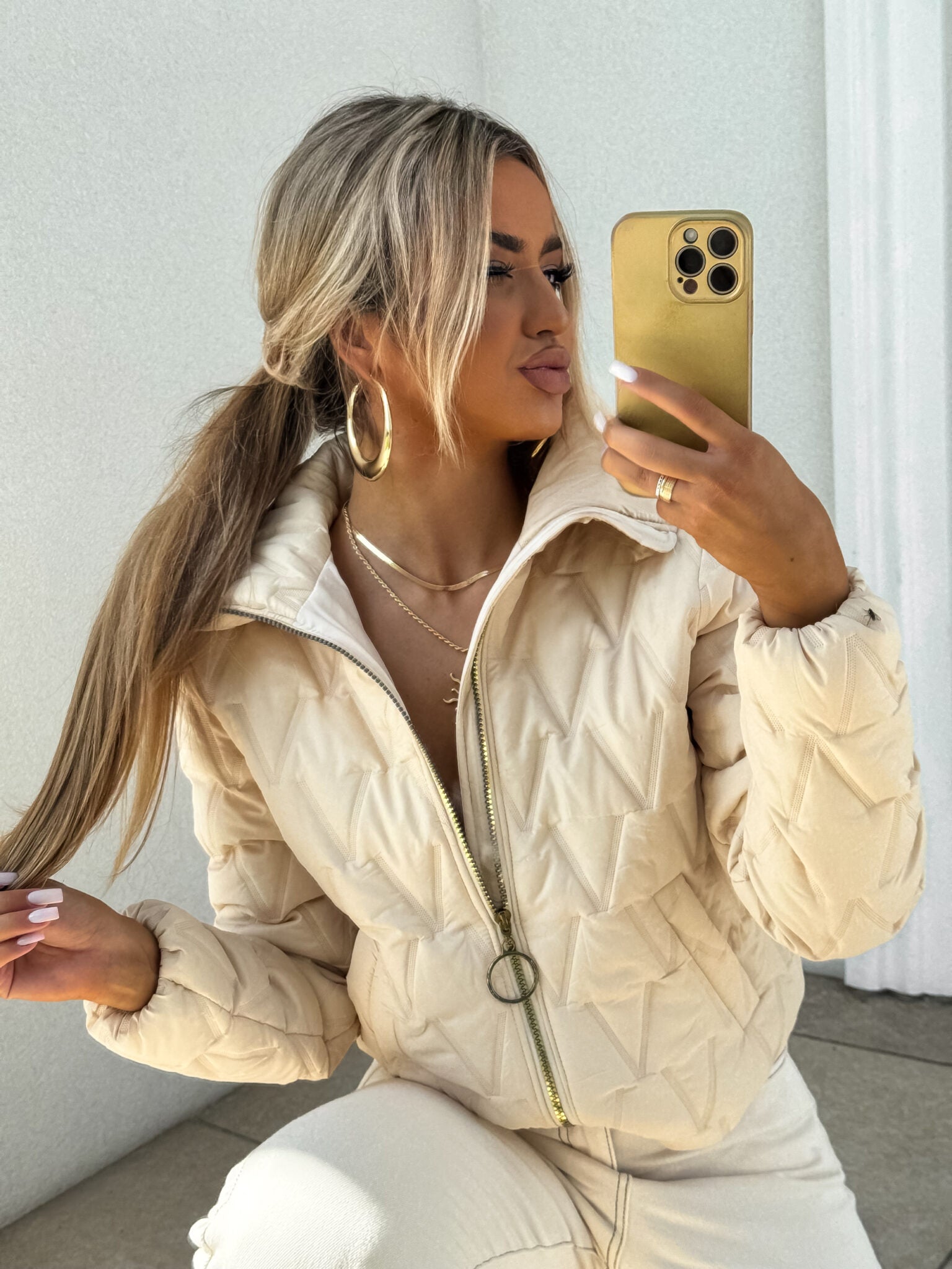 Kurze Jacke aus gestepptem Material. Mit einem goldenen Reißverschluss befestigt. Die Jacke hat Taschen, einen Kordelzug an den Ärmeln und einen Stehkragen.