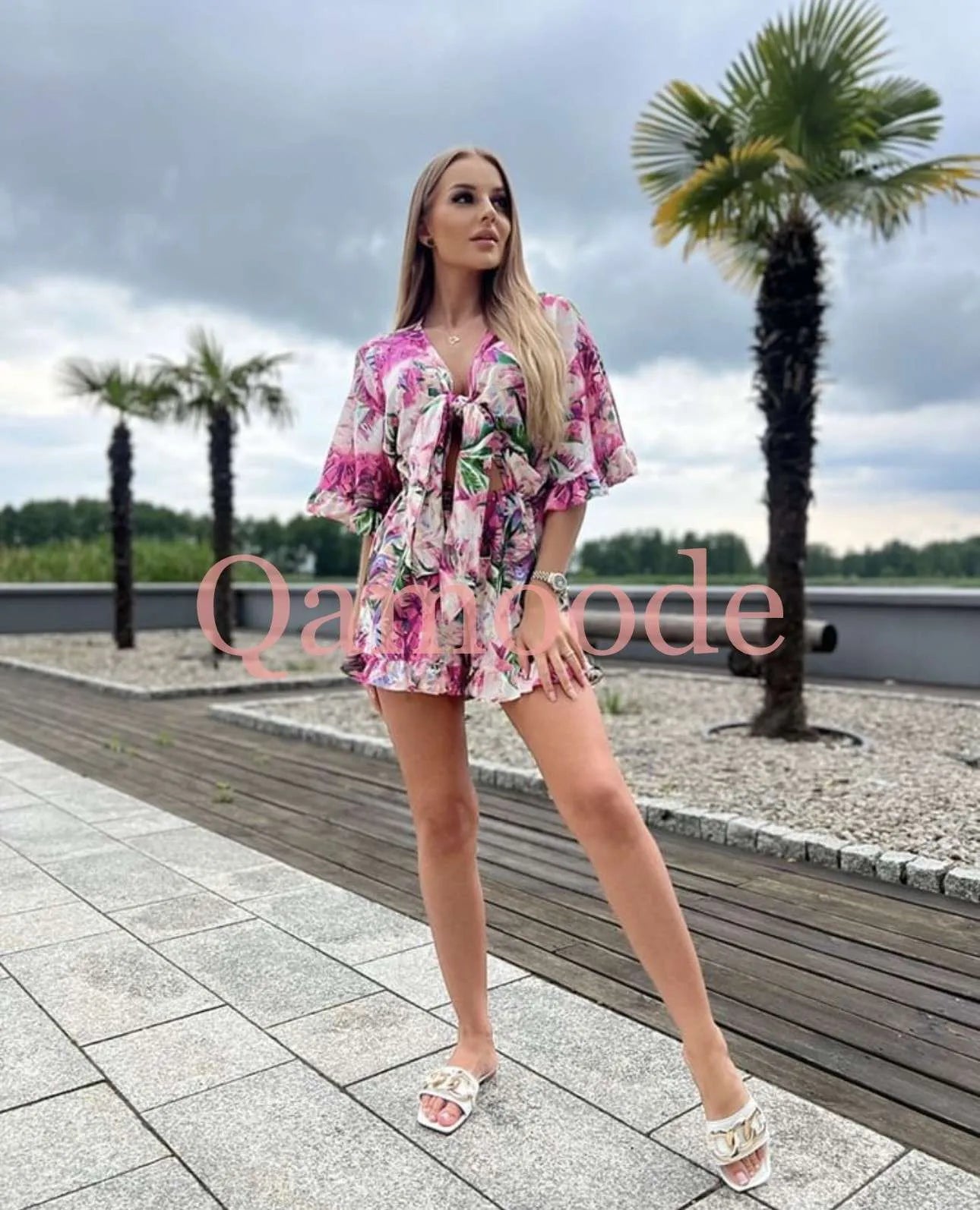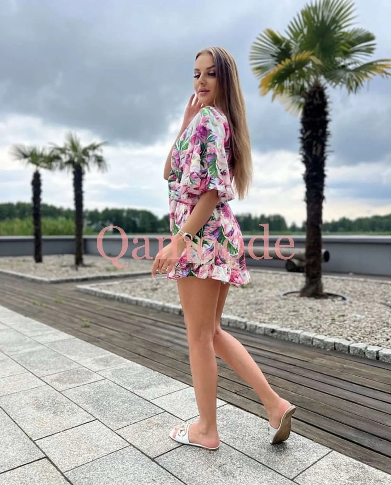 Kurze Hosenbeine und lockere Ärmel mit dekorativen Volants abgeschlossen.