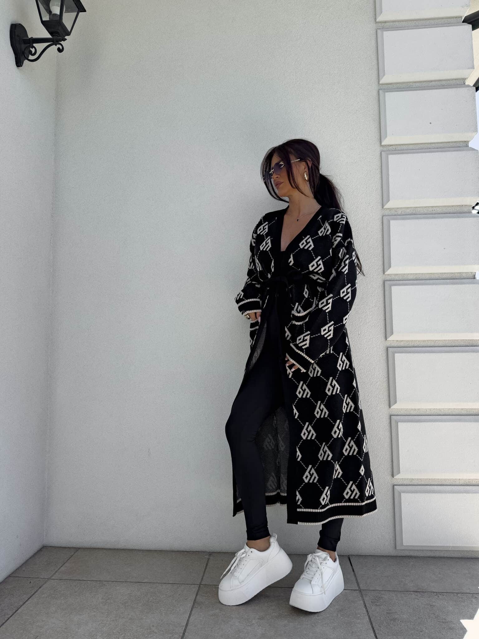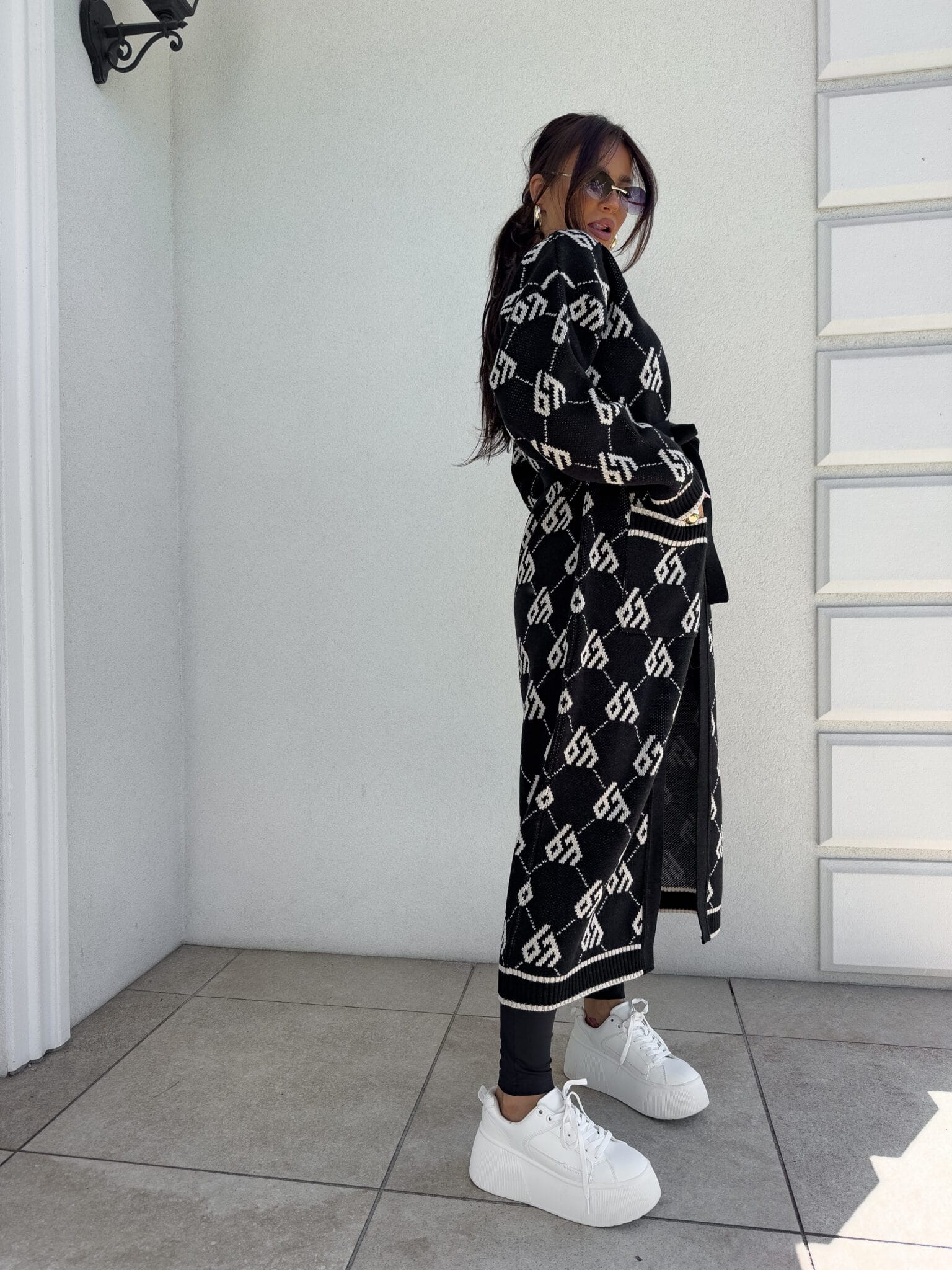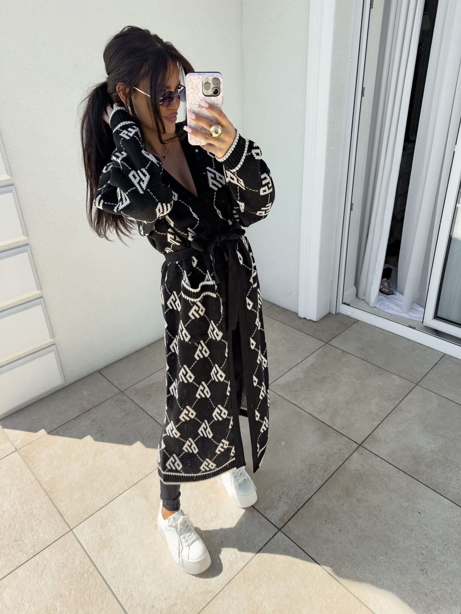 Ein stilvoller, langer Strickmantel, der fast bis zu den Knöcheln reicht, perfekt für kältere Tage. Der klassische, leicht lockere Schnitt sorgt für Komfort, und der um die Taille gebundene Gürtel betont die Silhouette wunderschön. Das Ganze ist mit einem regelmäßig angeordneten Logo auf der gesamten Oberfläche des Materials verziert.