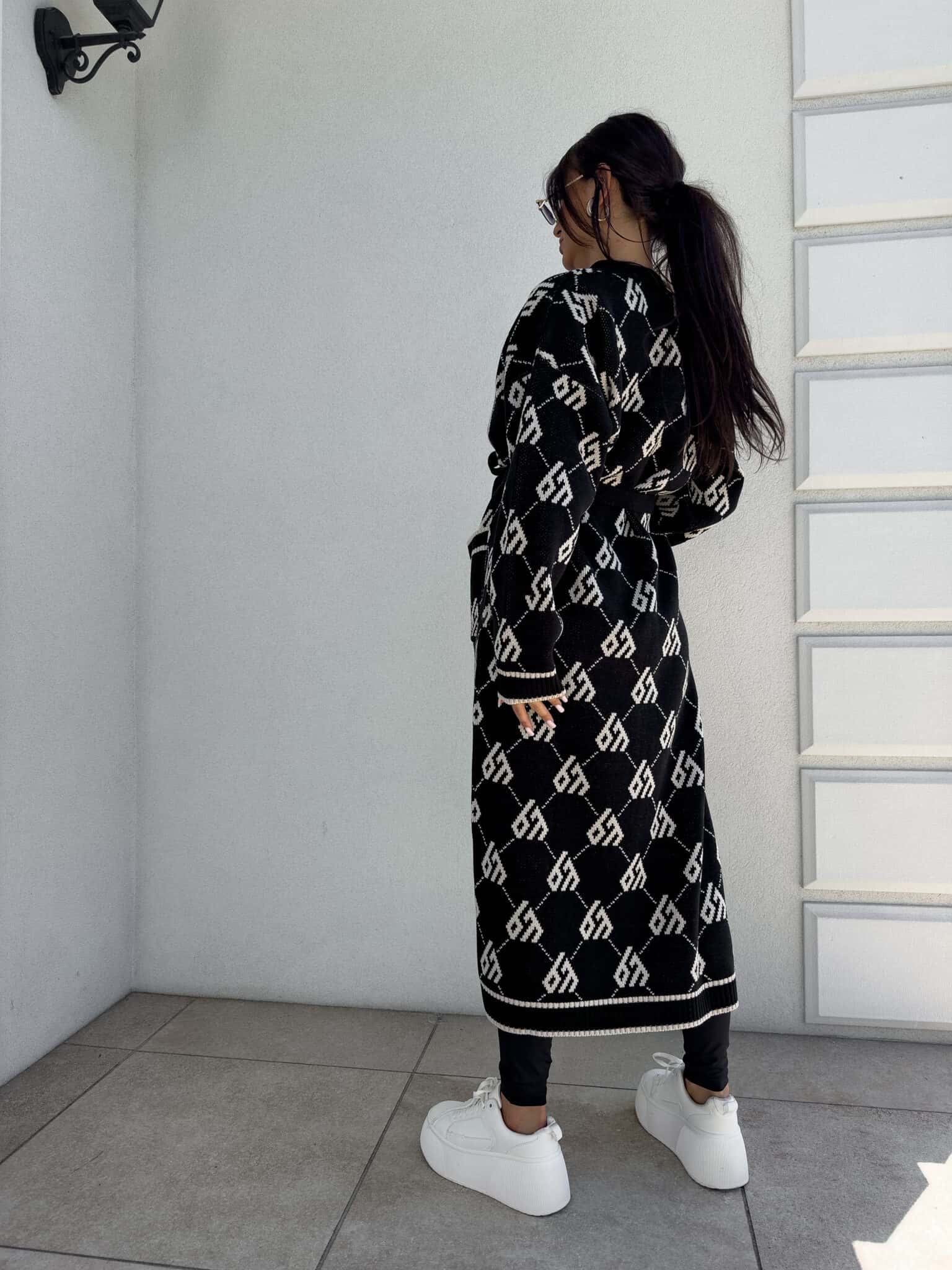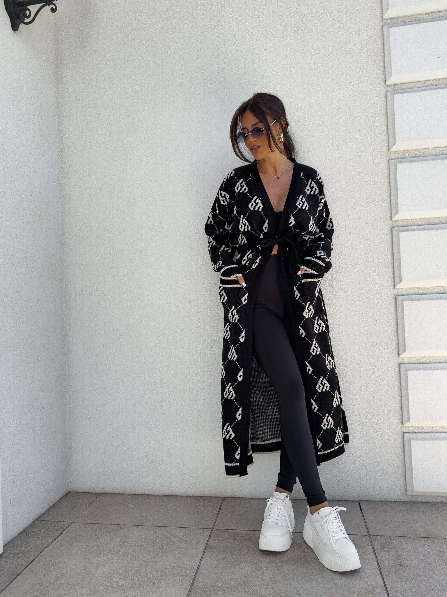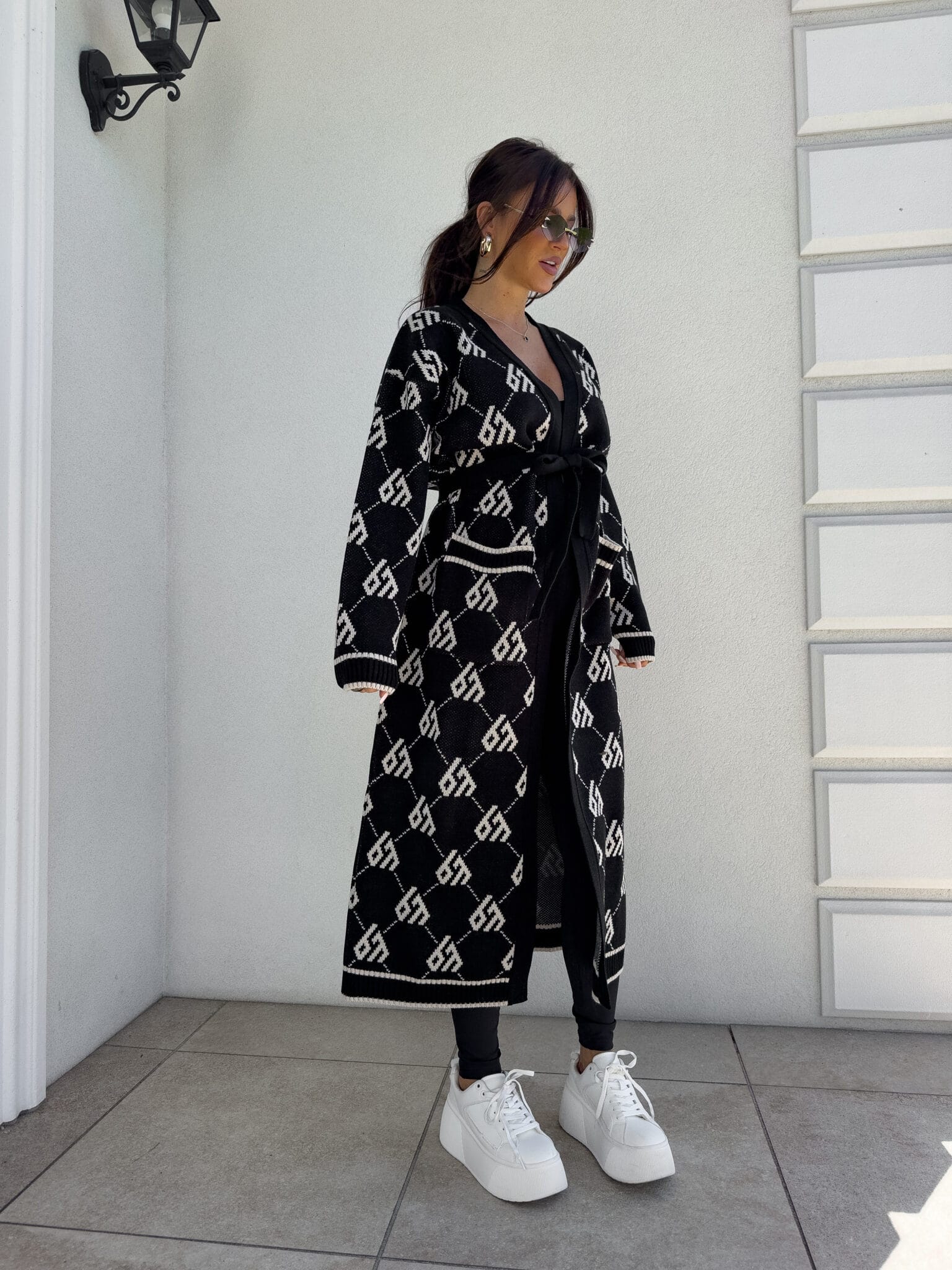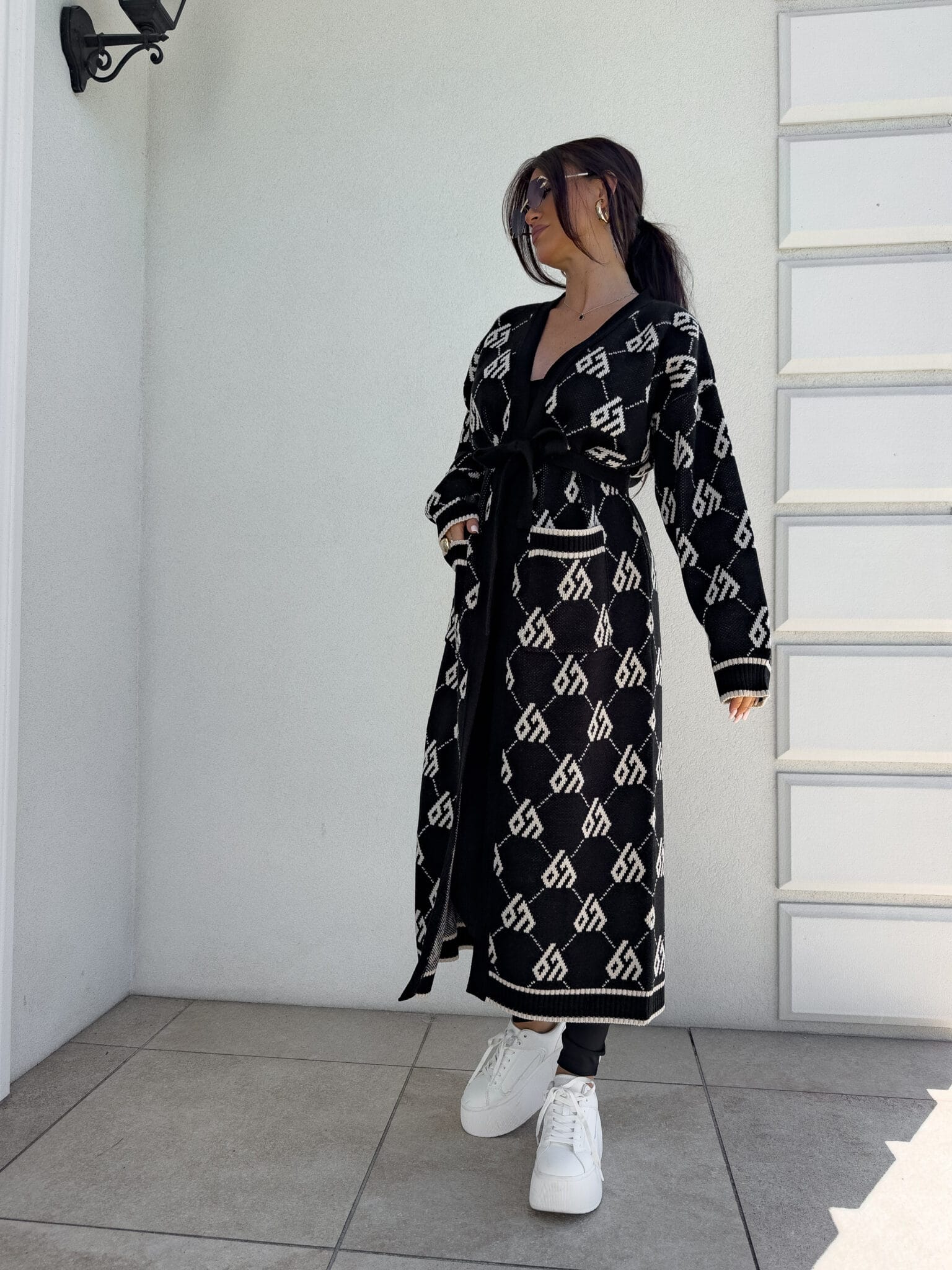 Ein stilvoller, langer Strickmantel, der fast bis zu den Knöcheln reicht, perfekt für kältere Tage. Der klassische, leicht lockere Schnitt sorgt für Komfort, und der um die Taille gebundene Gürtel betont die Silhouette wunderschön. Das Ganze ist mit einem regelmäßig angeordneten Logo auf der gesamten Oberfläche des Materials verziert.