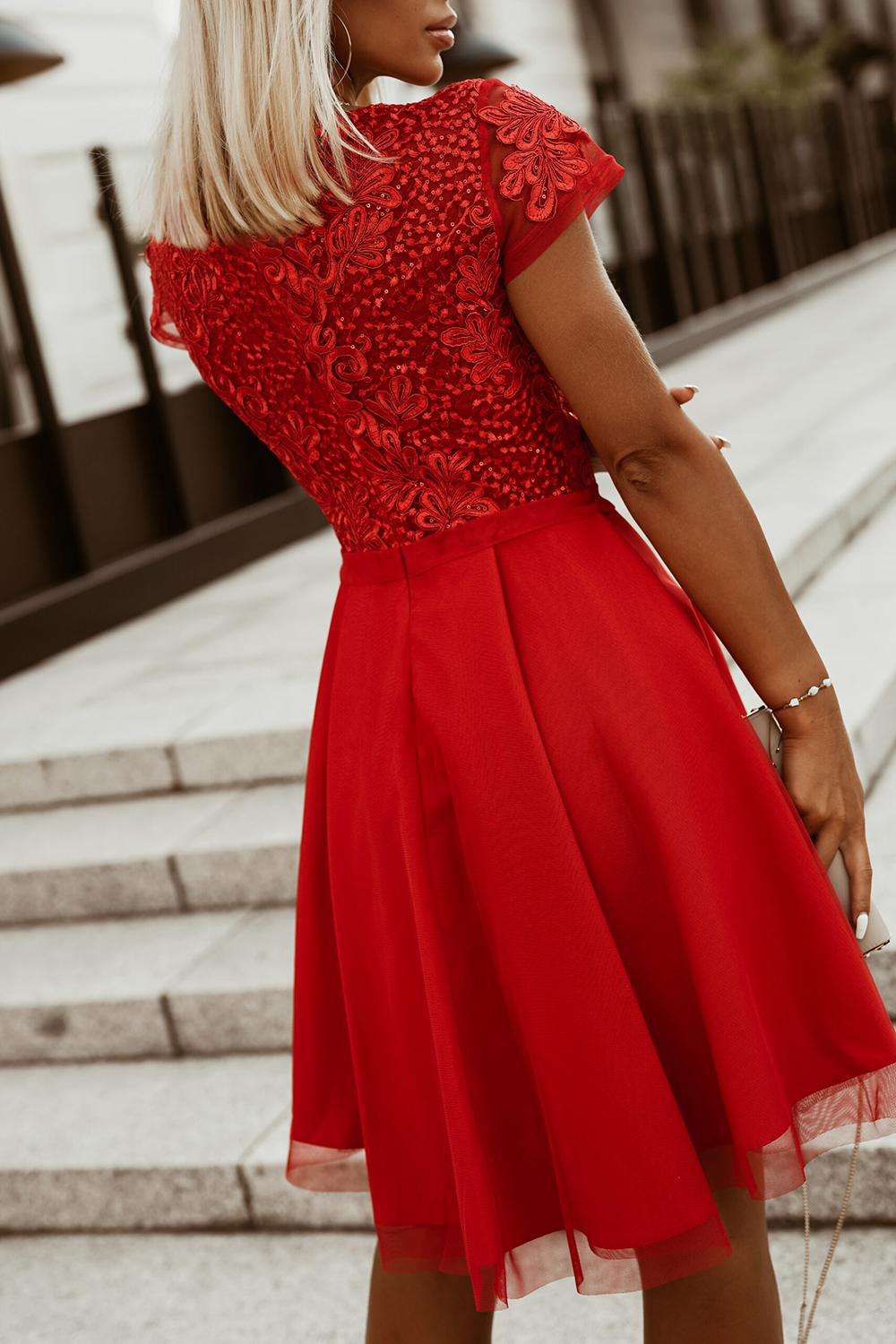 Spitzenelemente, die die Schultern bedecken, bilden einen zarten Ärmel.