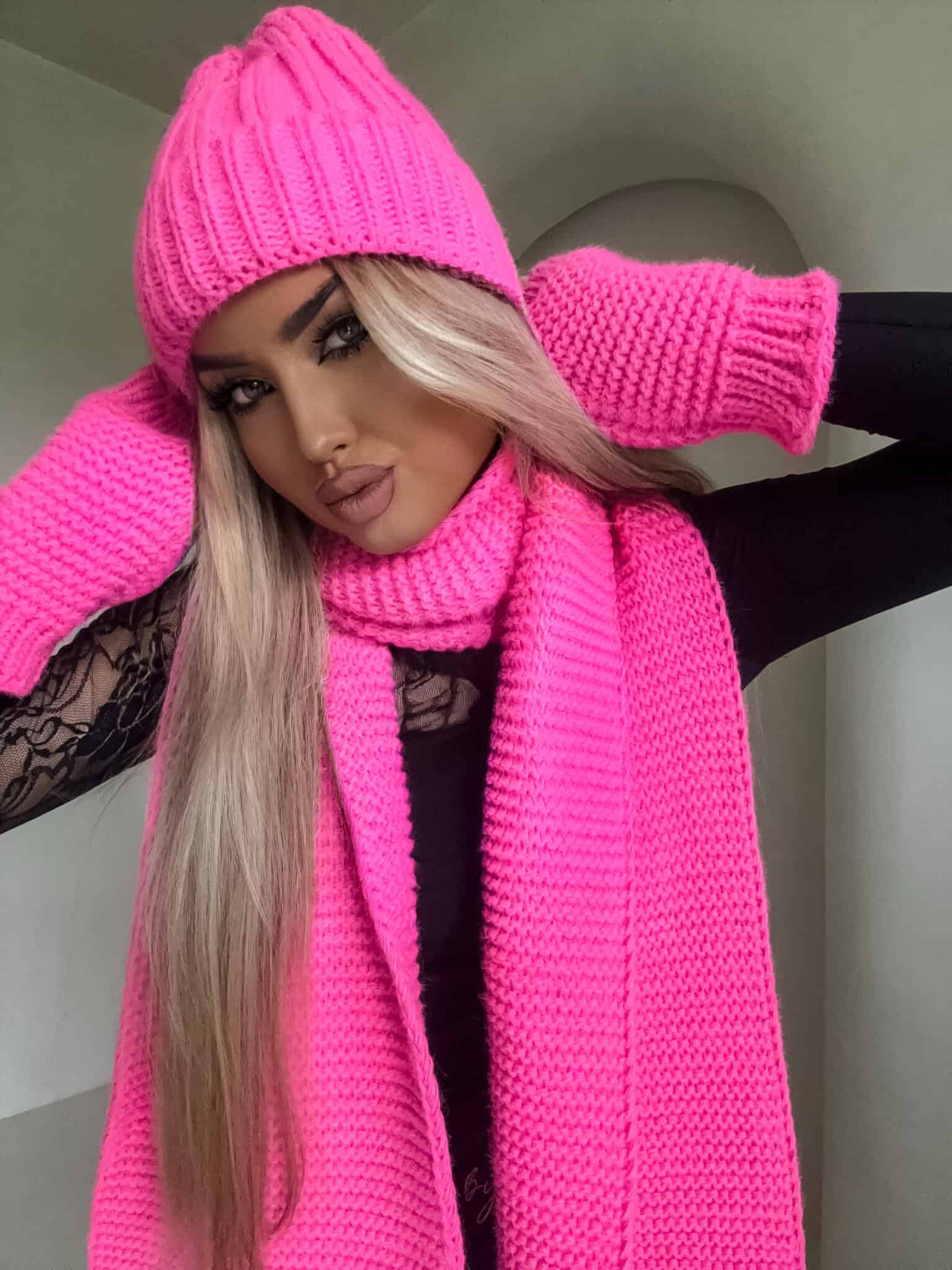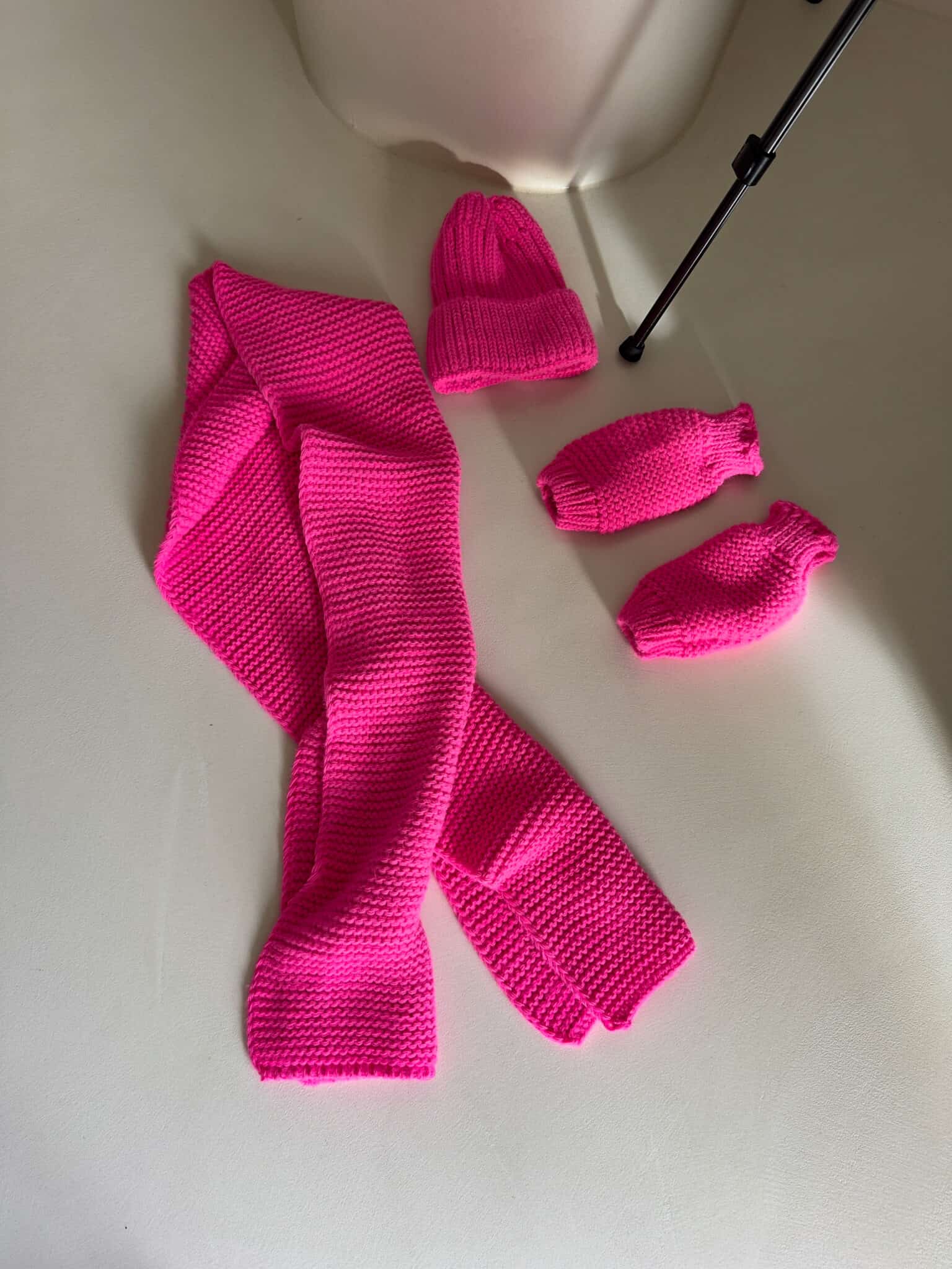 Alaska-Set bestehend aus einer warmen Mütze, einem Schal und fingerlosen Handschuhen.