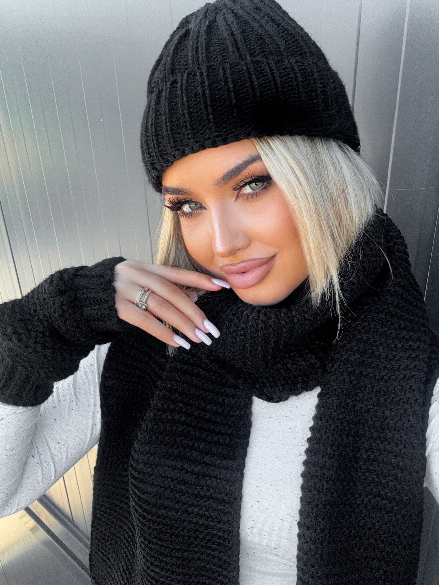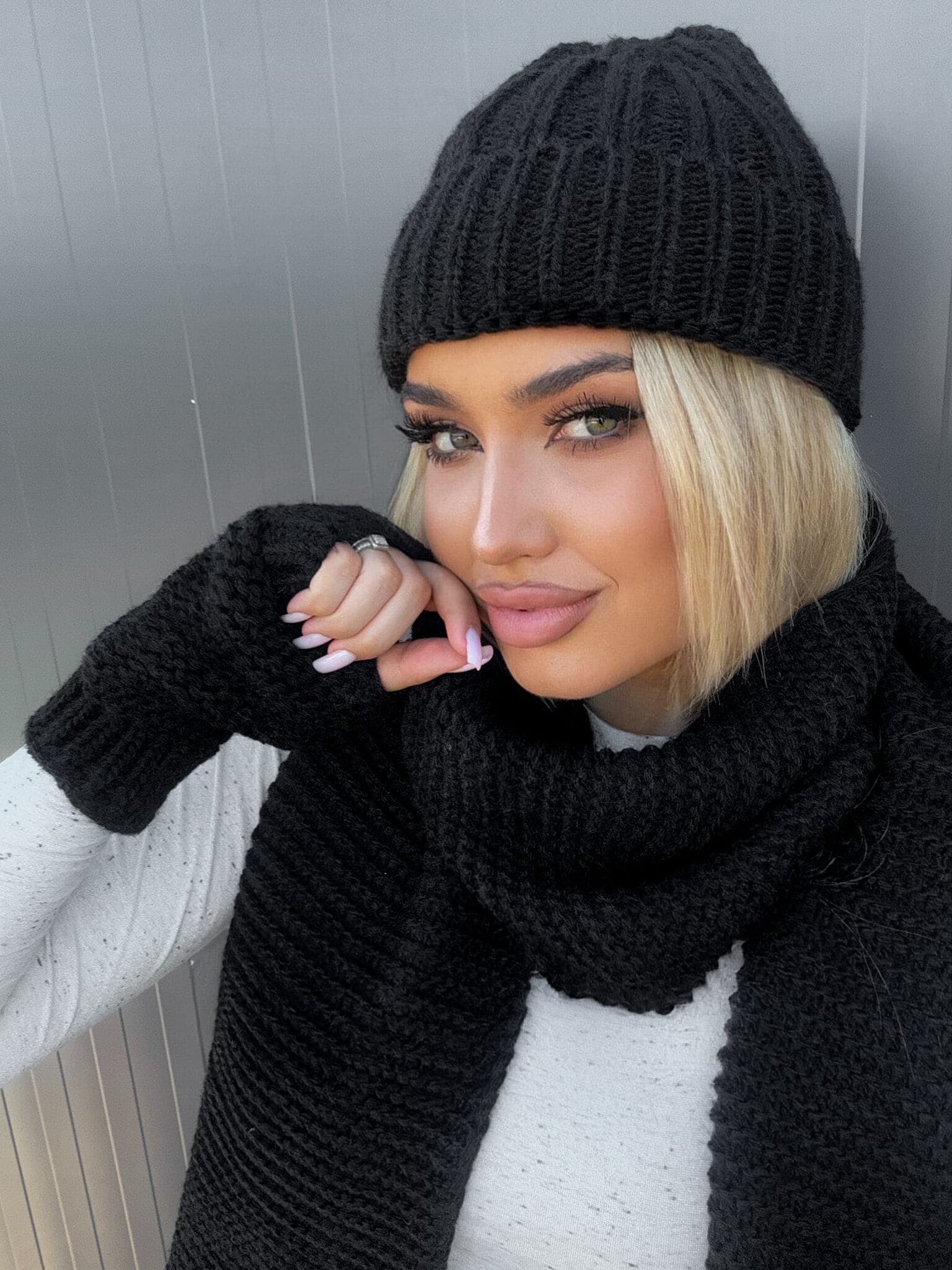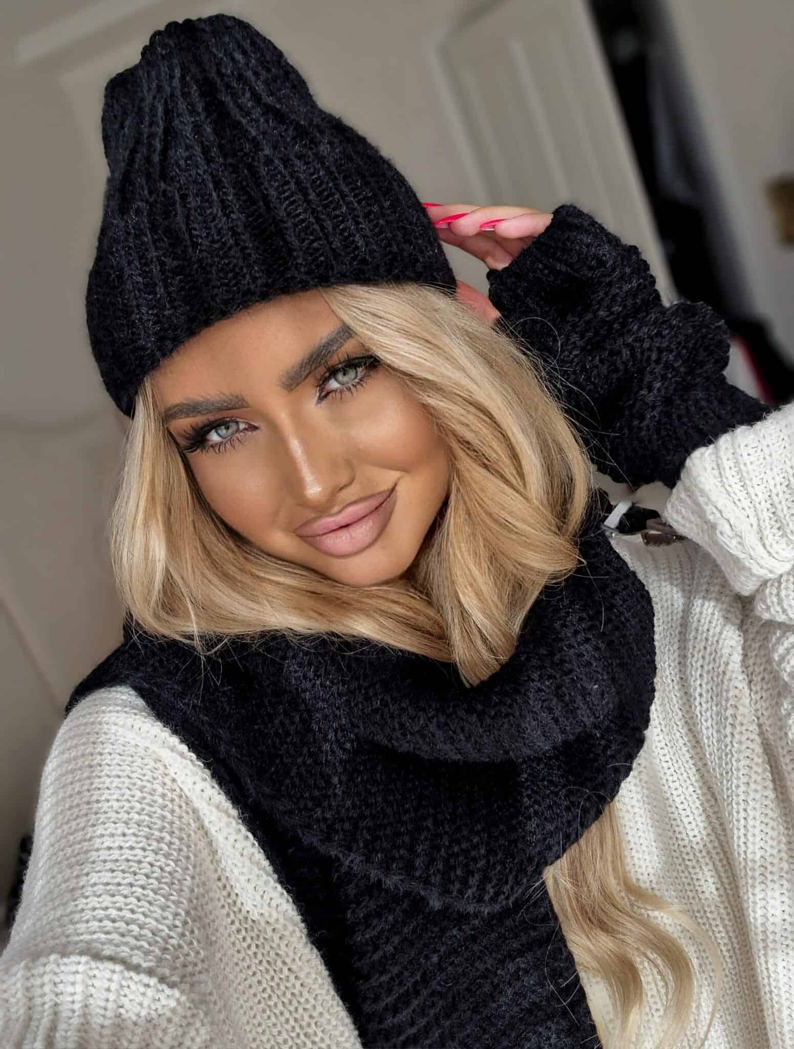 Alaska-Set bestehend aus einer warmen Mütze, einem Schal und fingerlosen Handschuhen.