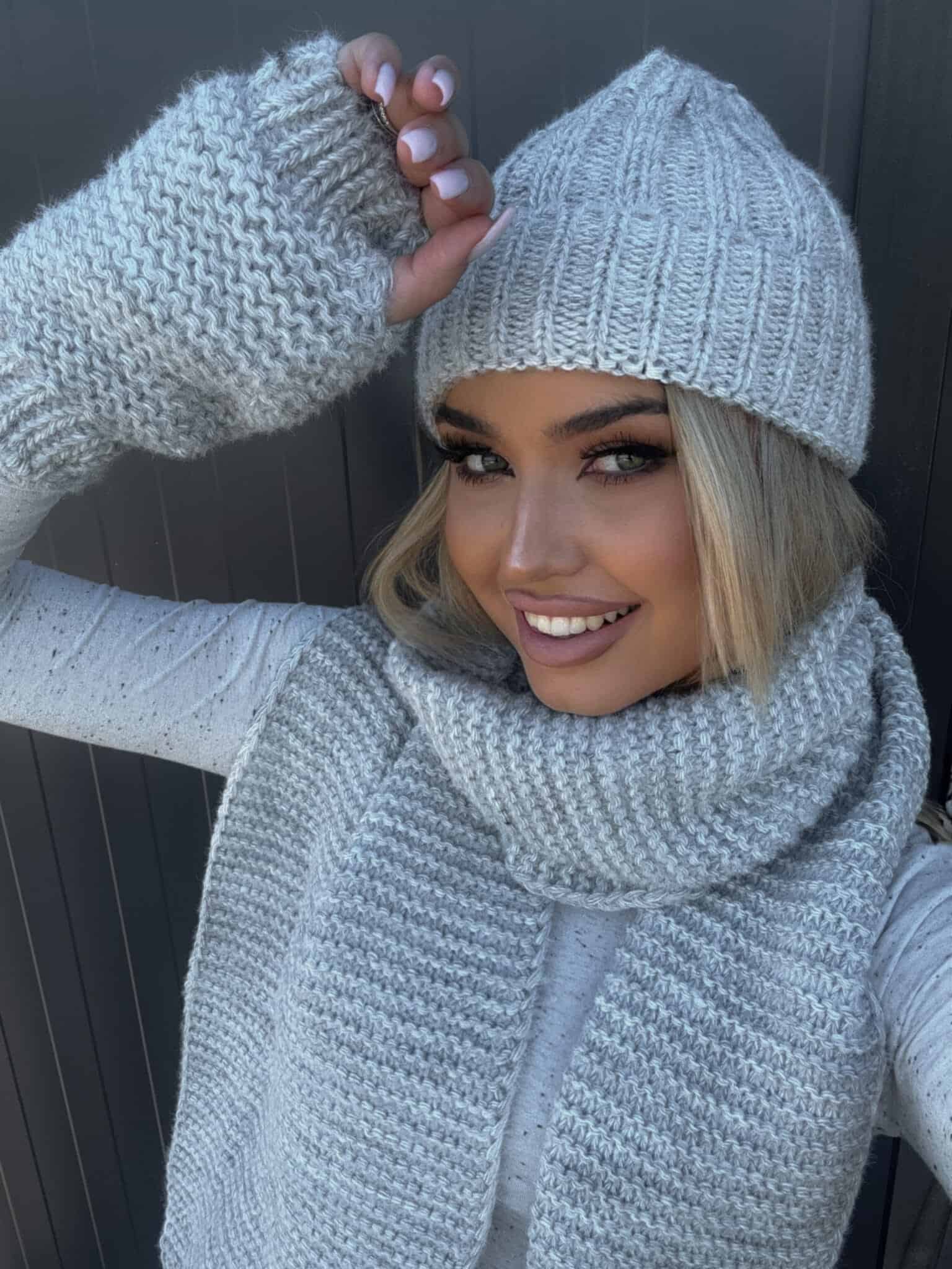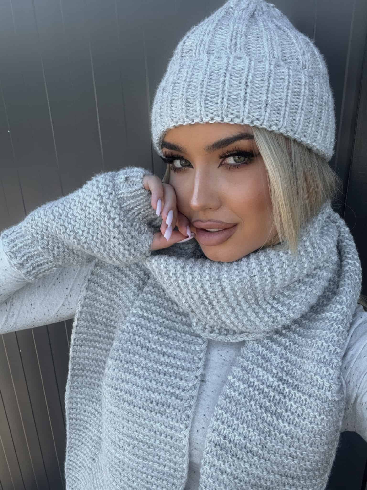 Alaska-Set bestehend aus einer warmen Mütze, einem Schal und fingerlosen Handschuhen.