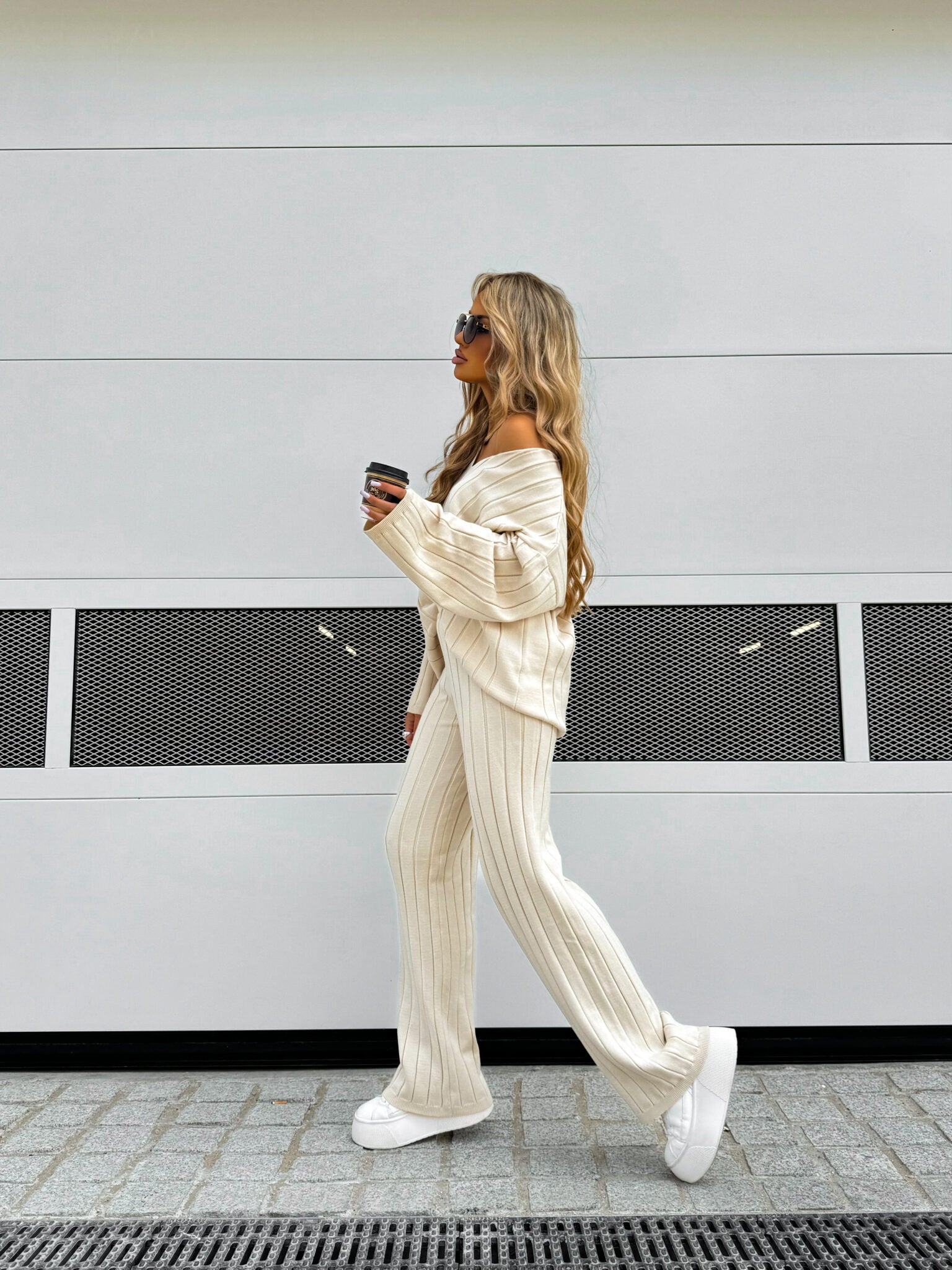 Das Set besteht aus einem übergroßen Pullover mit langen Ärmeln und einer Hose mit hoher Taille, genäht aus dem gleichen, angenehm zu berührenden Strick. Der über dem Kopf getragene Pullover mit V-Ausschnitt ist mit dekorativen vertikalen Nähten verziert, die die Silhouette optisch verlängern und dem Ganzen subtile Eleganz verleihen. Die breiten Beine der Hose und ihr vertikales Muster harmonieren perfekt mit dem Oberteil und schaffen ein gleichmäßiges, harmonisches Styling, das sich sowohl für den Alltag als auch für lässigere Ausflüge eignet.