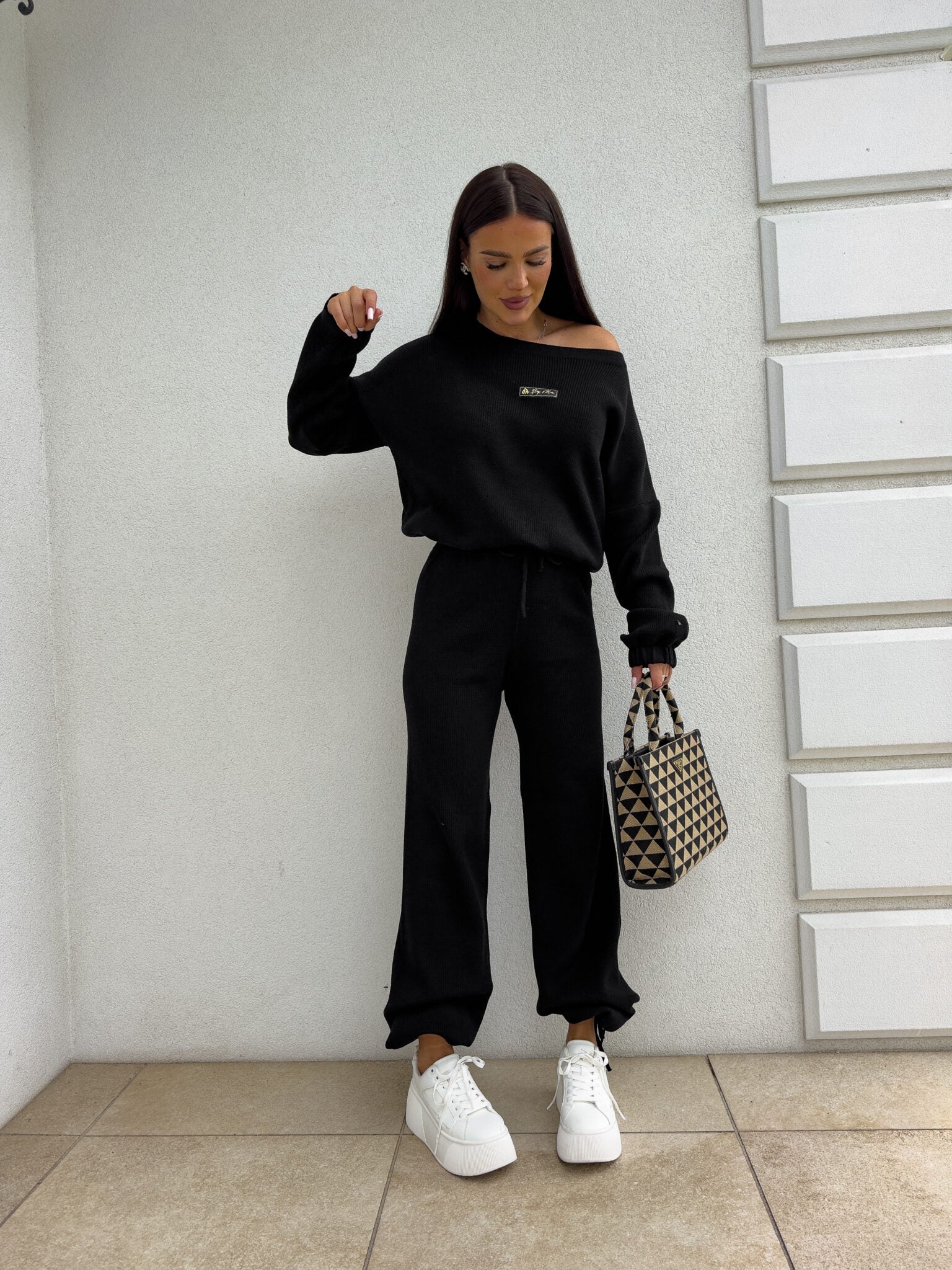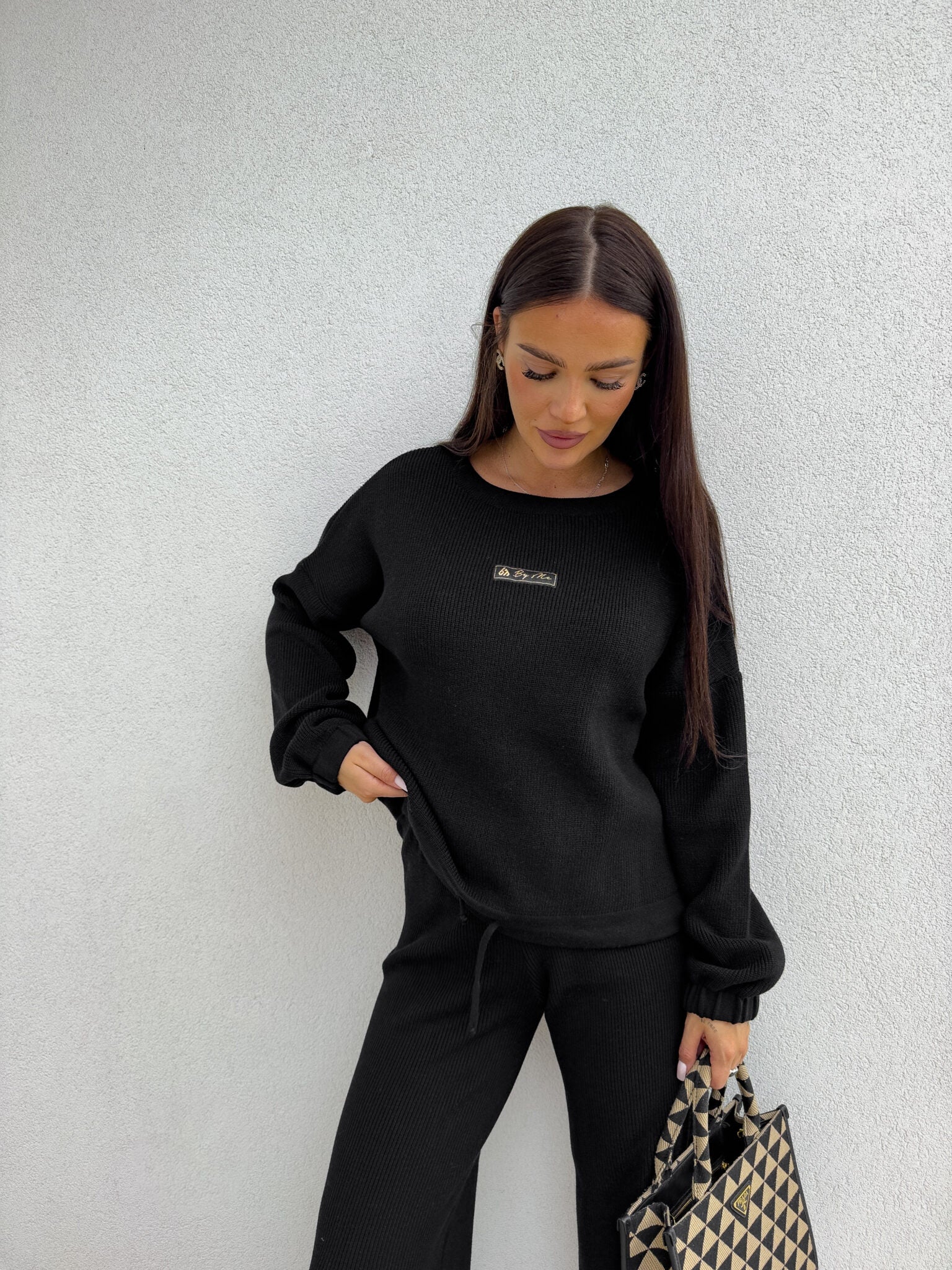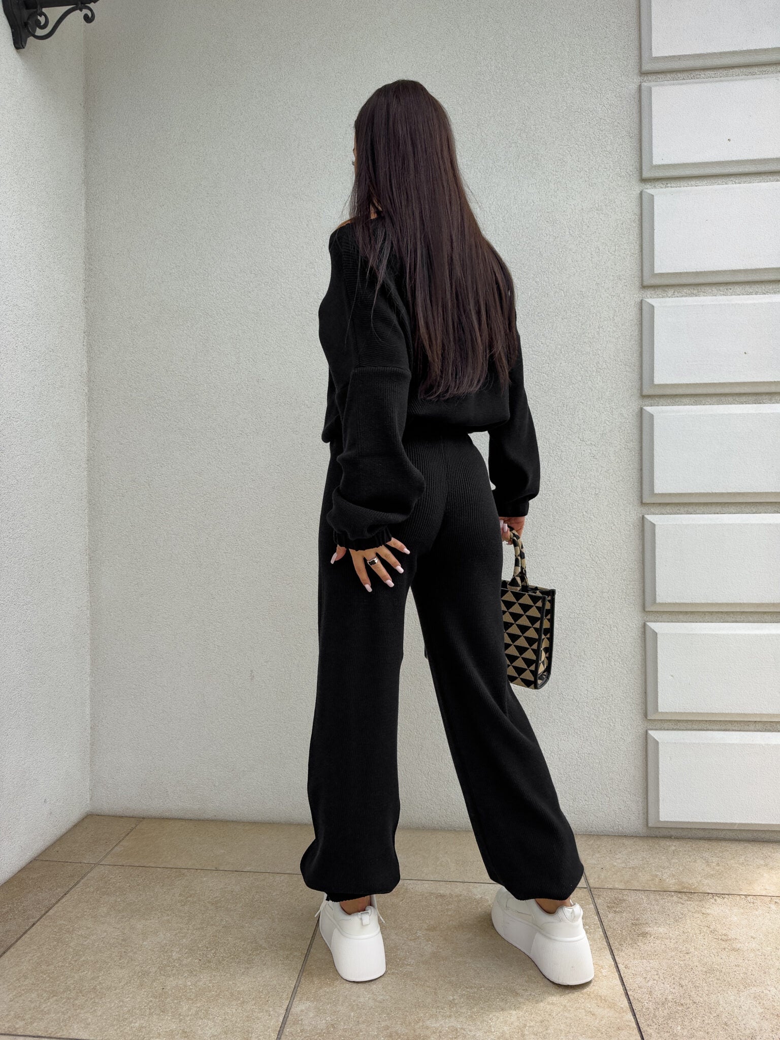 Ein stilvolles Set aus weicher, angenehm anfassender Strickware, ideal für kältere Tage. Es besteht aus einem übergroßen Langarmpullover und einer hoch taillierten Hose aus demselben Stoff. Pullover über dem Kopf getragen, ausgestattet mit Riemen, die es Ihnen ermöglichen, die Länge anzupassen - Sie können ihn auf verschiedene Arten tragen, passend zu Ihrem Stil. Hosen mit breiten Beinen und einem bequemen elastischen Bund sorgen für Tragekomfort. Die Beine sind auch mit Streifen versehen, was eine subtile Modellierung ihrer Form ermöglicht. Das Set ist ideal sowohl zum Entspannen zu Hause als auch für zwanglose Ausflüge.