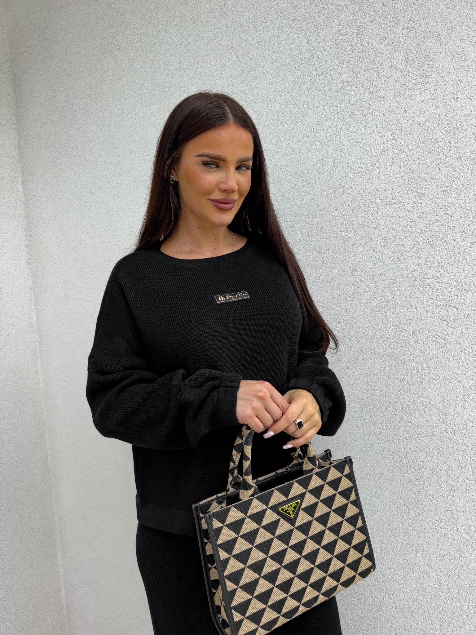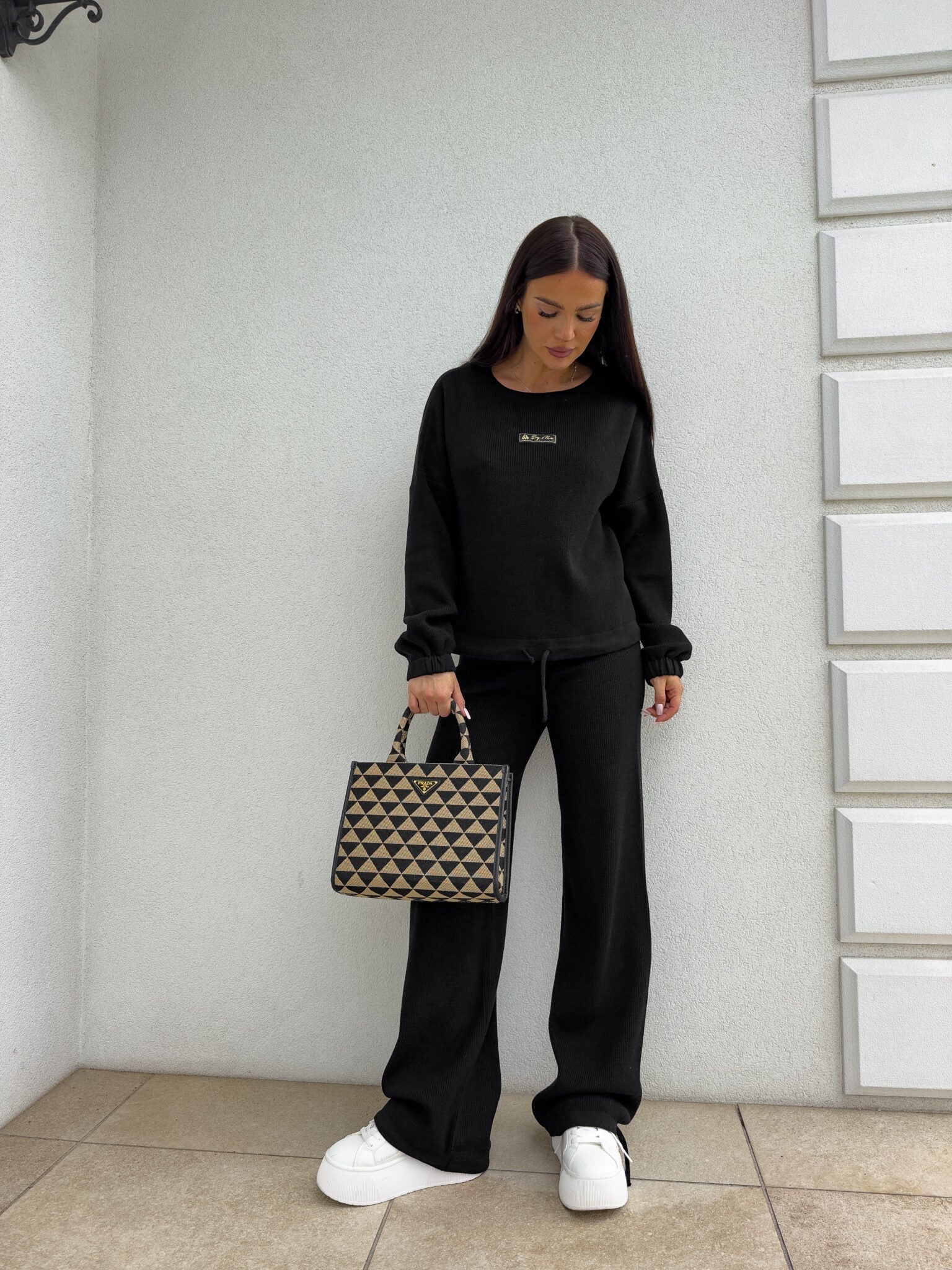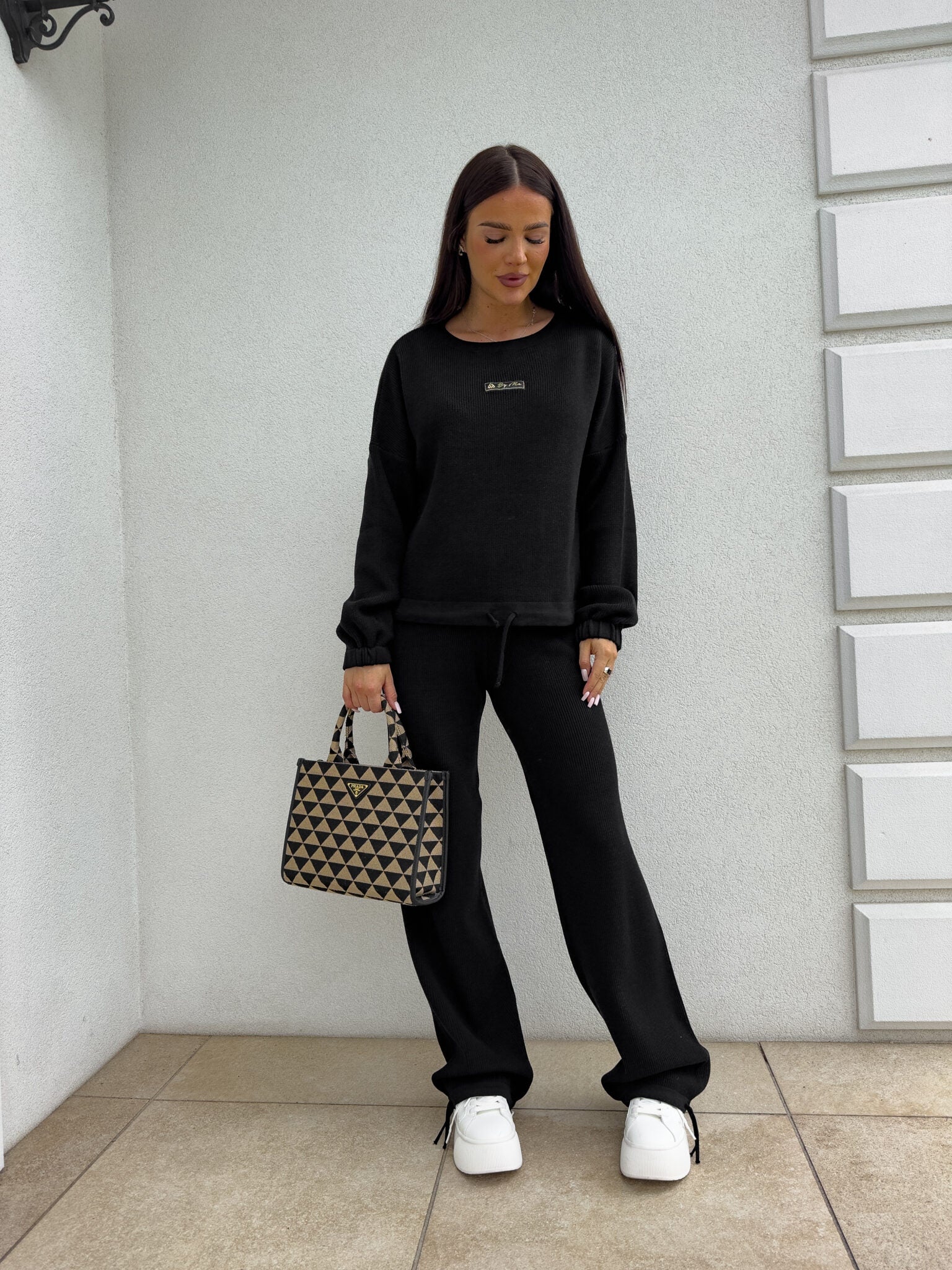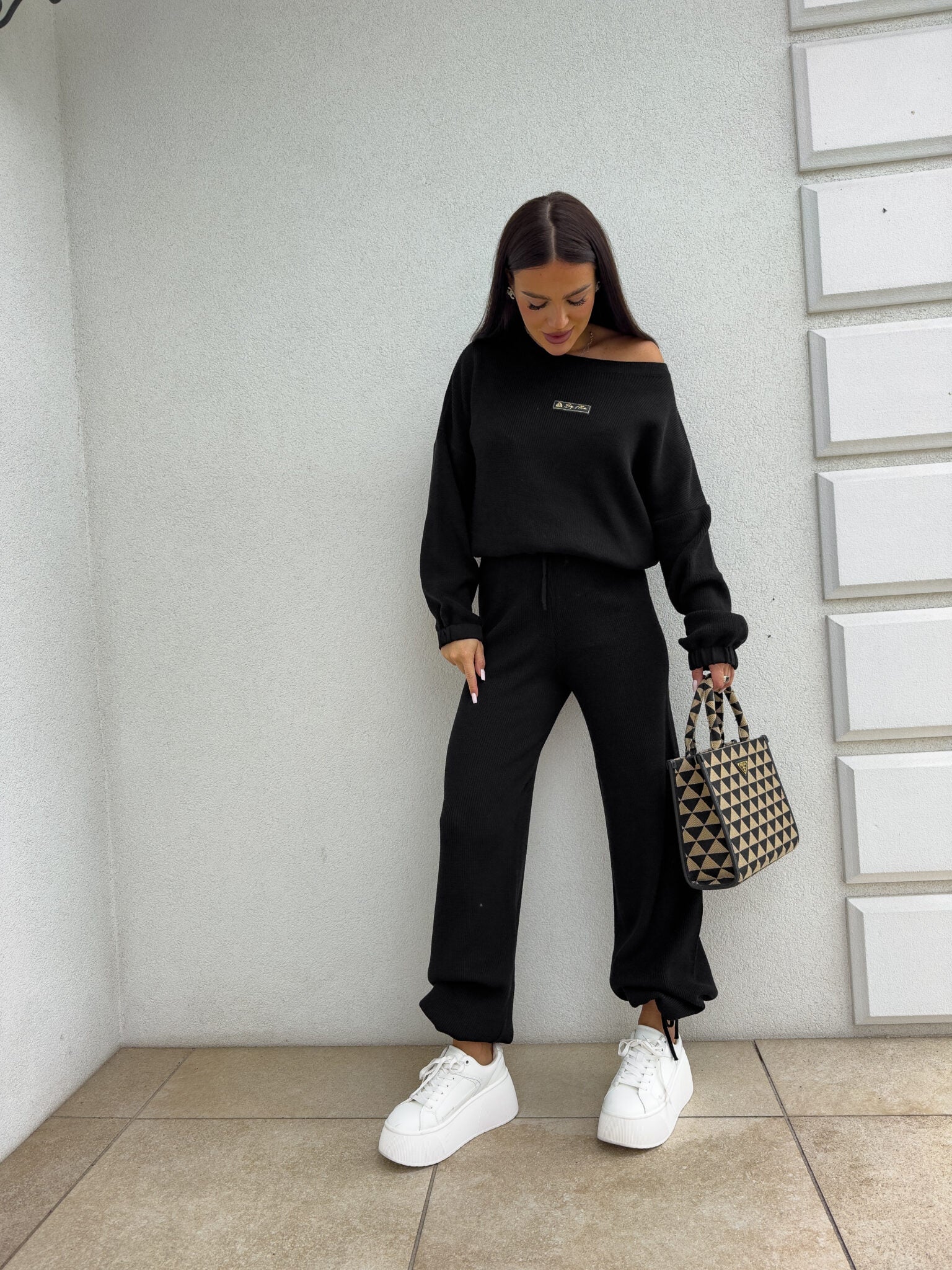 Ein stilvolles Set aus weicher, angenehm anfassender Strickware, ideal für kältere Tage. Es besteht aus einem übergroßen Langarmpullover und einer hoch taillierten Hose aus demselben Stoff. Pullover über dem Kopf getragen, ausgestattet mit Riemen, die es Ihnen ermöglichen, die Länge anzupassen - Sie können ihn auf verschiedene Arten tragen, passend zu Ihrem Stil. Hosen mit breiten Beinen und einem bequemen elastischen Bund sorgen für Tragekomfort. Die Beine sind auch mit Streifen versehen, was eine subtile Modellierung ihrer Form ermöglicht. Das Set ist ideal sowohl zum Entspannen zu Hause als auch für zwanglose Ausflüge.