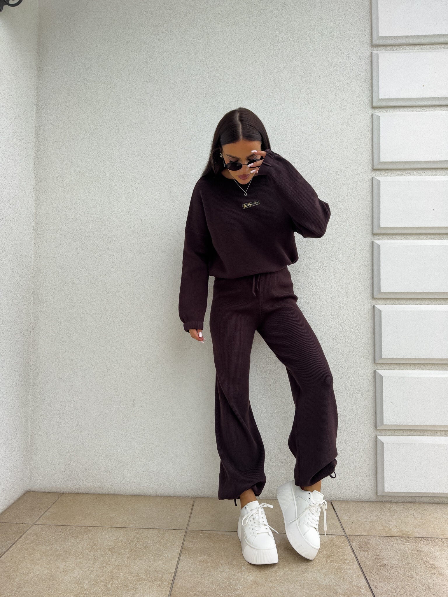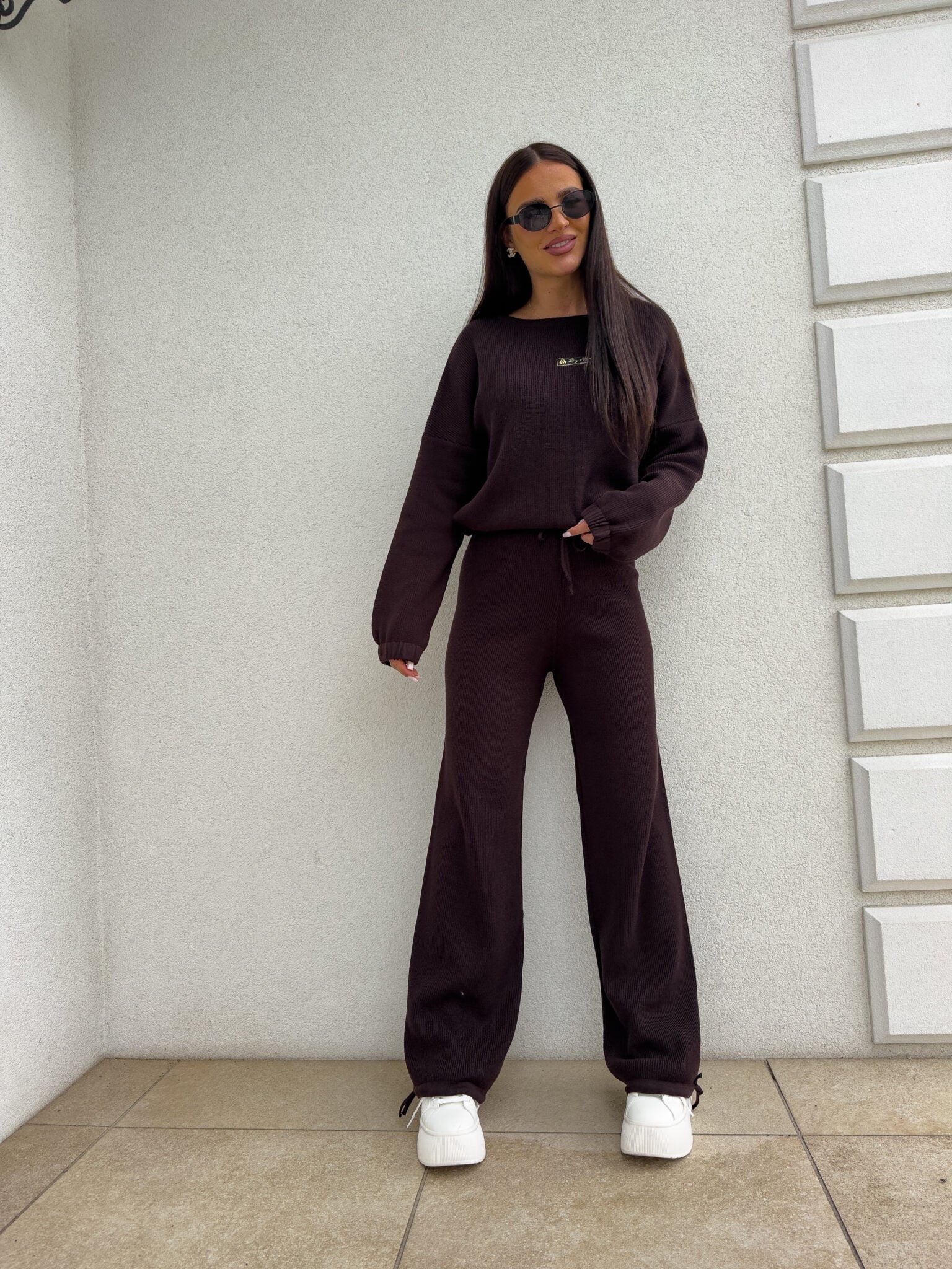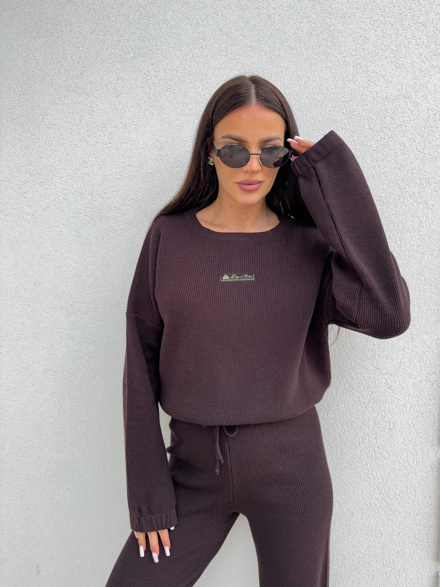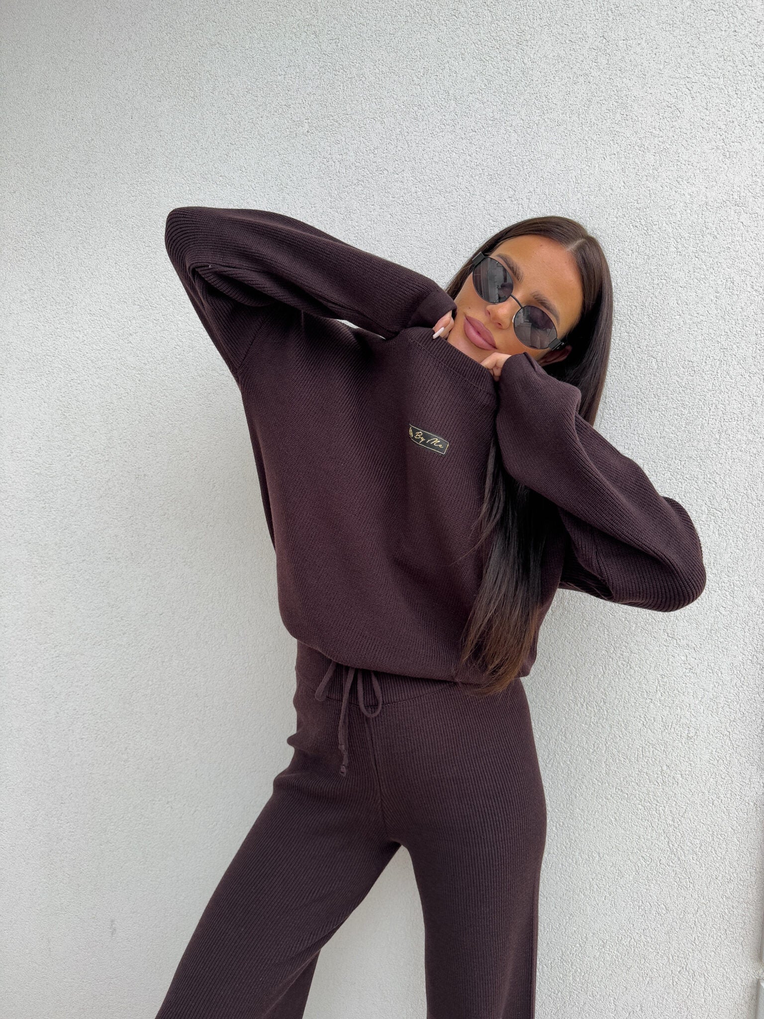 Ein stilvolles Set aus weicher, angenehm anfassender Strickware, ideal für kältere Tage. Es besteht aus einem übergroßen Langarmpullover und einer hoch taillierten Hose aus demselben Stoff. Pullover über dem Kopf getragen, ausgestattet mit Riemen, die es Ihnen ermöglichen, die Länge anzupassen - Sie können ihn auf verschiedene Arten tragen, passend zu Ihrem Stil. Hosen mit breiten Beinen und einem bequemen elastischen Bund sorgen für Tragekomfort. Die Beine sind auch mit Streifen versehen, was eine subtile Modellierung ihrer Form ermöglicht. Das Set ist ideal sowohl zum Entspannen zu Hause als auch für zwanglose Ausflüge.