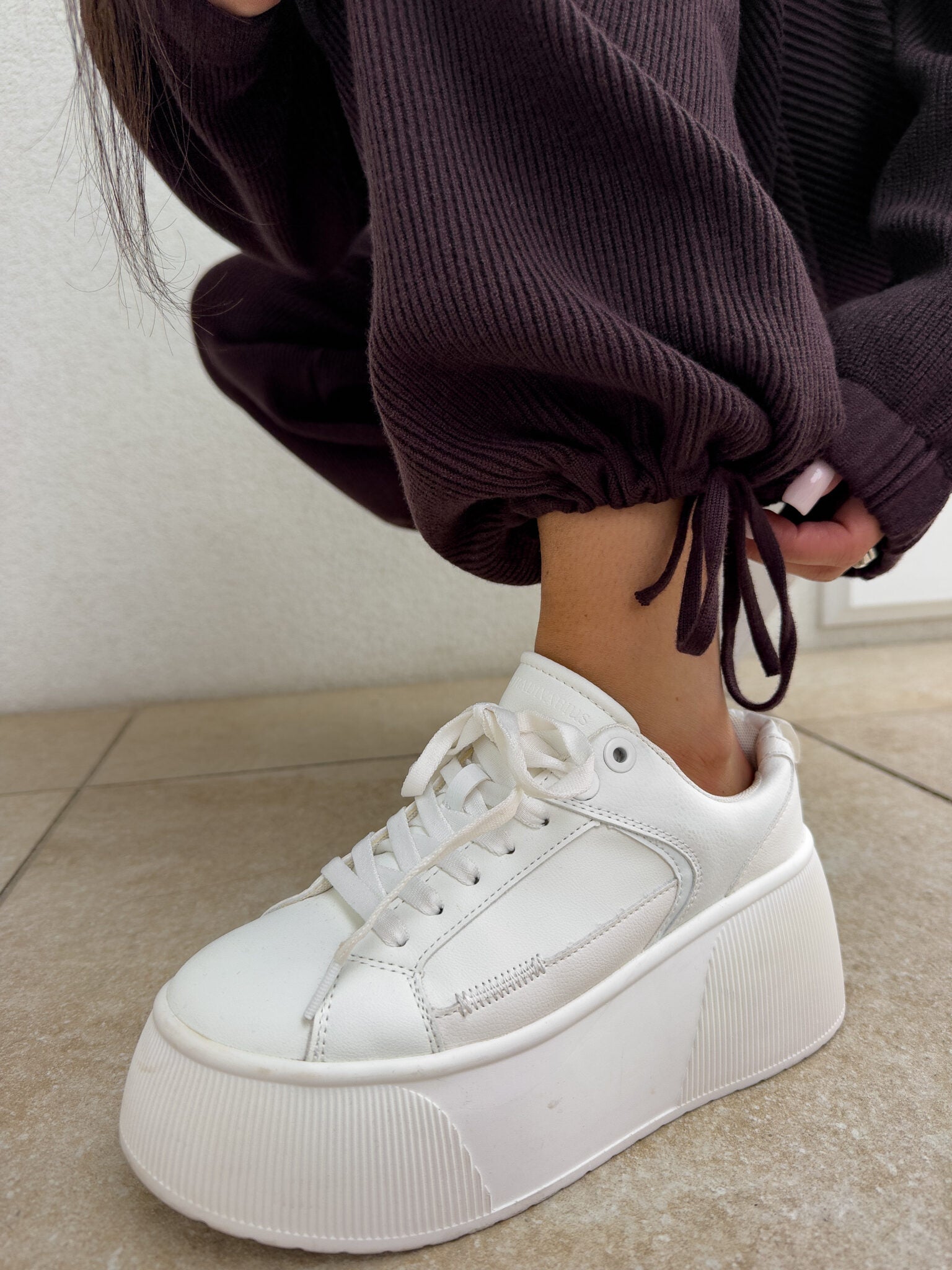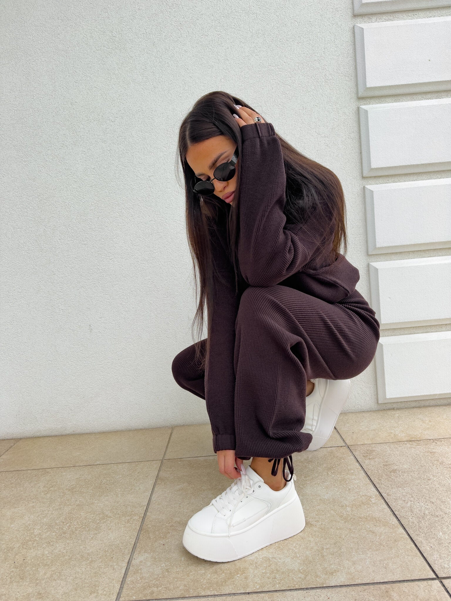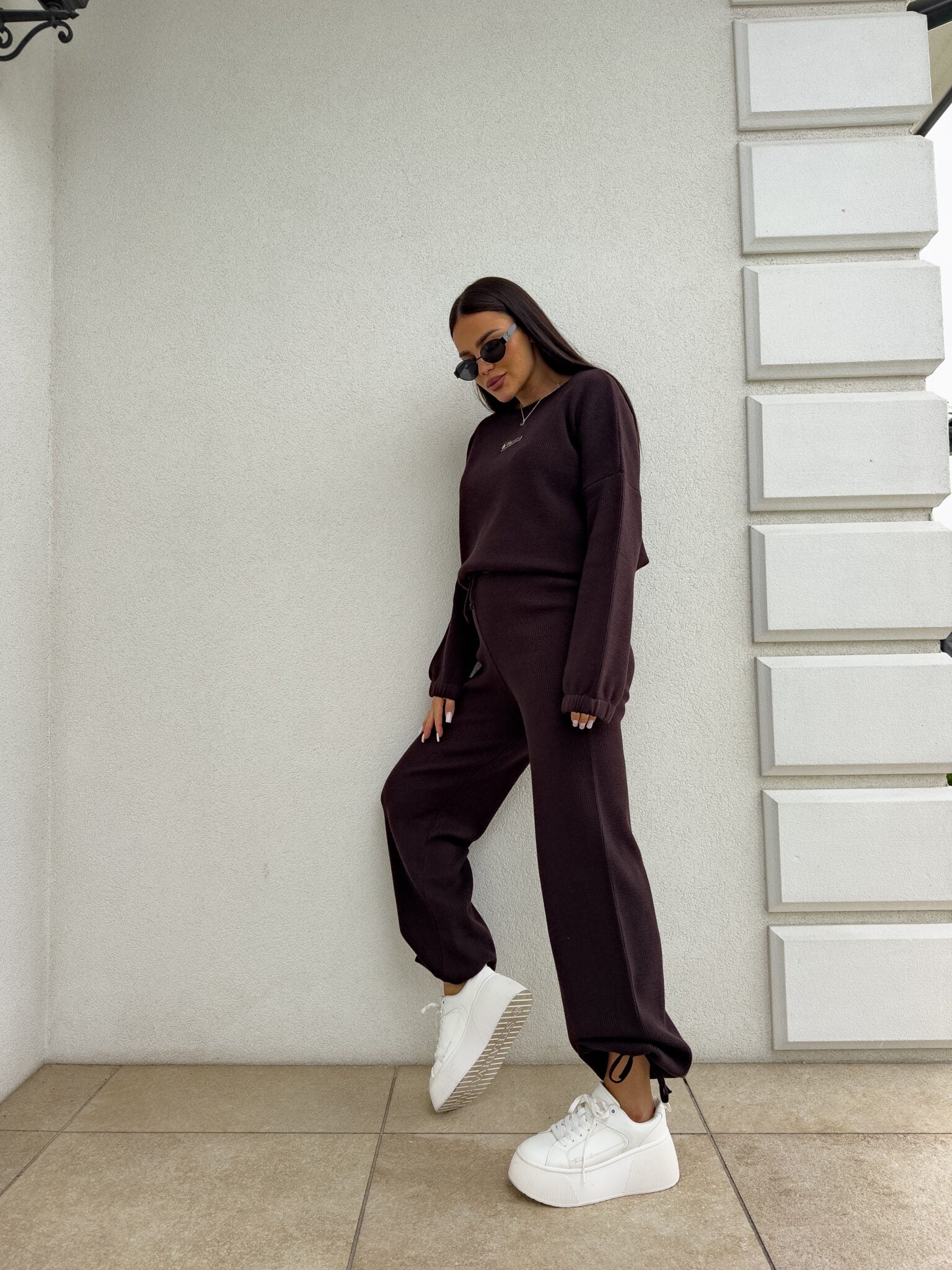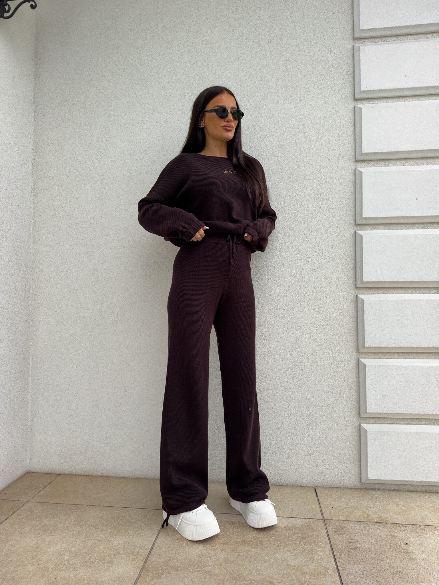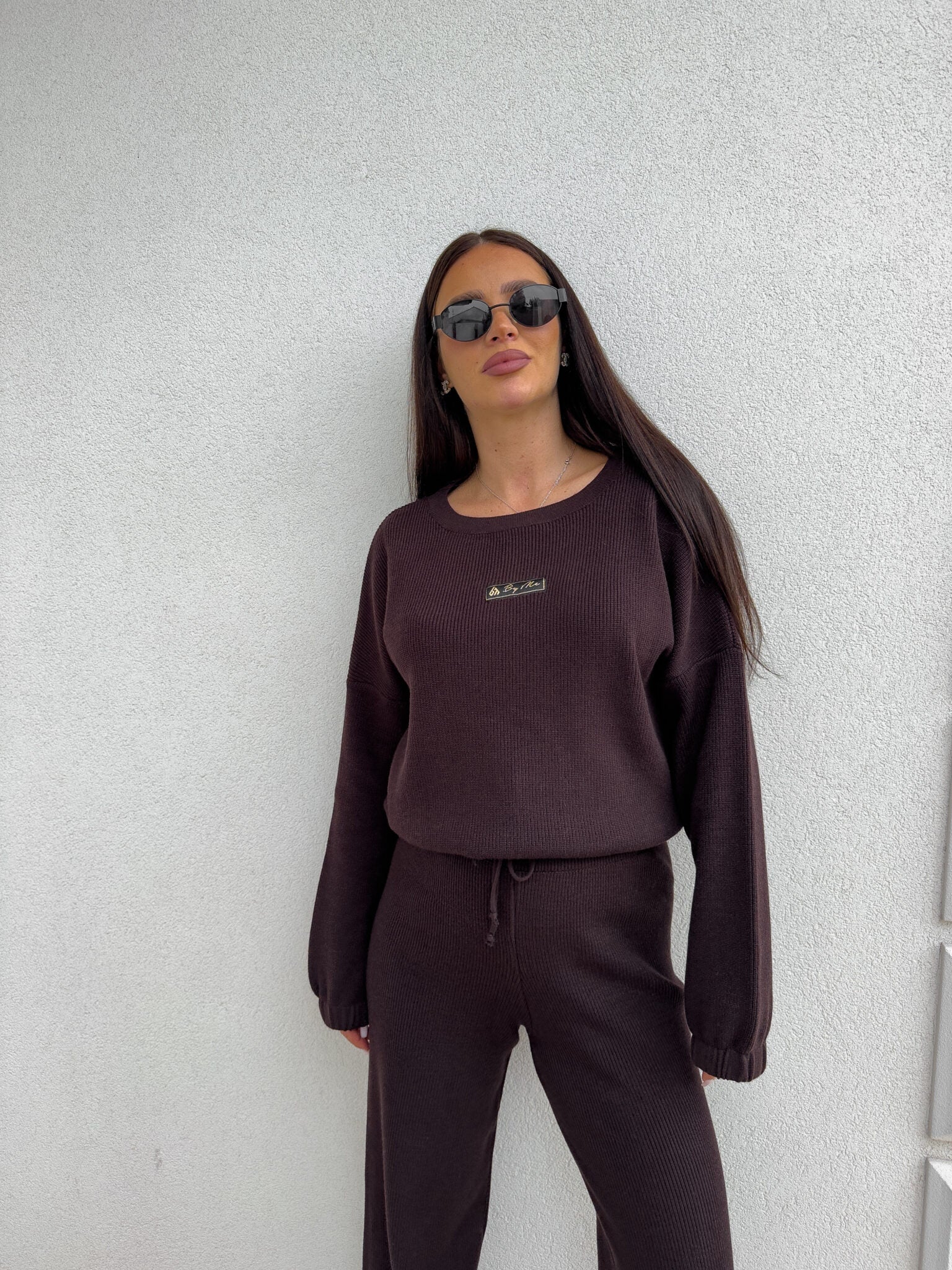 Ein stilvolles Set aus weicher, angenehm anfassender Strickware, ideal für kältere Tage. Es besteht aus einem übergroßen Langarmpullover und einer hoch taillierten Hose aus demselben Stoff. Pullover über dem Kopf getragen, ausgestattet mit Riemen, die es Ihnen ermöglichen, die Länge anzupassen - Sie können ihn auf verschiedene Arten tragen, passend zu Ihrem Stil. Hosen mit breiten Beinen und einem bequemen elastischen Bund sorgen für Tragekomfort. Die Beine sind auch mit Streifen versehen, was eine subtile Modellierung ihrer Form ermöglicht. Das Set ist ideal sowohl zum Entspannen zu Hause als auch für zwanglose Ausflüge.