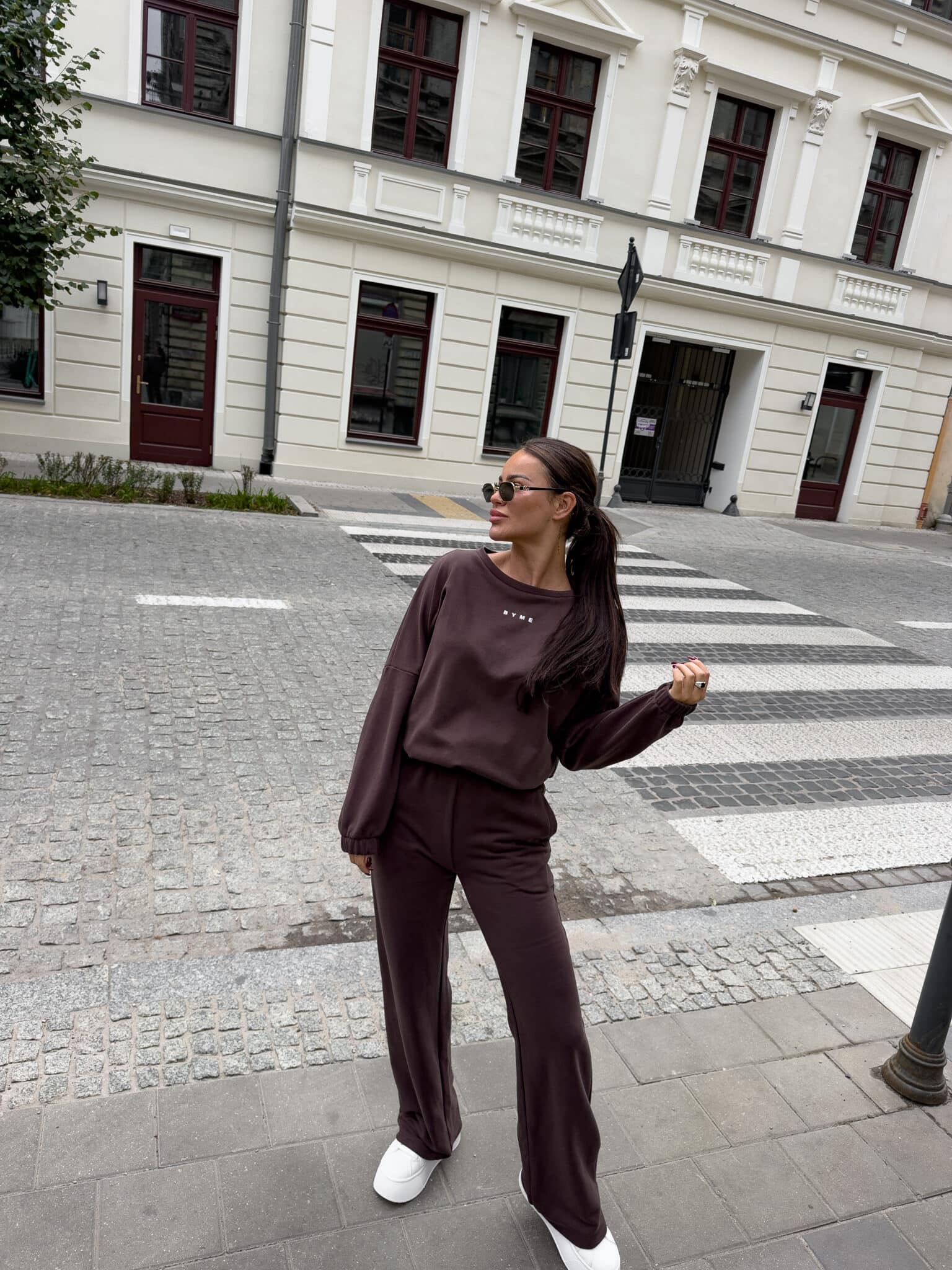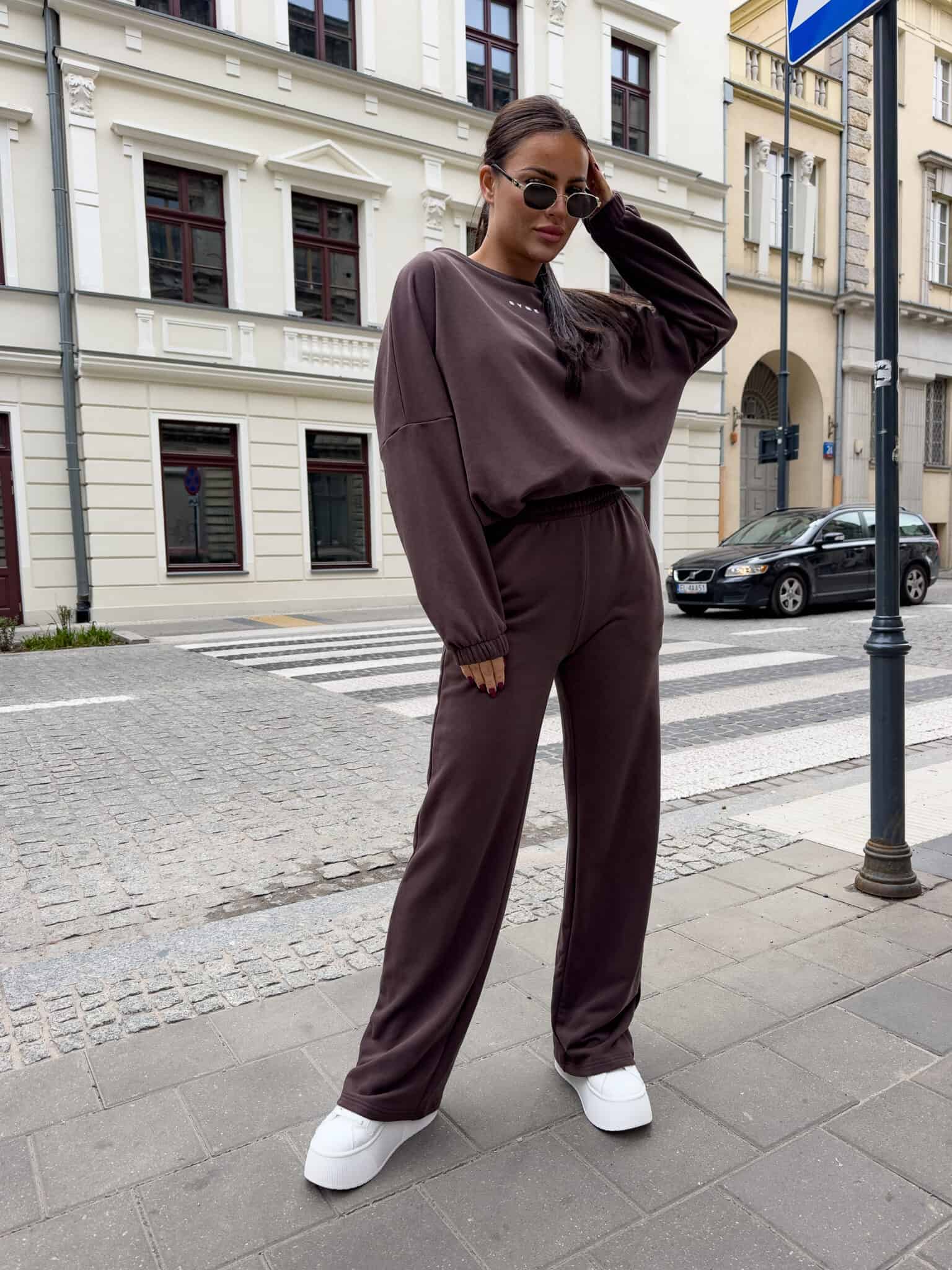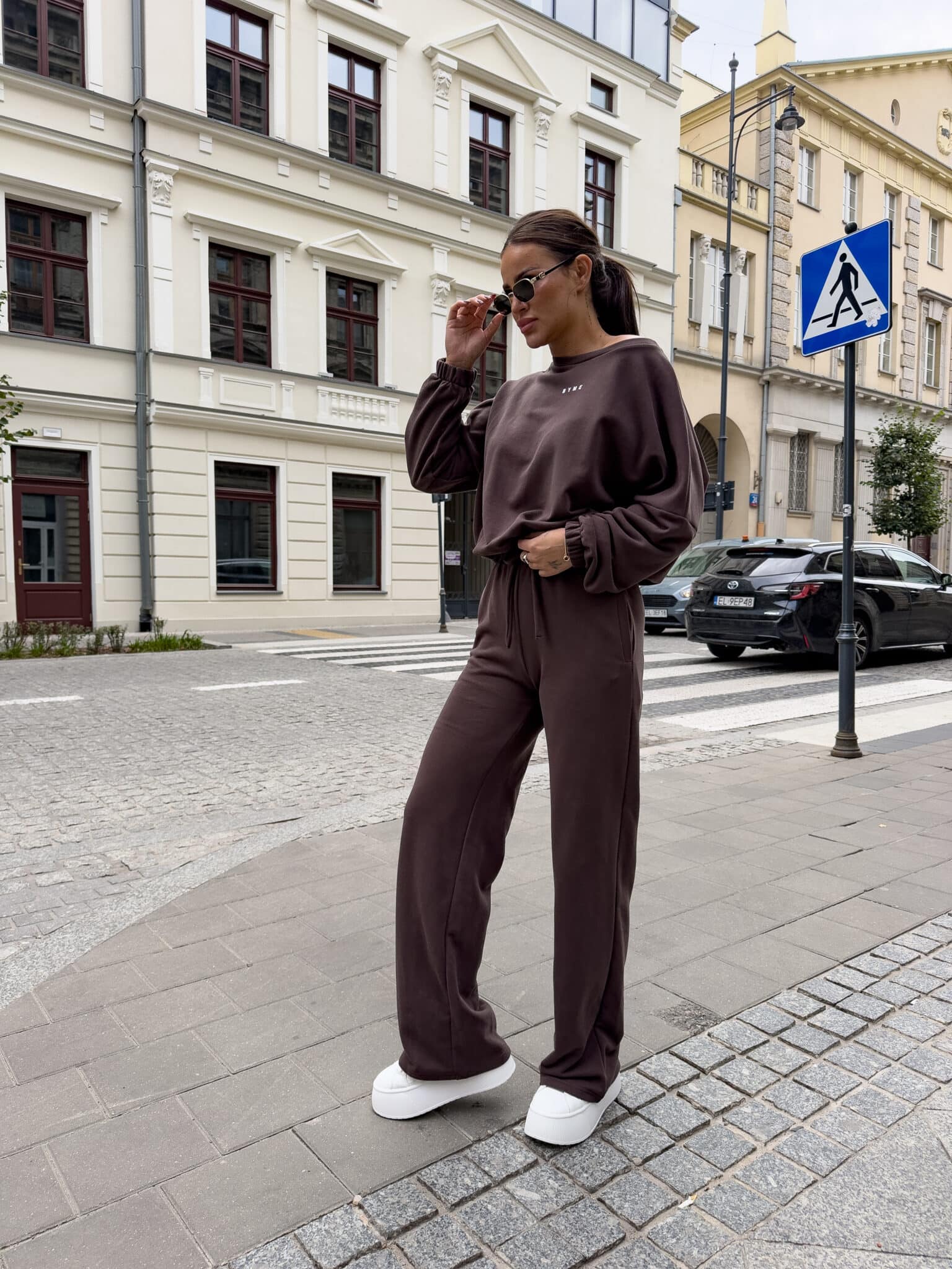 Sydney-Set bestehend aus Sweatshirt und Hose. Sweatshirt mit einem einfachen, lockeren Schnitt, mit langen Ärmeln und Gummi. Weite Hose mit elastischem Bund