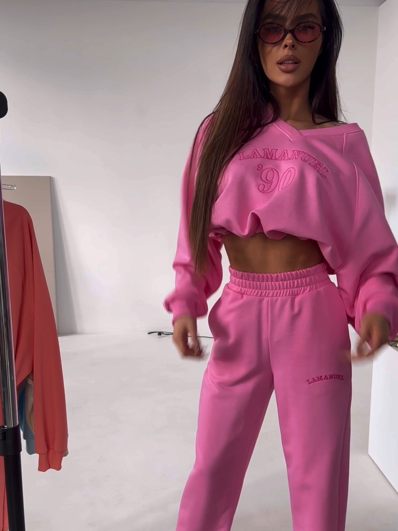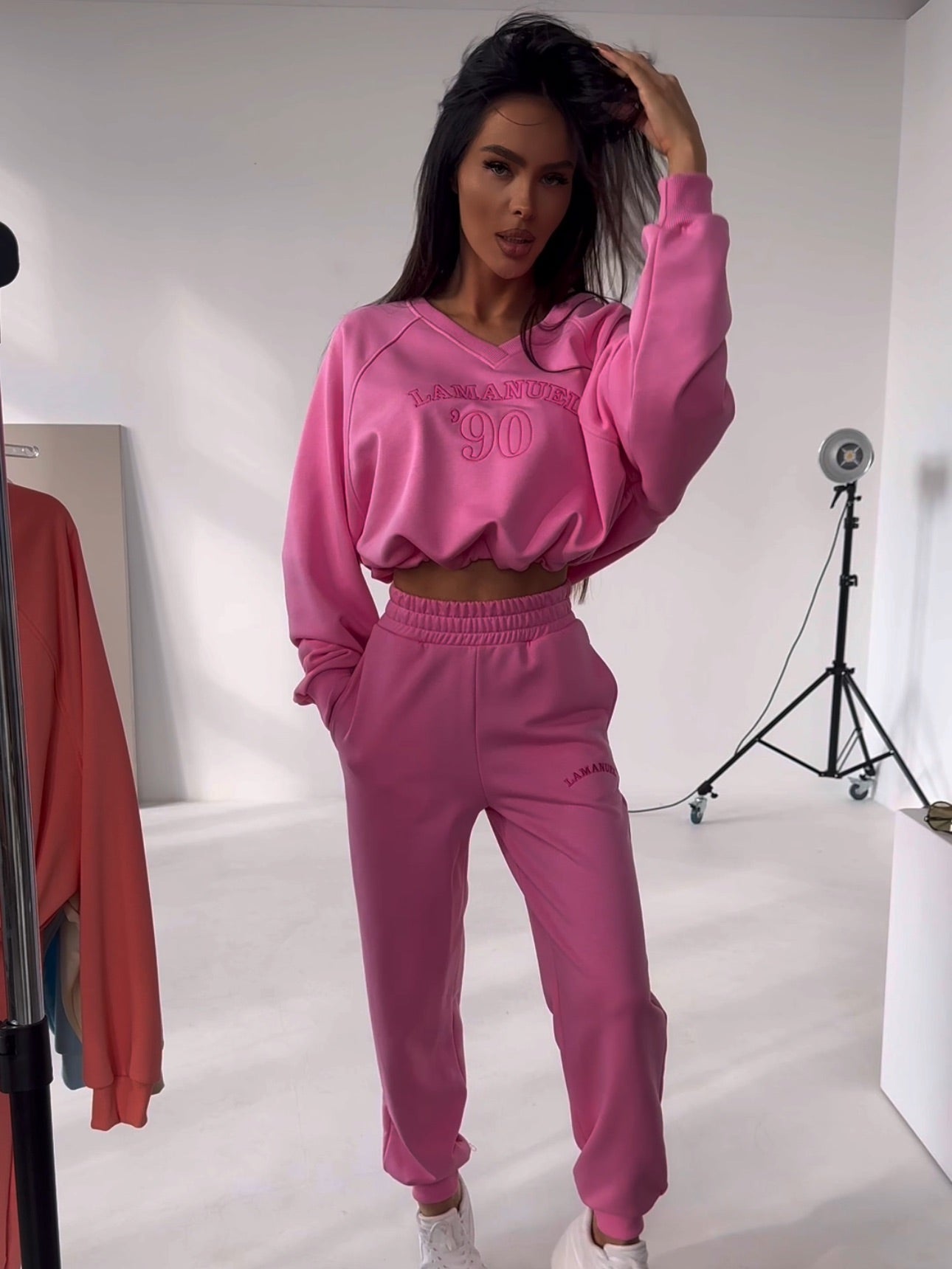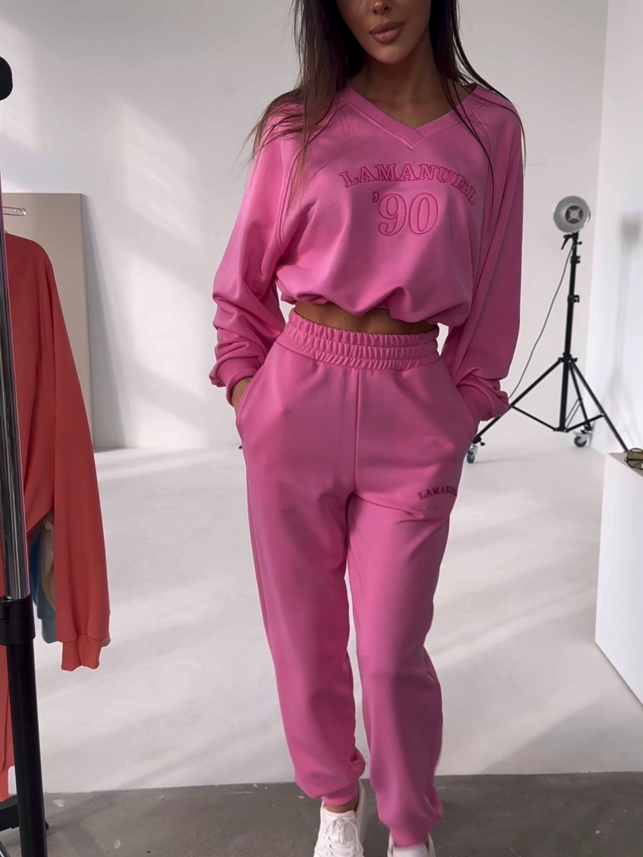 Damen-Trainingsanzug-Set. Ein Sweatshirt mit V-Ausschnitt ohne Kapuze sorgt für Leichtigkeit und betont den Hals dezent, während der lockere Schnitt Bewegungsfreiheit bietet. Klassische Jogginghosen mit Taschen passen sich perfekt der Figur an, ohne an Komfort einzubüßen. Dies ist ein Set, das sowohl im Alltag als auch in raffinierteren Stilen gut funktioniert