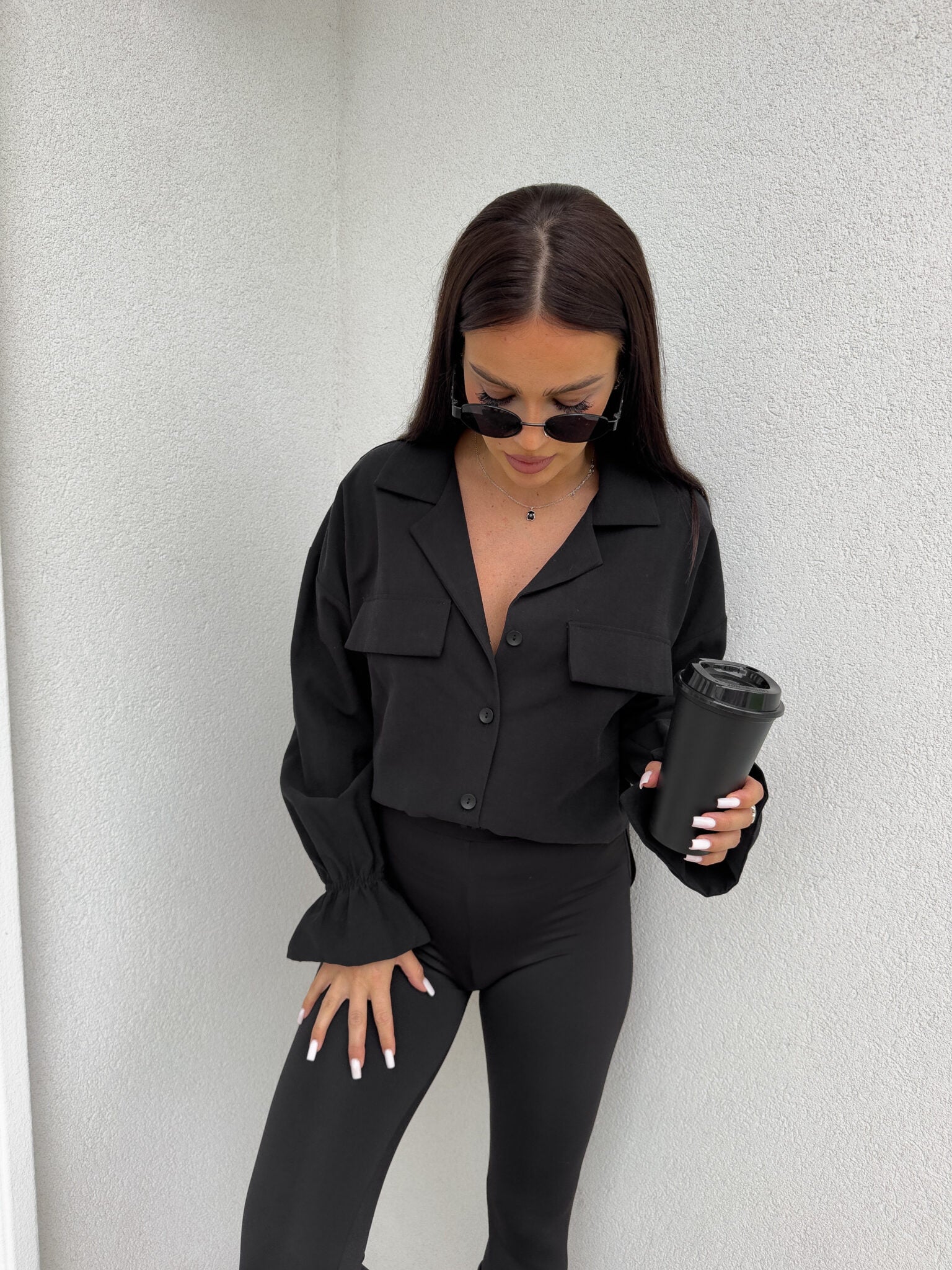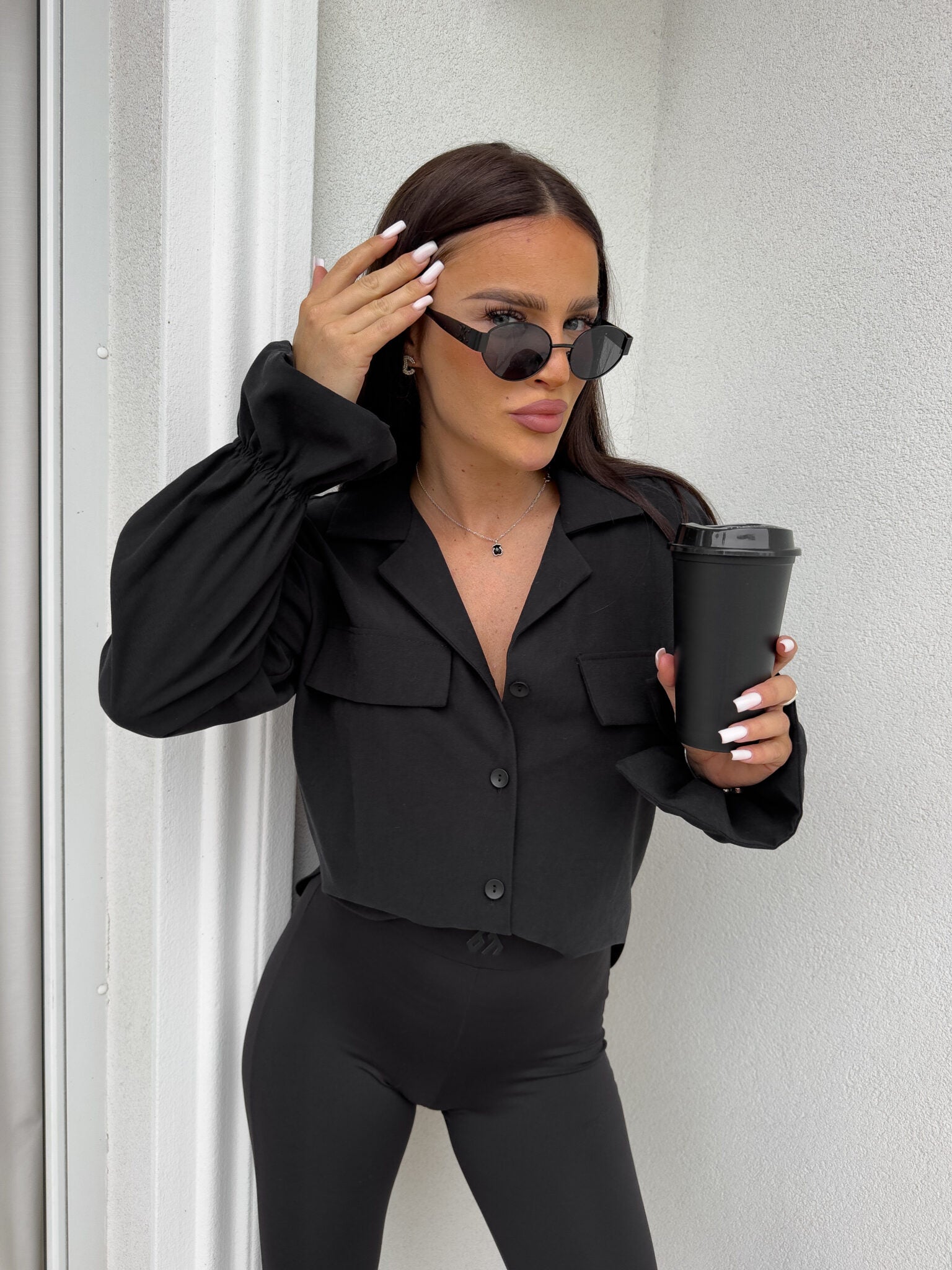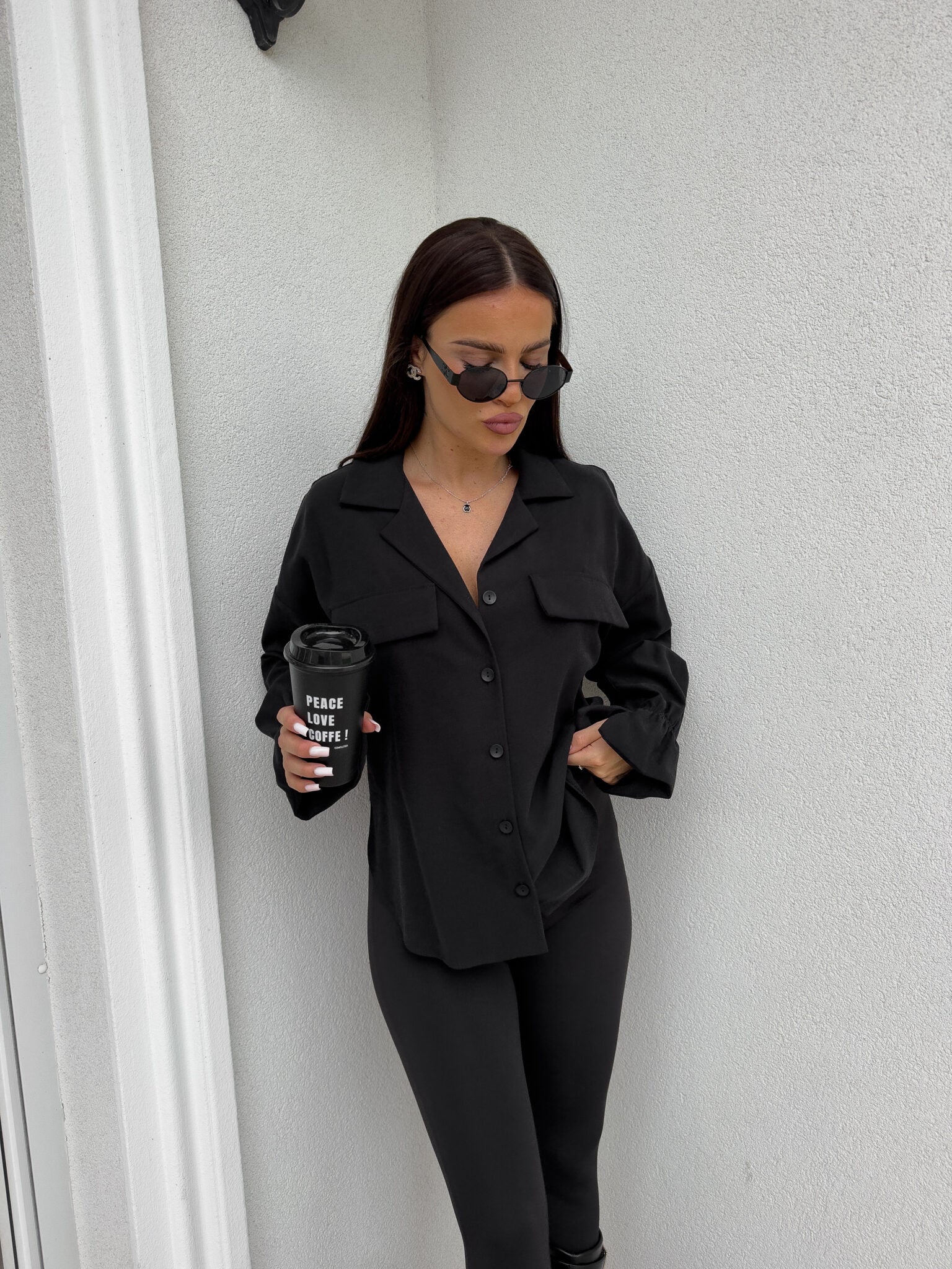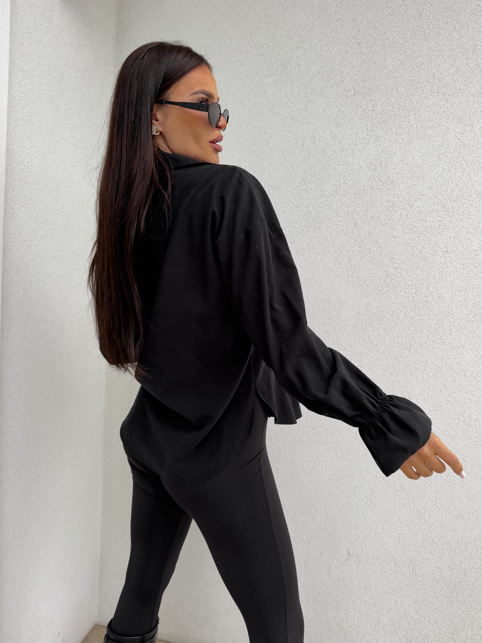Stilvolles Hemd mit lässigem Oversize-Schnitt, befestigt mit Knöpfen. Der klassische, umklappbare Kragen verleiht die ganze Eleganz, zwei symmetrische Taschen mit Klappen auf Brusthöhe. Lange Ärmel mit breiten Bündchen mit dekorativen Rüschen.