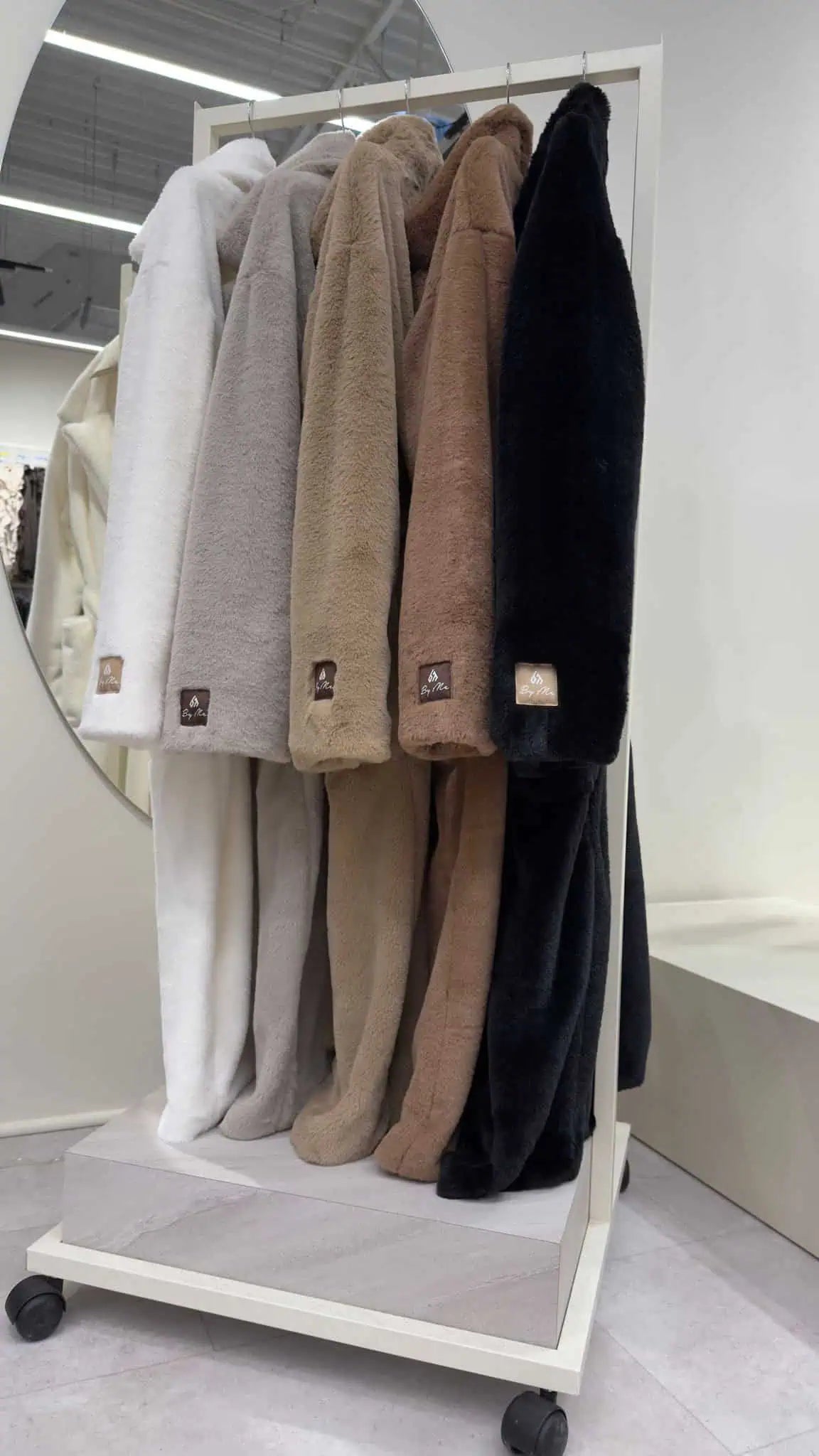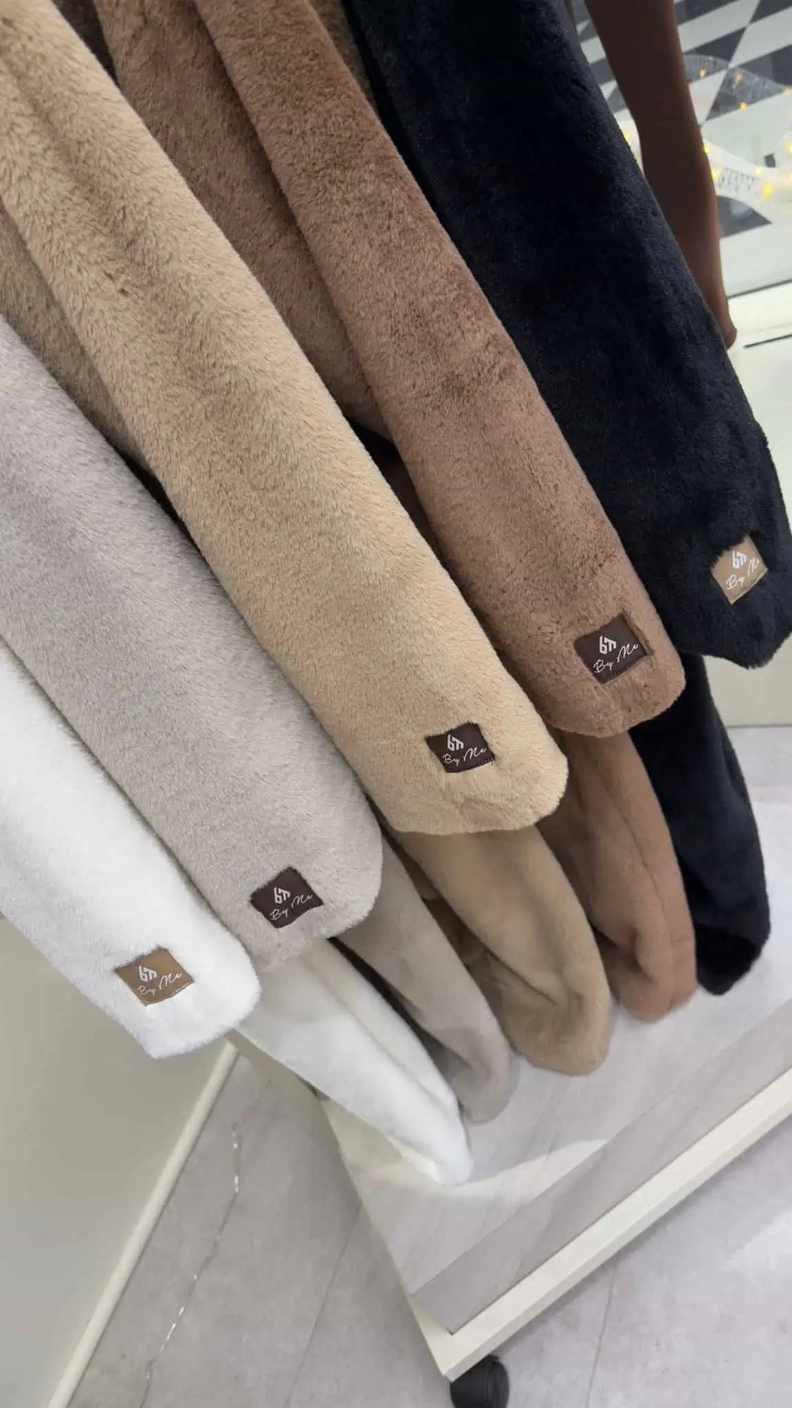 Warmer Wintermantel mit Futter, hat Taschen. Mit Knöpfen befestigt. Auf der linken Hülle befindet sich ein Aufnäher mit dem By Me-Logo in Braun.