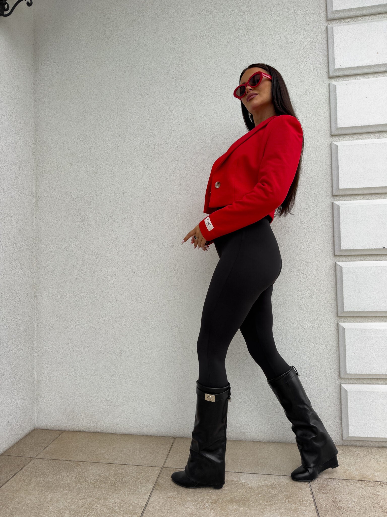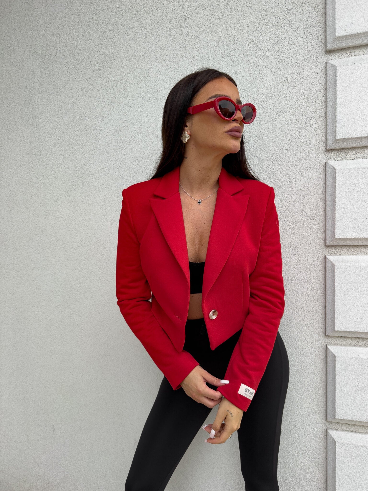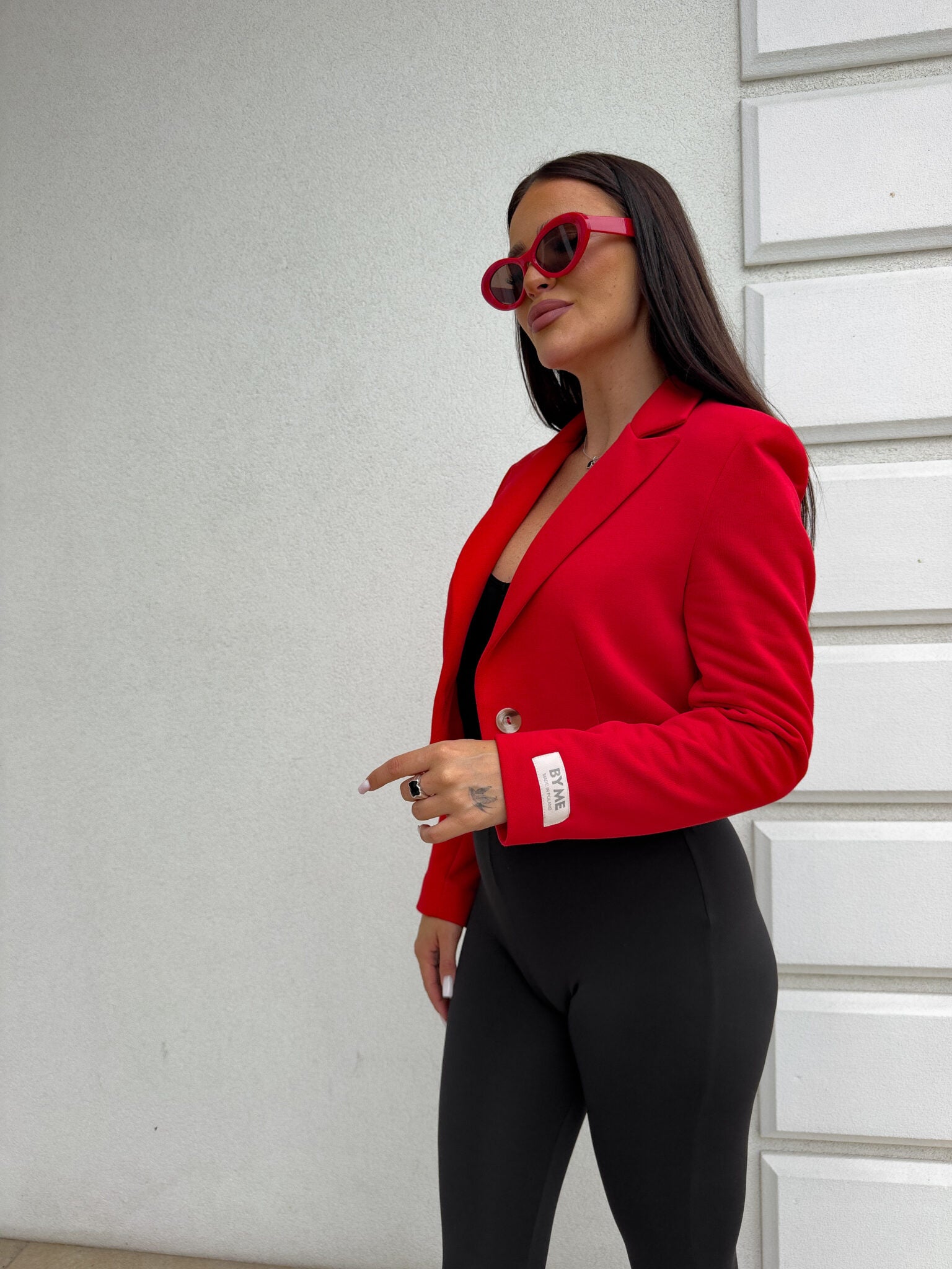 Kurz geschnittene Jacke, glattes Finish. Die Jacke hat ein Futter, einen Verschluss, der mit einem Knopf angepasst werden kann.