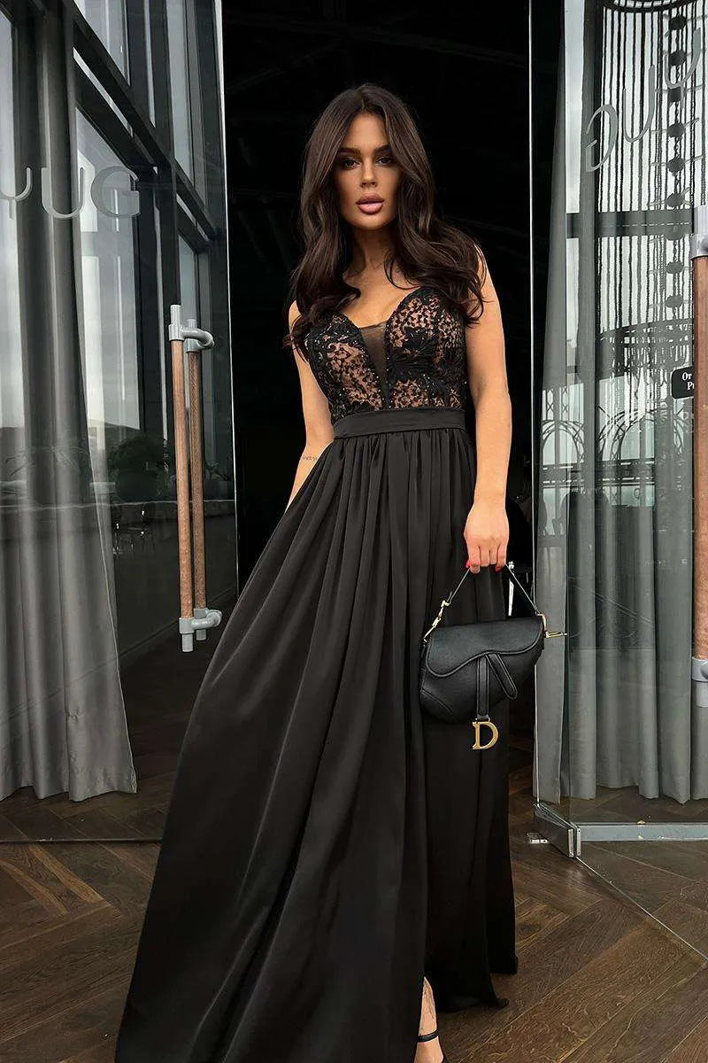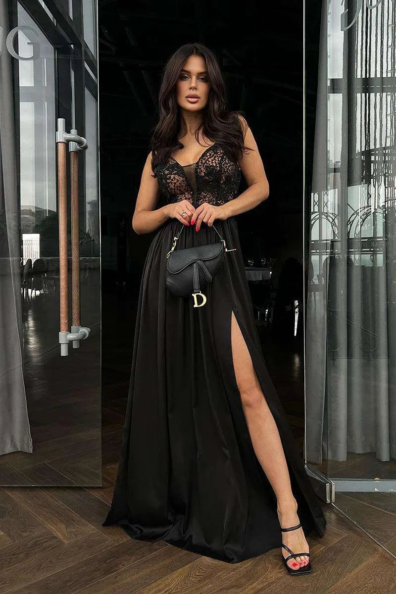 Lenges wunderschöne Abendkleid mit Glitzer und Spitze am Oberteil, das Rock aus Satin mit Schlitz.
