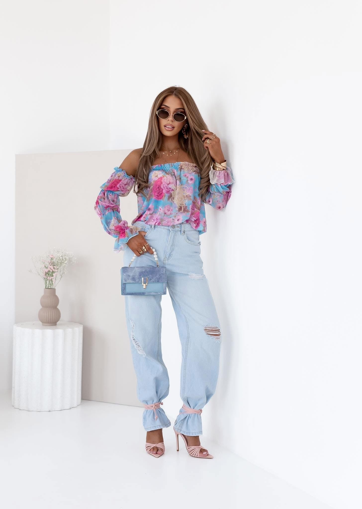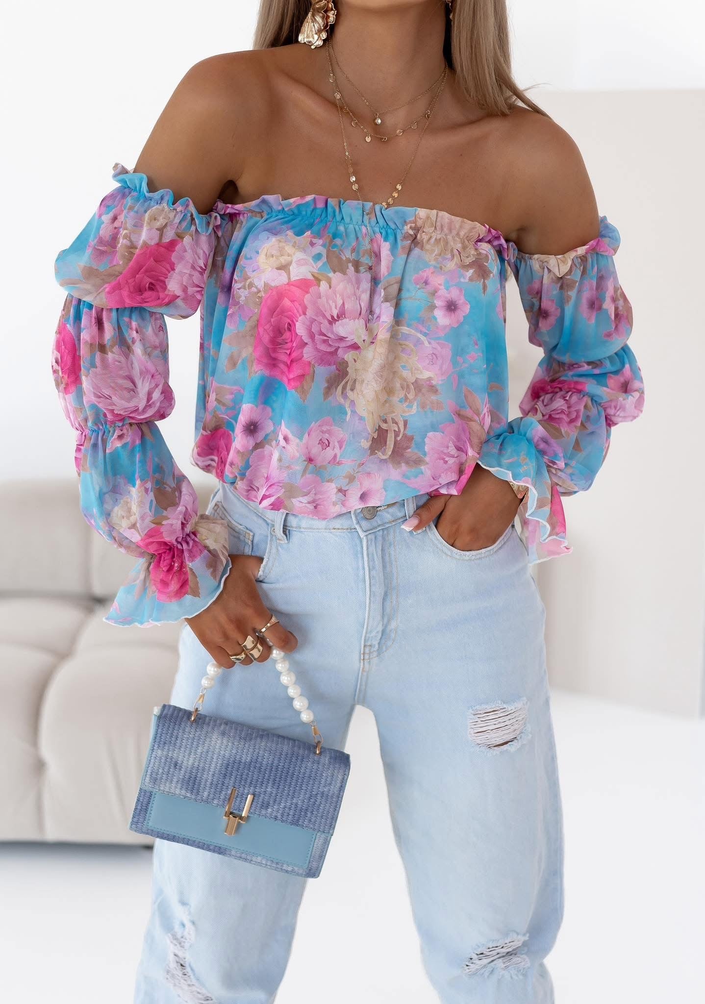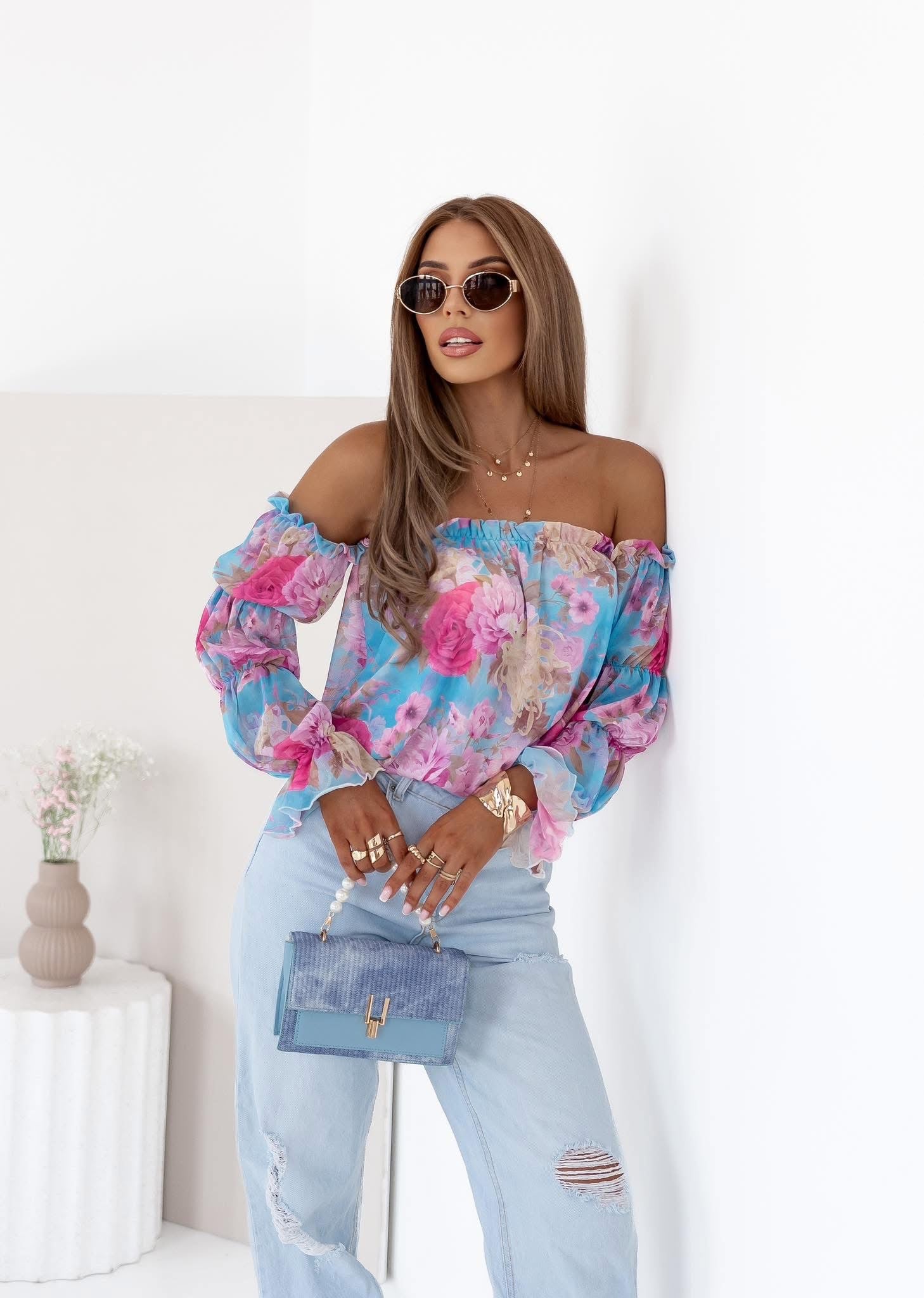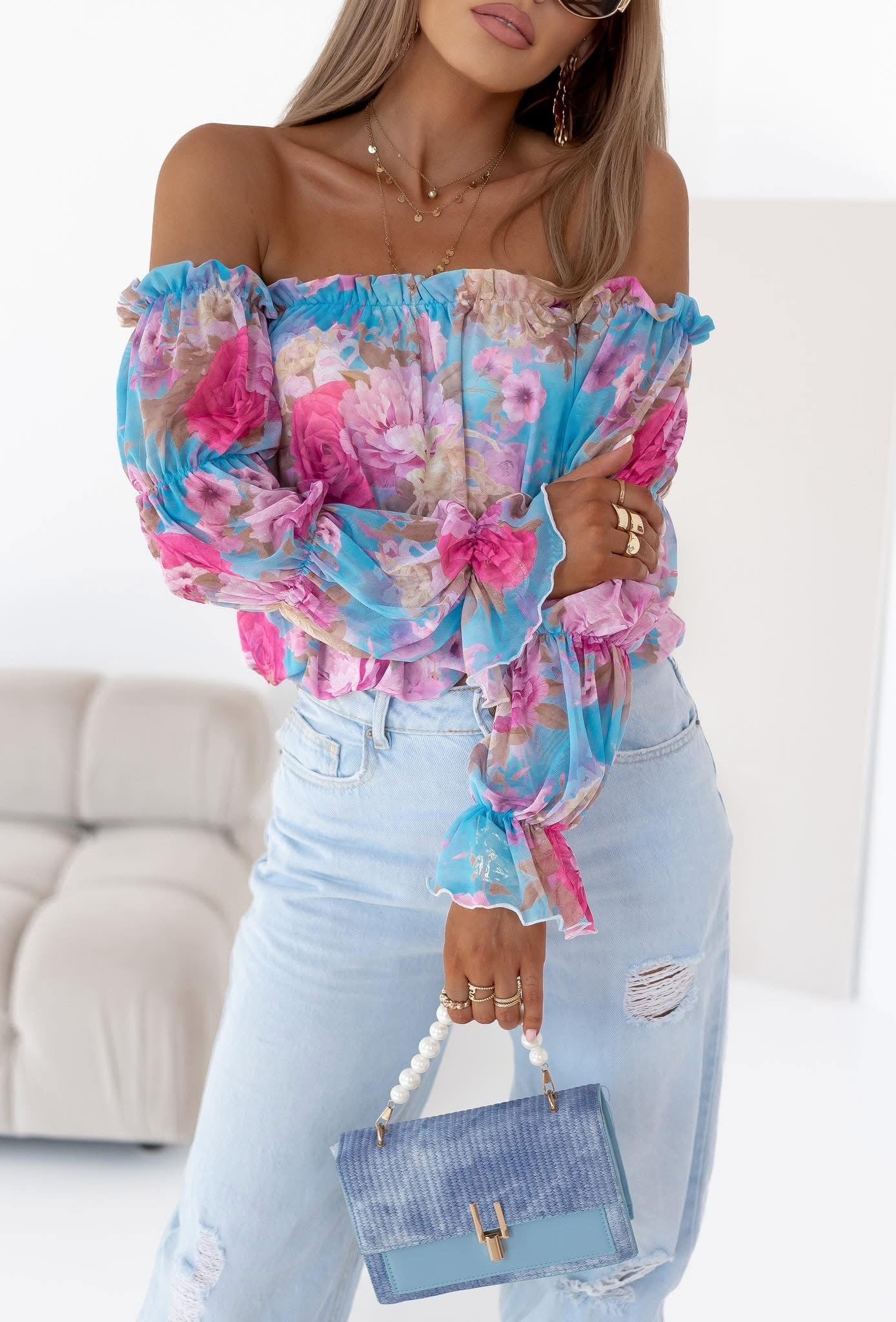 Eine klassische Bluse mit spanischem Schnitt, aus doppeltem Mesh-Material in schönen Blumenmustern.